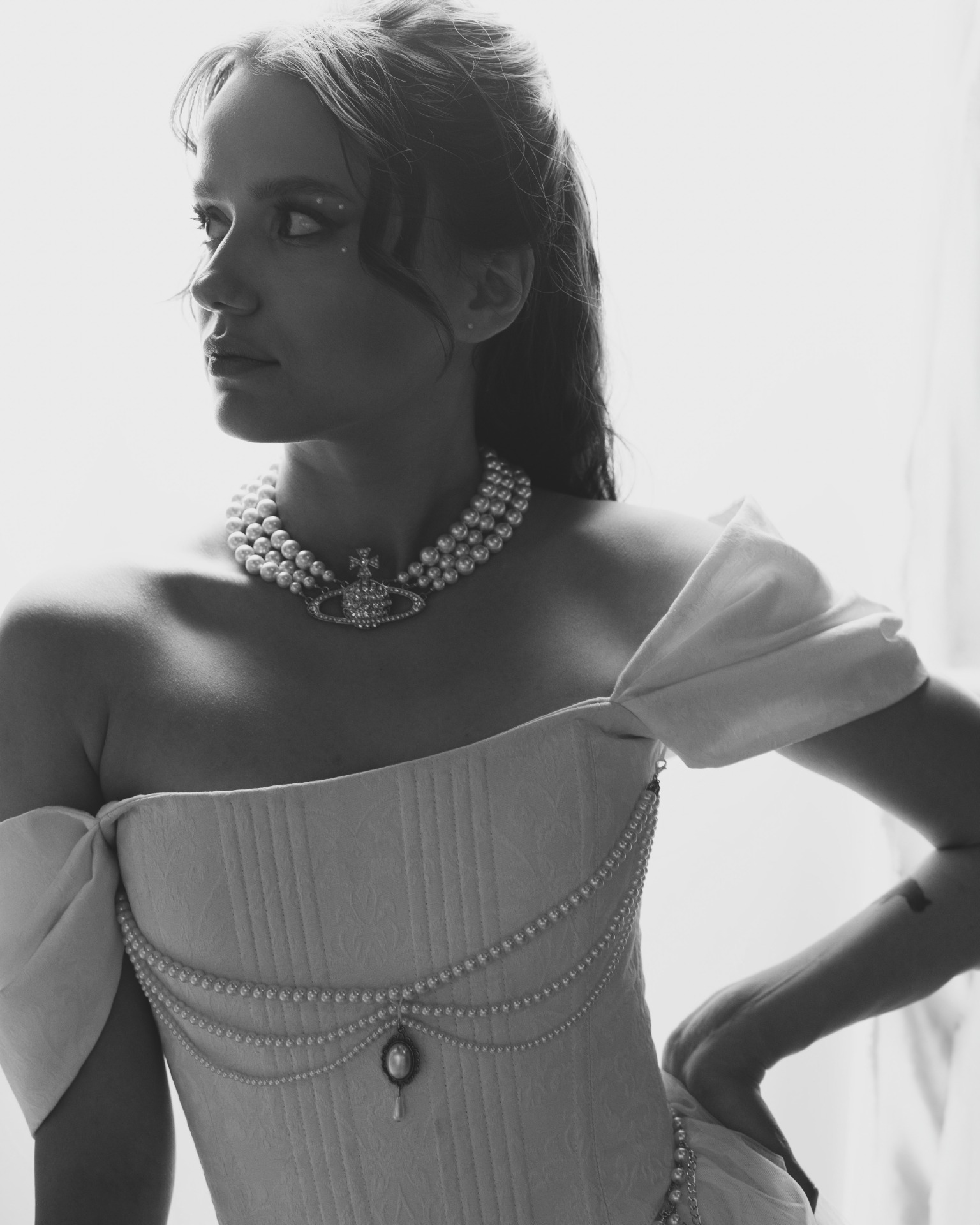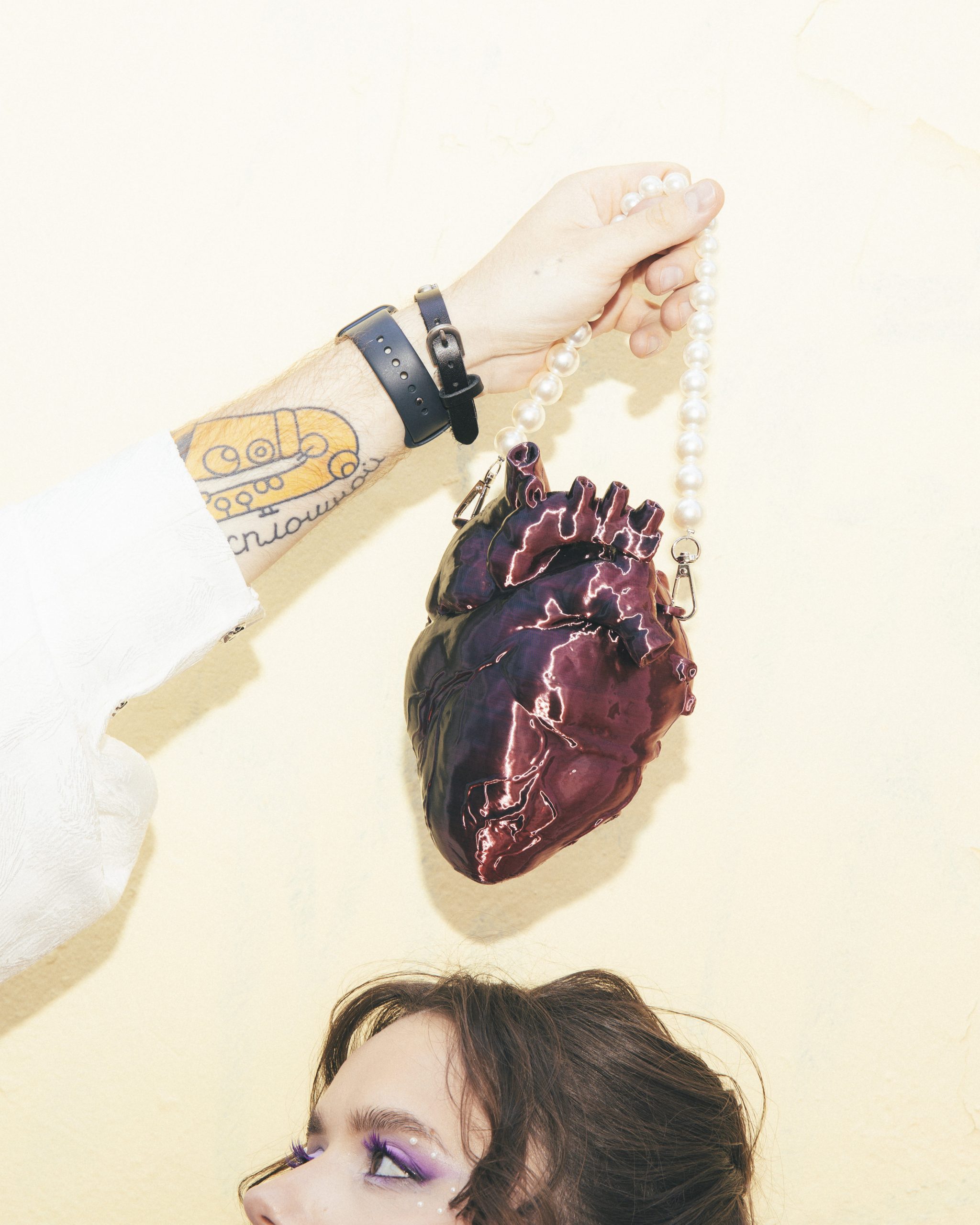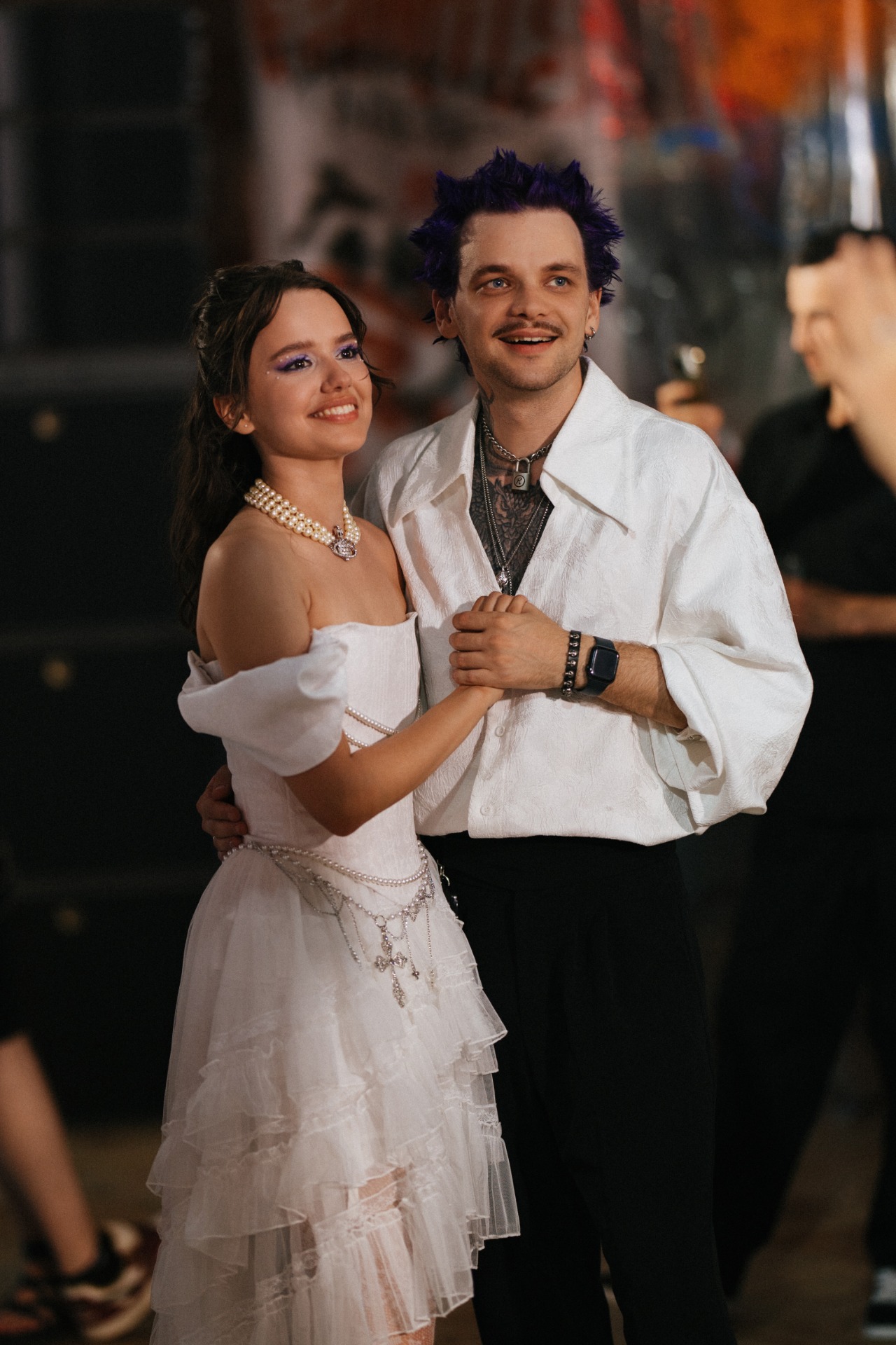 Мне изначально предлагали выбрать платье любого цвета, кроме белого, чтобы попасть в тематику. Но потом появилась Диана и услышала мои «молитвы» о том, что я хочу белое платье. Я была уверена, что и в этом цвете можно сделать настоящий панк-образ! Корсет и сумку в форме человеческого сердца мне сделали на заказ, колье от Vivienne Westwood мы нашли на Avito, а остальное — вещи с Wildberries и AliExpress.