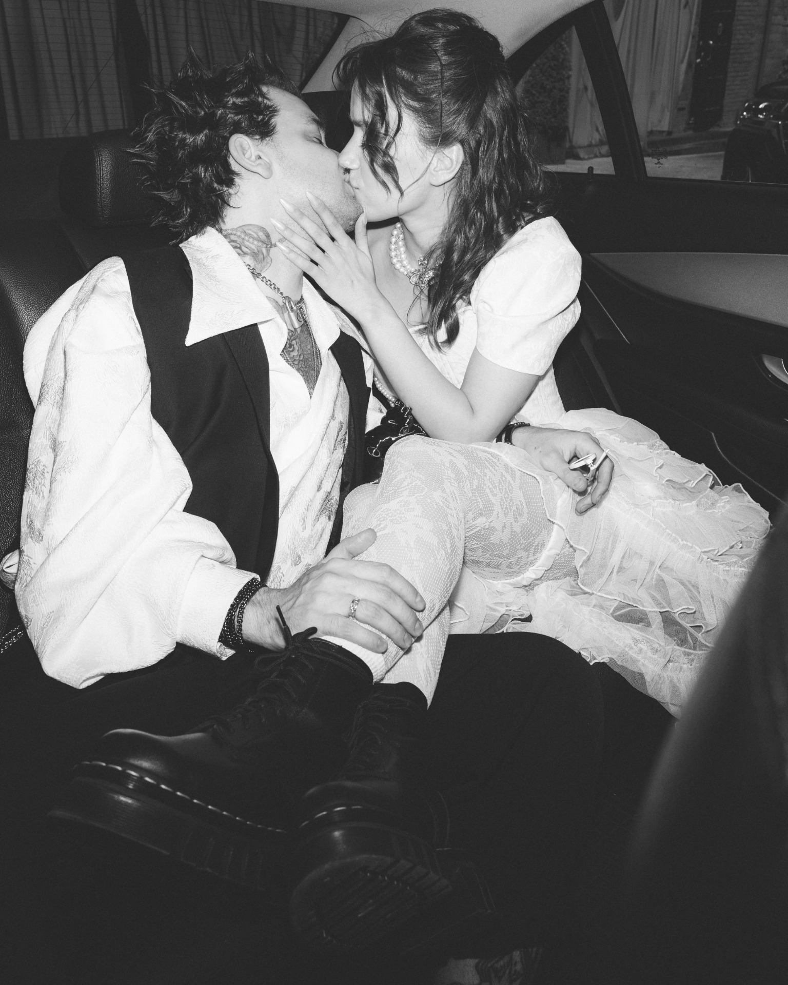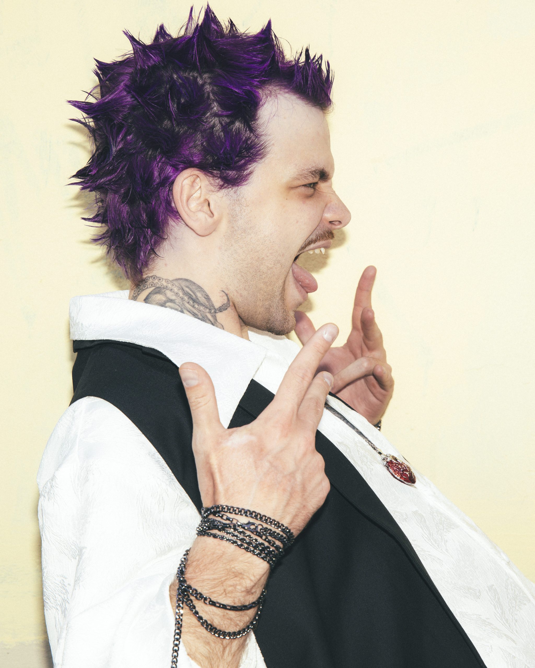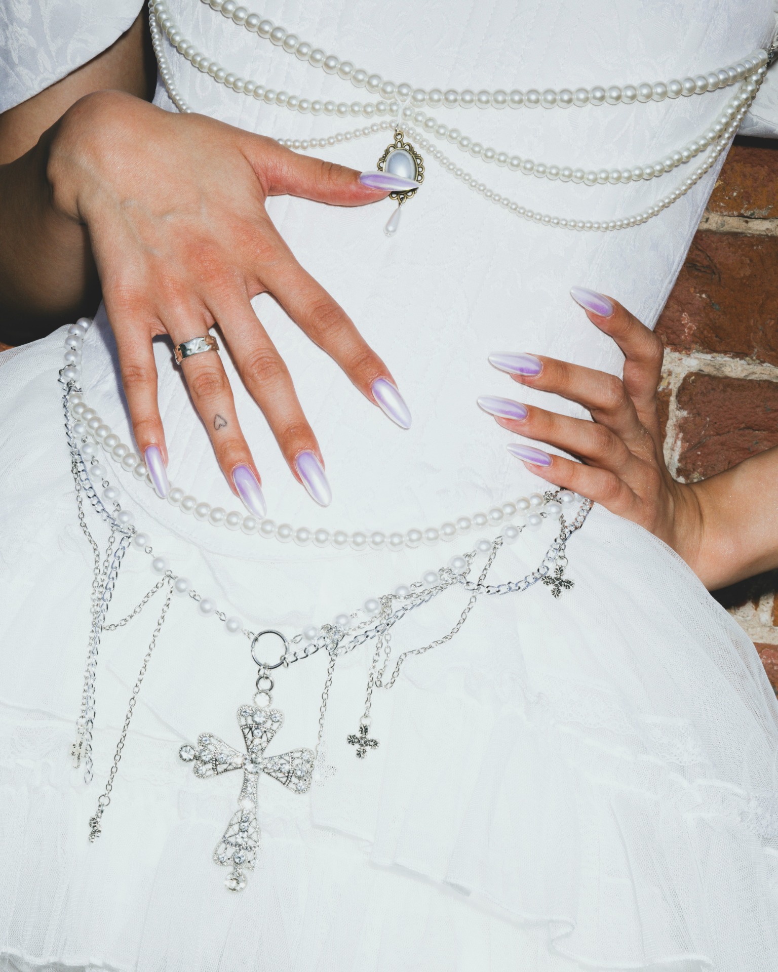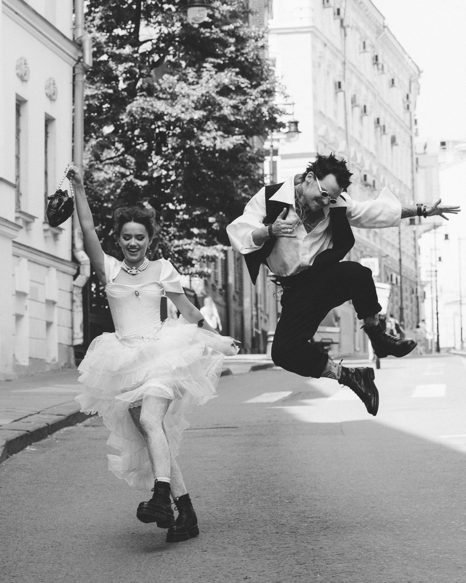 Мне изначально предлагали выбрать платье любого цвета, кроме белого, чтобы попасть в тематику. Но потом появилась Диана и услышала мои «молитвы» о том, что я хочу белое платье. Я была уверена, что и в этом цвете можно сделать настоящий панк-образ! Корсет и сумку в форме человеческого сердца мне сделали на заказ, колье от Vivienne Westwood мы нашли на Avito, а остальное — вещи с Wildberries и AliExpress.