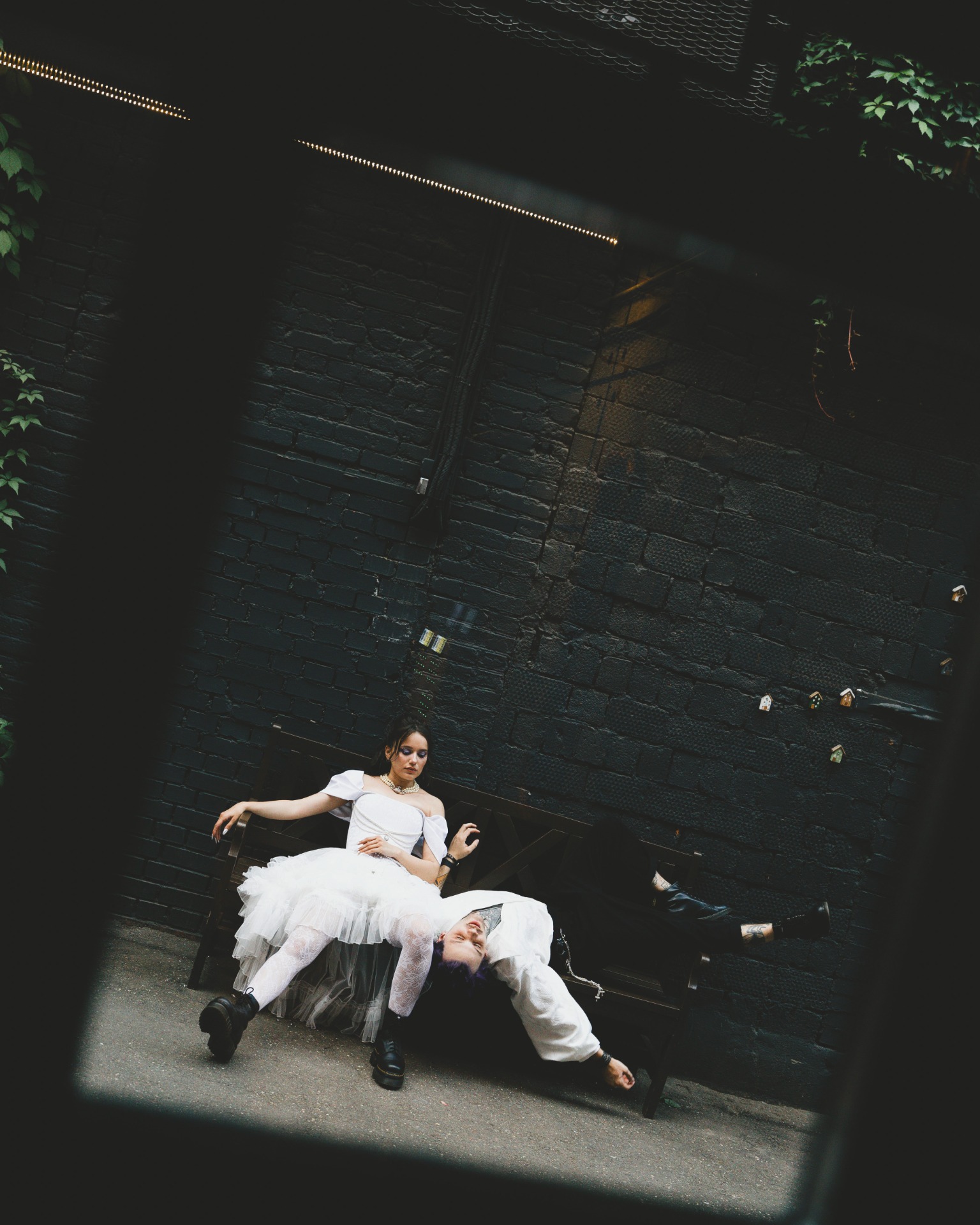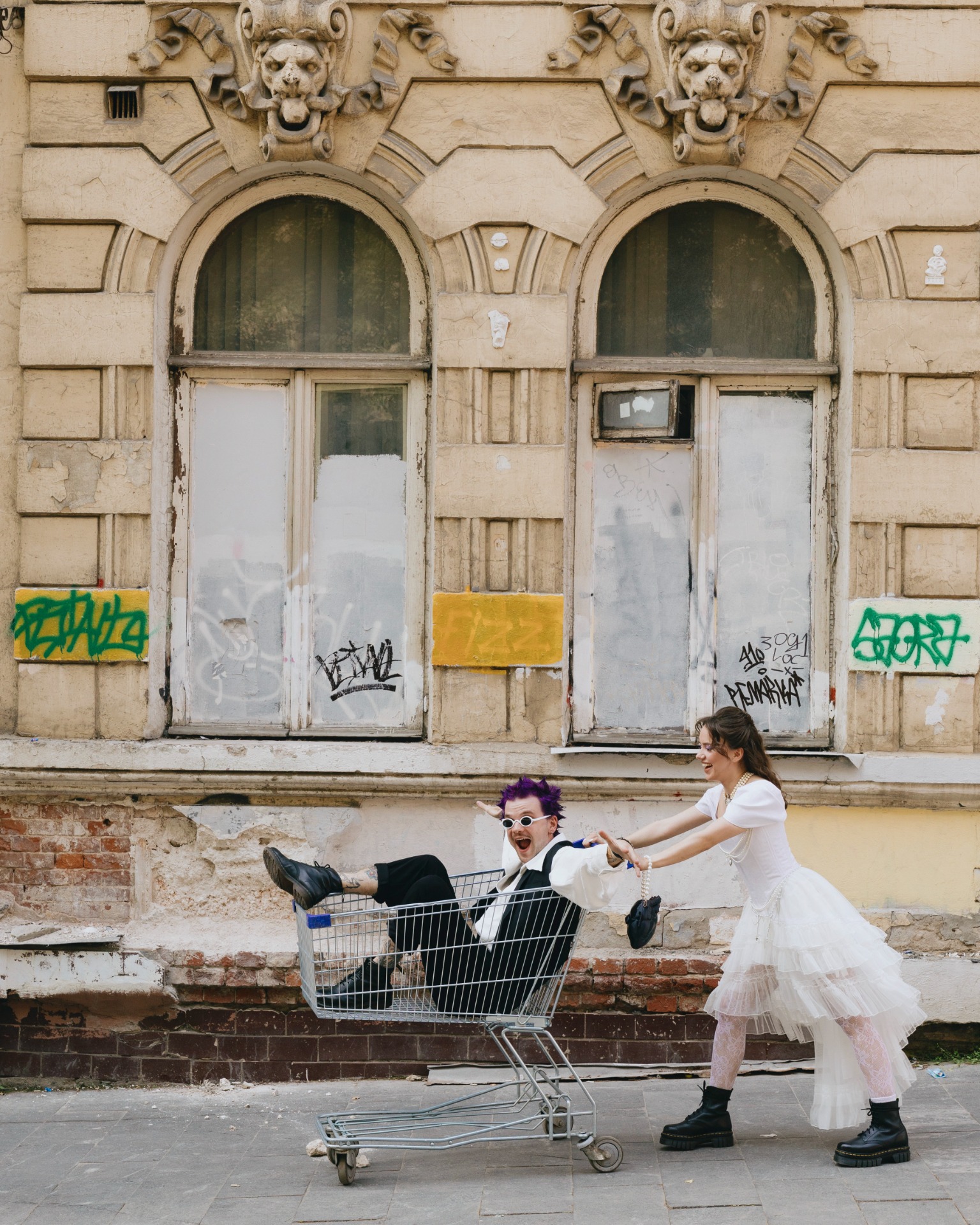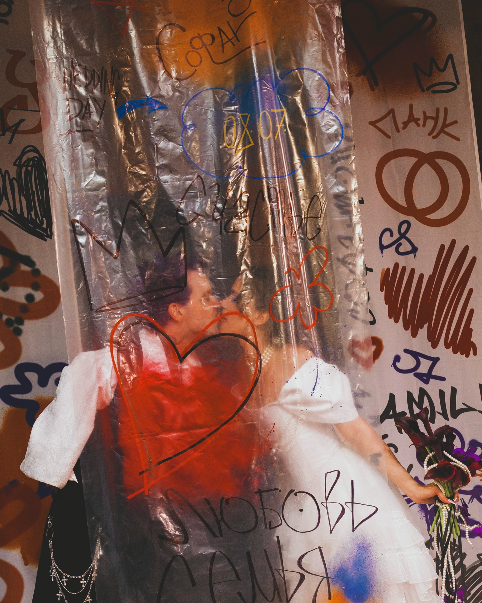 Очень запомнилась съёмка до торжества. Юля фотографировала нас на Китай-городе — локация была идеальной! На месте нас встретила тележка из магазина и стены с постерами и граффити. Это было вау! Ни одна фотостудия не смогла бы так точно передать наш стиль, как этот район.