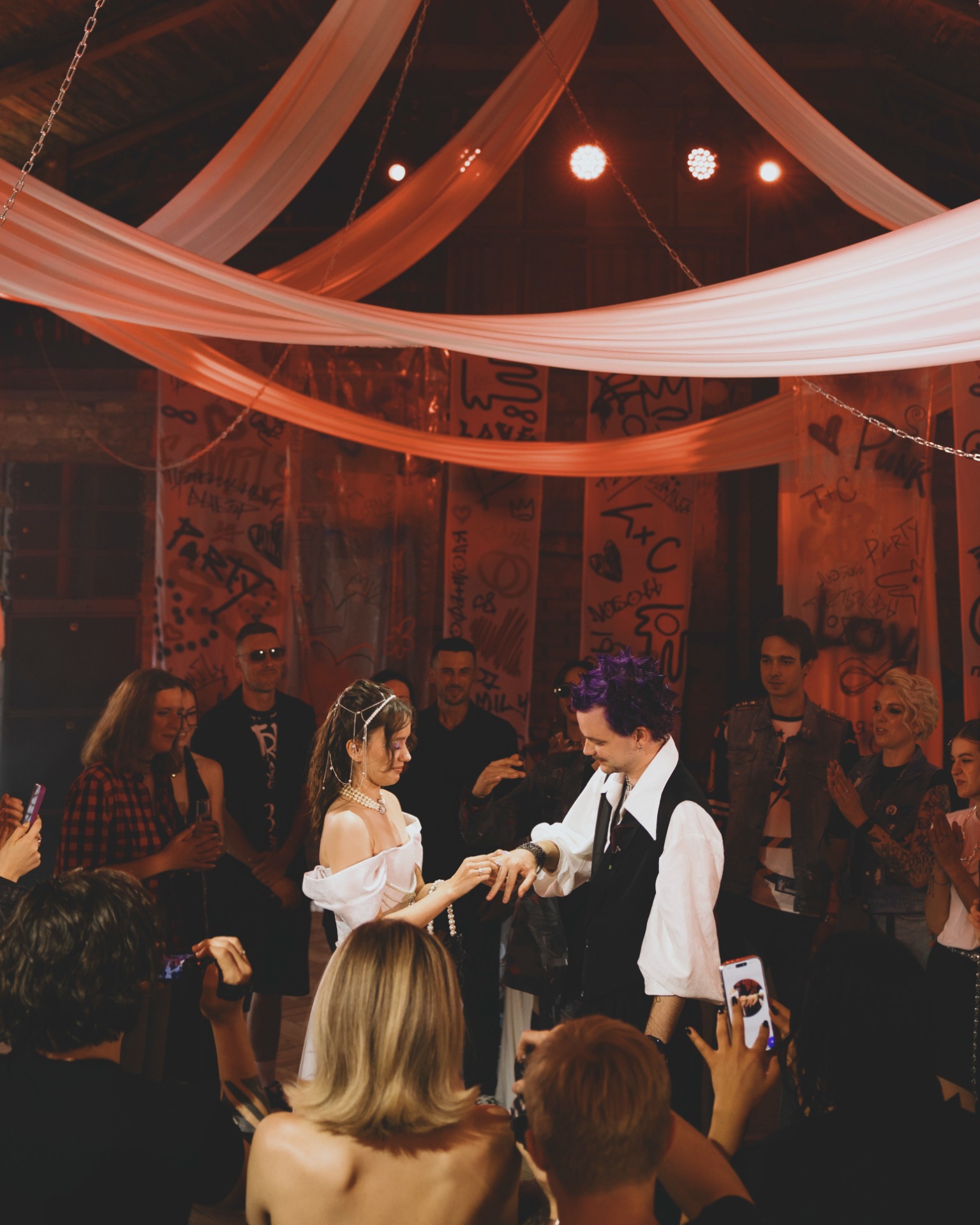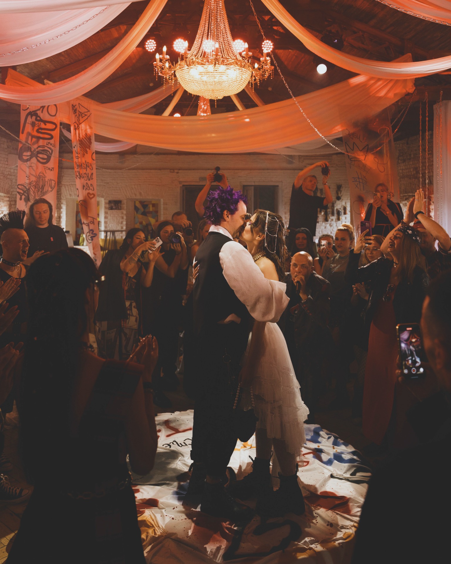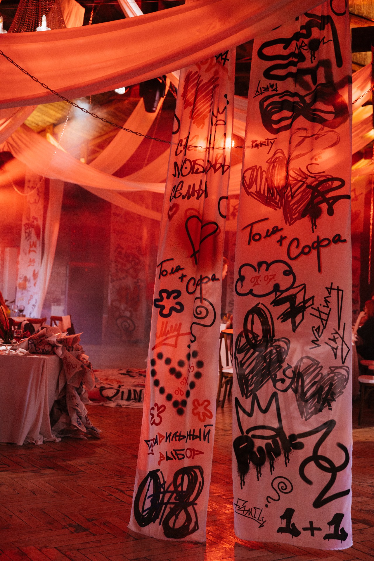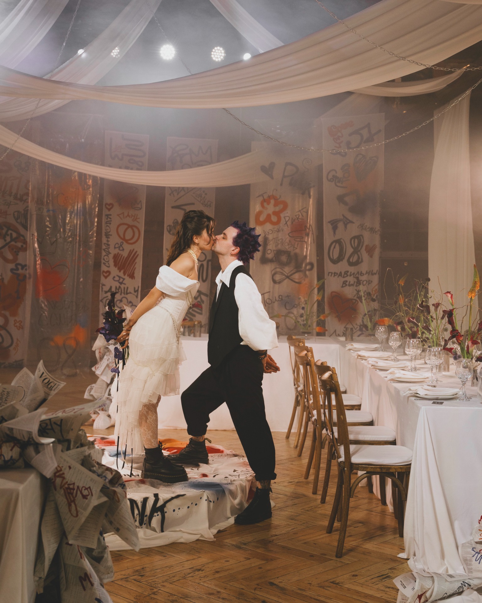 Если опустить детали, то готовиться мы начали в апреле 2025 года, а праздник состоялся 8 июля. В январе мы очень быстро решили, что будем делать панк-свадьбу, и буквально за час придумали декор, а в апреле уже вместе с организатором начали воплощать наши идеи в жизнь.