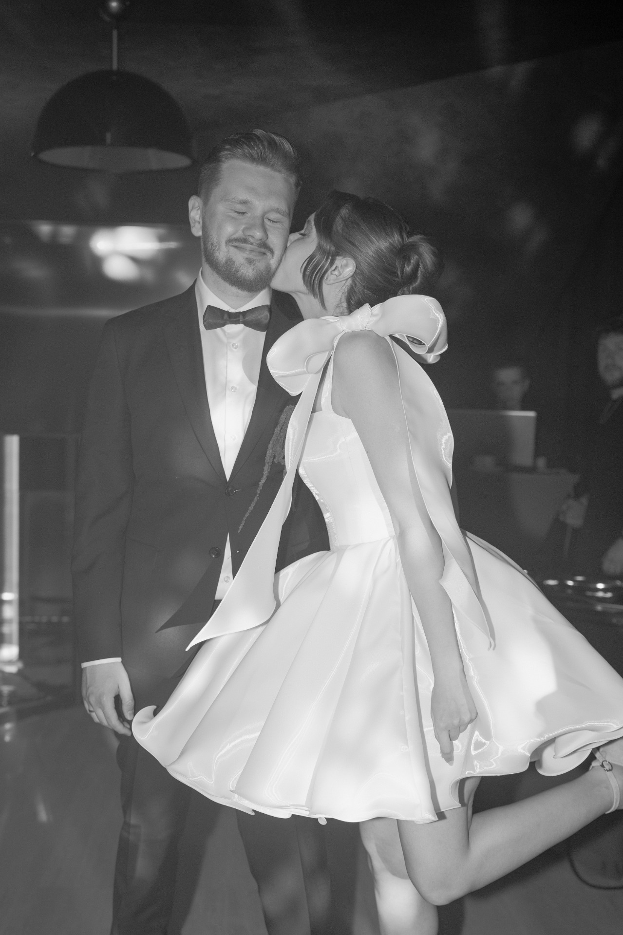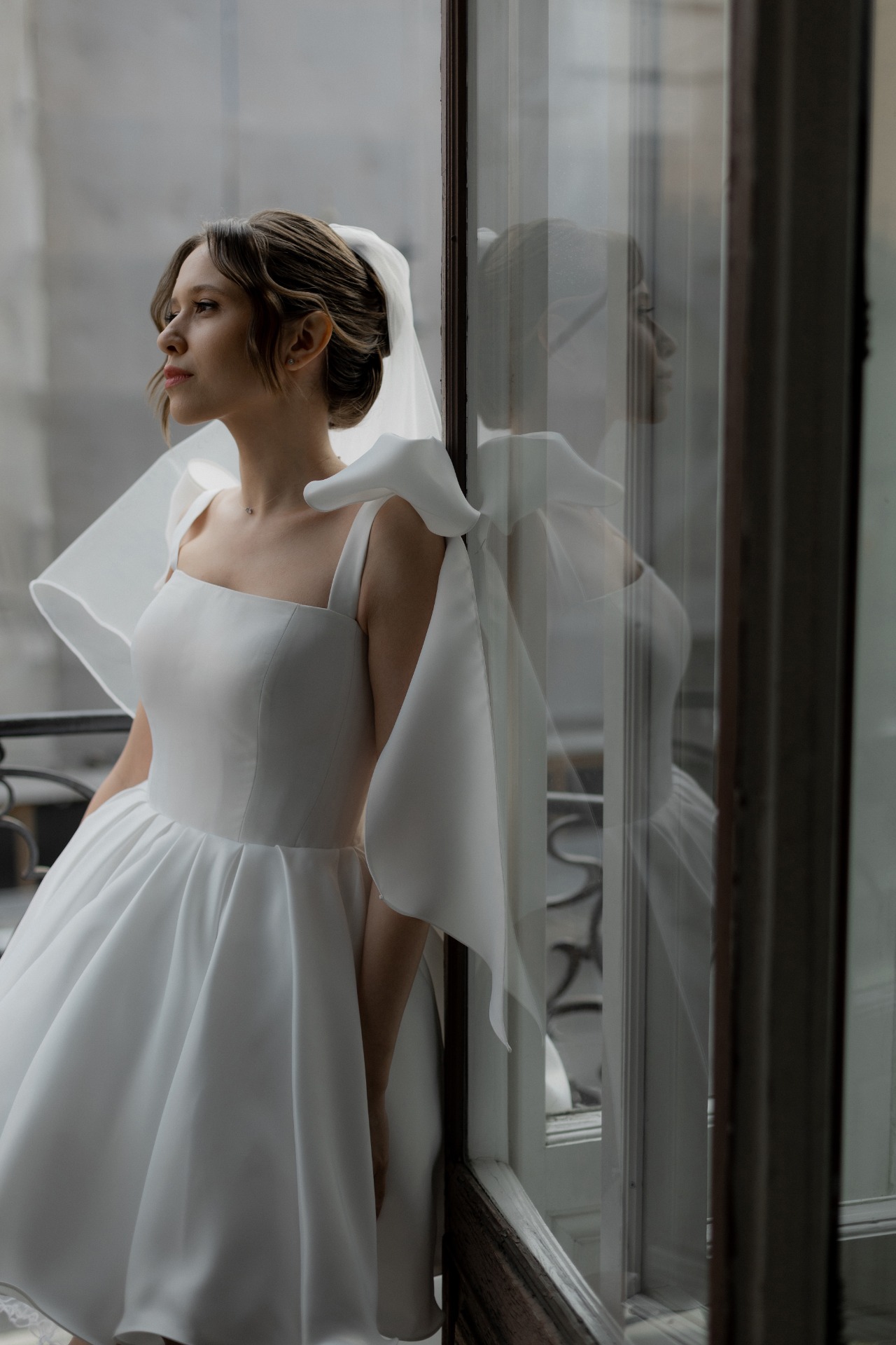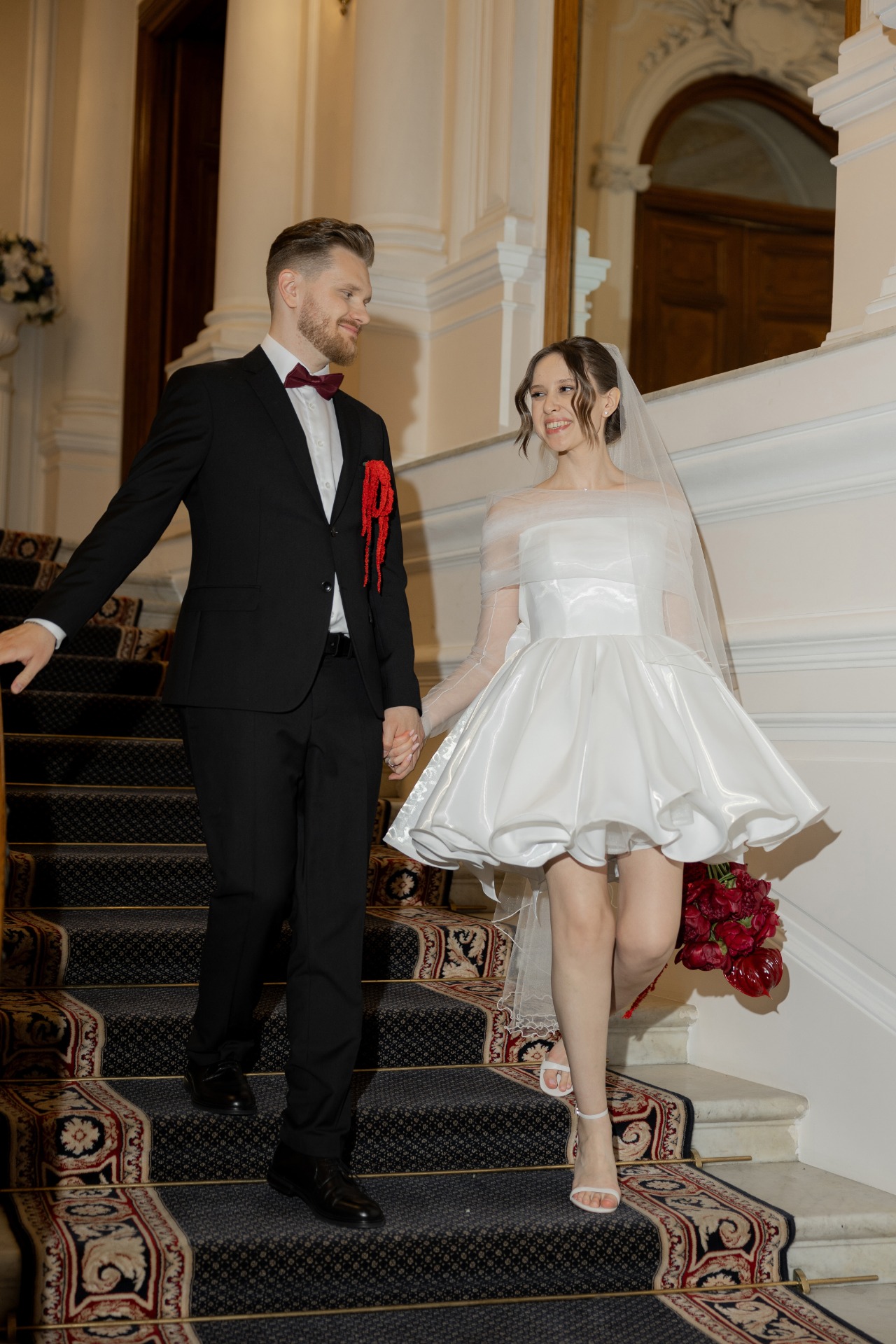 У меня никогда не было чёткой картины своего образа невесты, поэтому я формировала его в течение всей подготовки. Я хотела выглядеть на своей свадьбе естественно и оставаться собой. При этом для меня было важно, чтобы наряд был не только красивым, но и удобным. Я остановила свой выбор на коротком платье, потому что оно отлично отражало меня и мой стиль. Кроме того, я не хотела весь день следить за подолом и носить тяжёлую юбку.