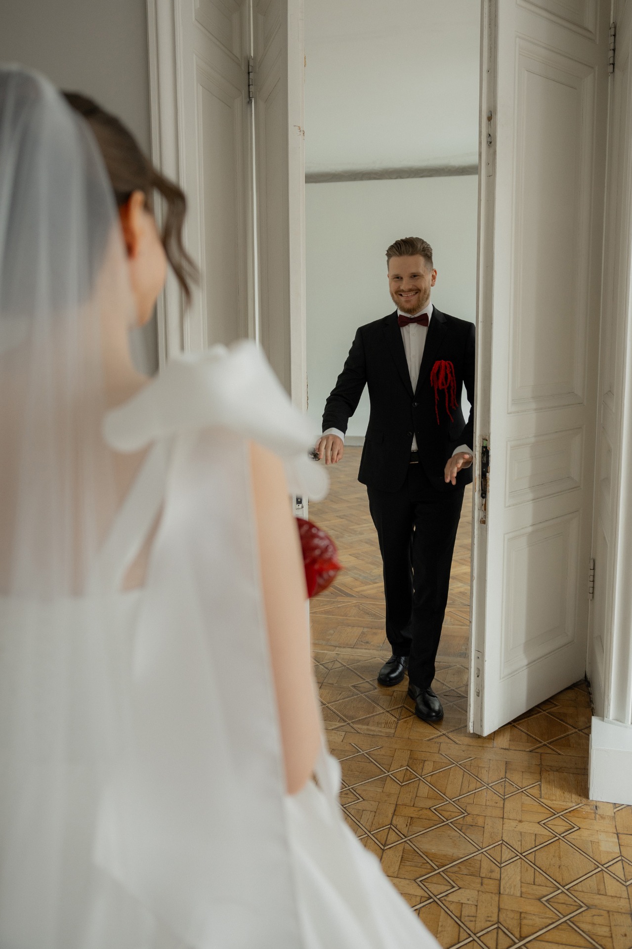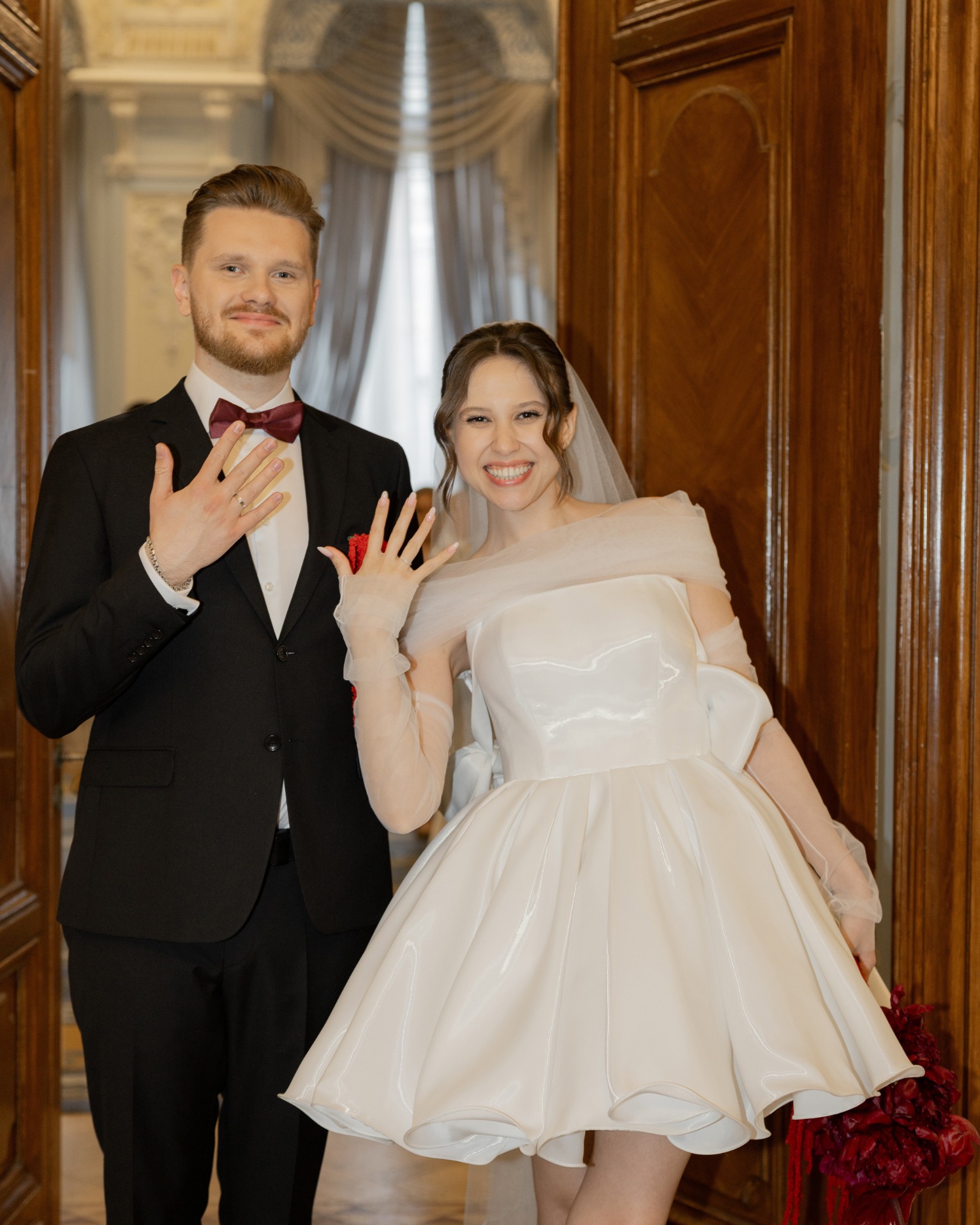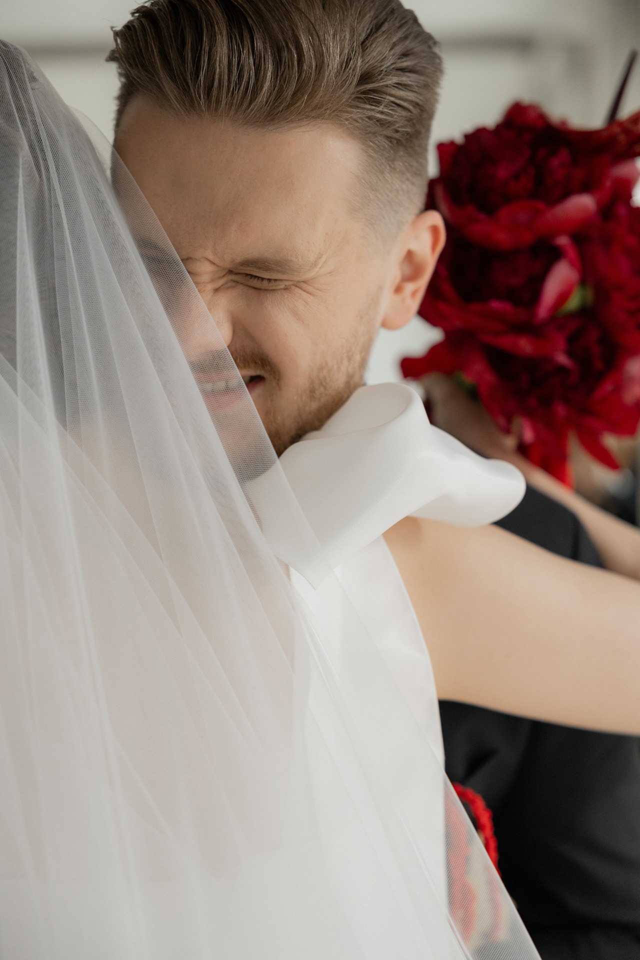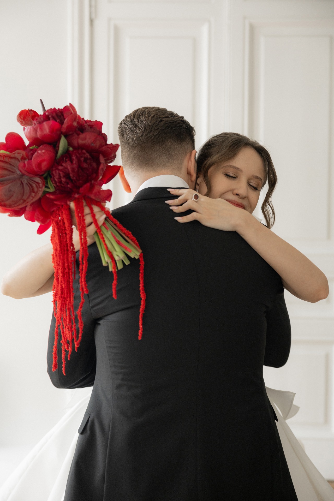 После того как сборы были завершены, я попросила включить нам песню Бруно Марса «Marry You», а мы с Димой встали по разные стороны дверей. Это был самый волнительный и долгожданный момент: он открыл дверь, увидел меня — и вот мы уже идём друг к другу, смеёмся и обнимаемся. Волнение улетучилось сразу после того, как я увидела Диму, и весь оставшийся день прошёл очень легко.
