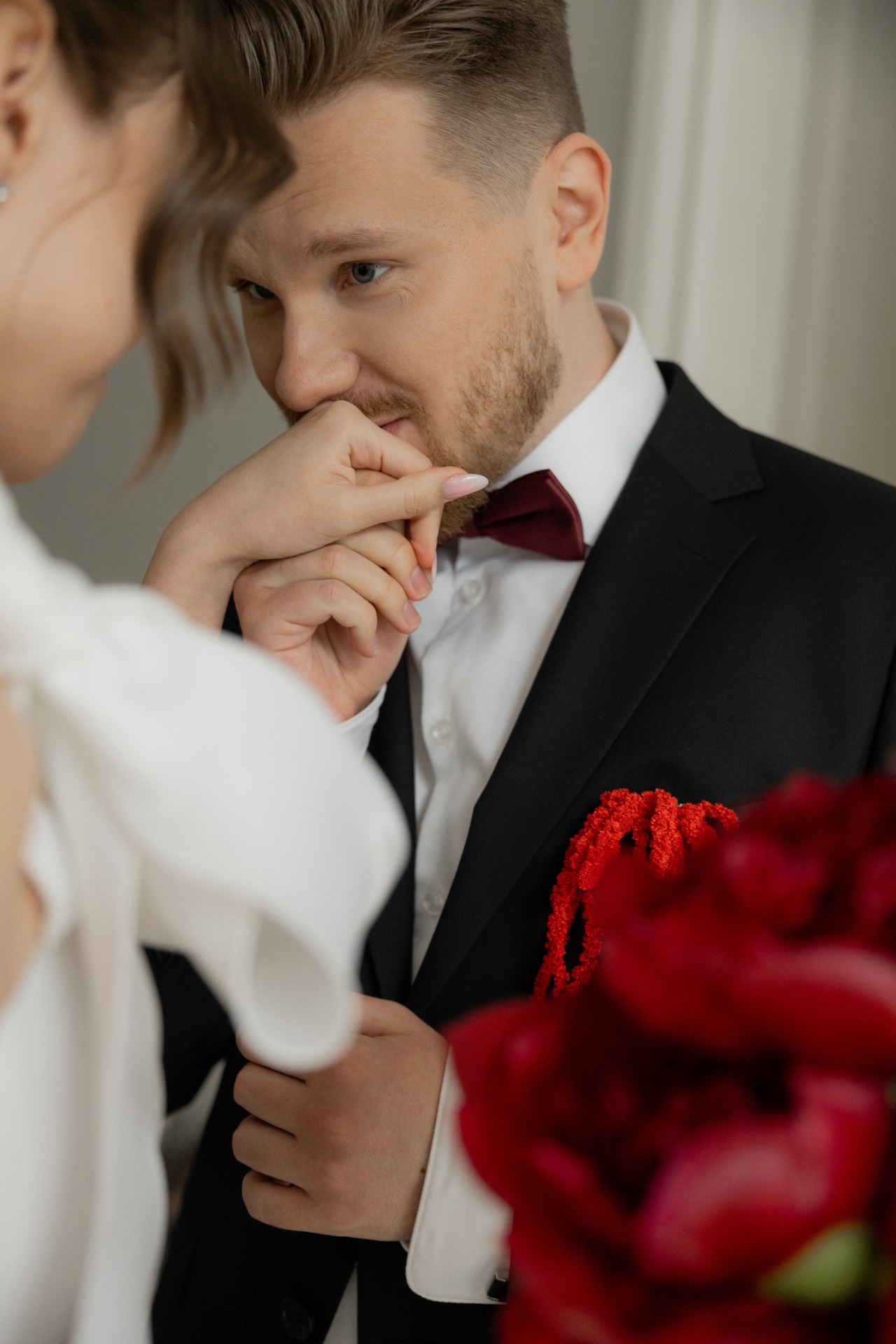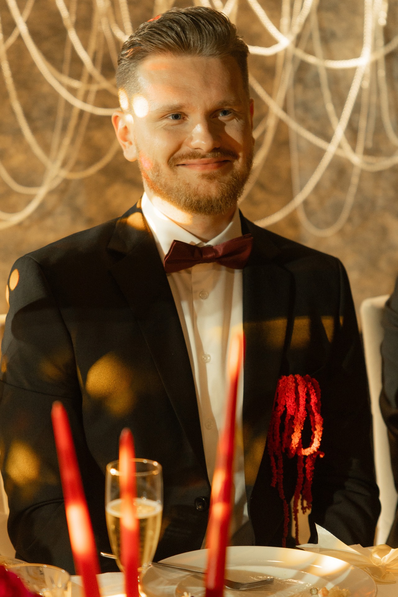 Дима с самого начала хотел выбрать классический чёрный костюм с приталенным пиджаком. В качестве детали он решил добавить бабочку в цвет свадебного декора. С бутоньеркой для Димы возникла небольшая трудность, потому что все цветы в нашем оформлении были довольно крупными. Но декораторам из Unio decor удалось сделать очень красивую брошь из амаранта. В итоге у Димы получился классический образ с тонкими акцентами в цветовой гамме свадьбы.