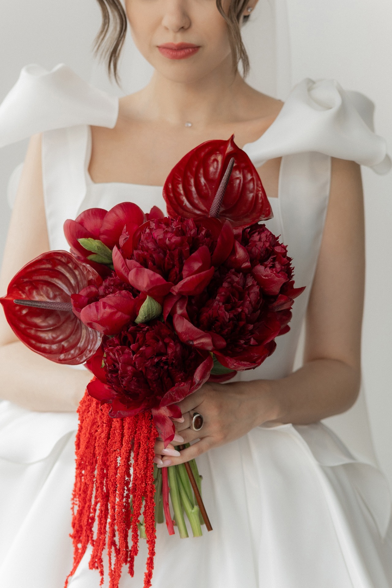 Акцент в моём образе создал каскадный букет в бордовых тонах, собранный из пионов, гигантских антуриумов и амаранта.