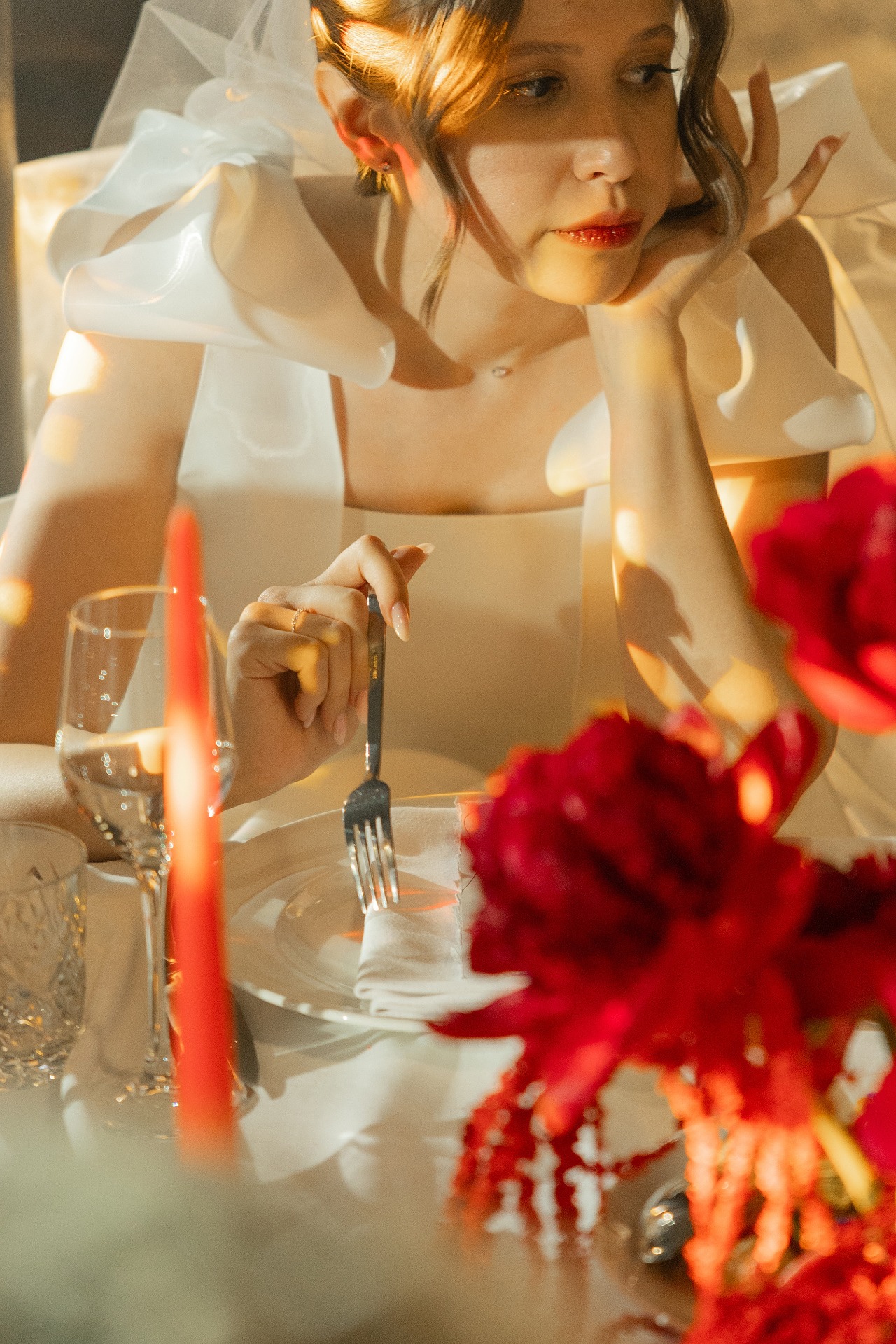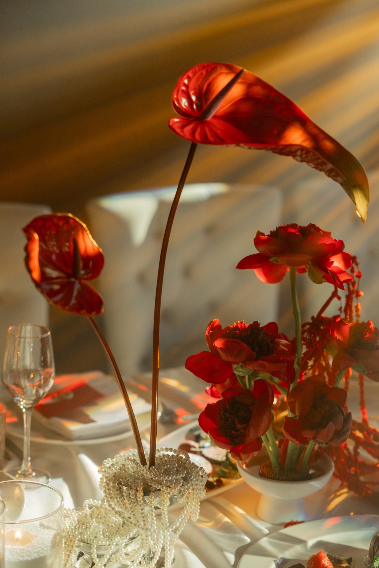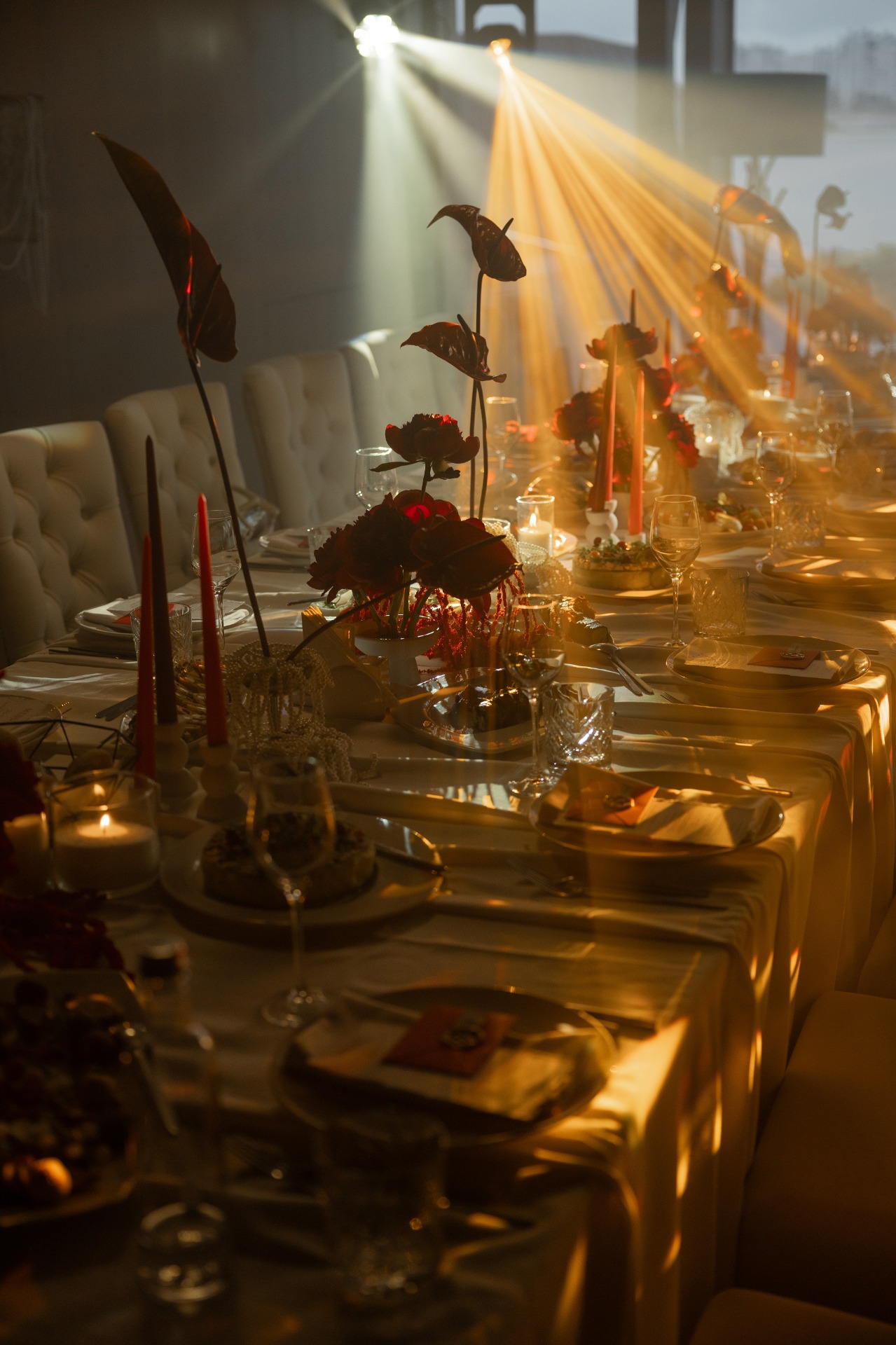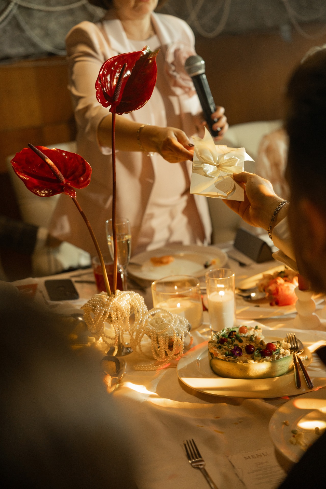 Изначально мы планировали скромный праздник с самыми близкими людьми и рассматривали классическое оформление и площадки. Но в какой-то момент я увидела пост с подборкой свадеб в красных оттенках. Мы поняли, что нам хочется чего-то уникального, не банального, но при этом понятного и красивого. Мне пришла идея соединить бордовый цвет, жемчуг и свечи. Когда я изложила свою концепцию декораторам, они её поддержали, и мы начали собирать референсы. Такое сочетание сложно было найти в интернете, поэтому мы сами продумывали и обсуждали каждую деталь. Особенно впечатлили меня цветы: команде Unio decor удалось достать для нас невероятные бордовые пионы и крупные антуриумы. Они стали потрясающим акцентом в декоре.