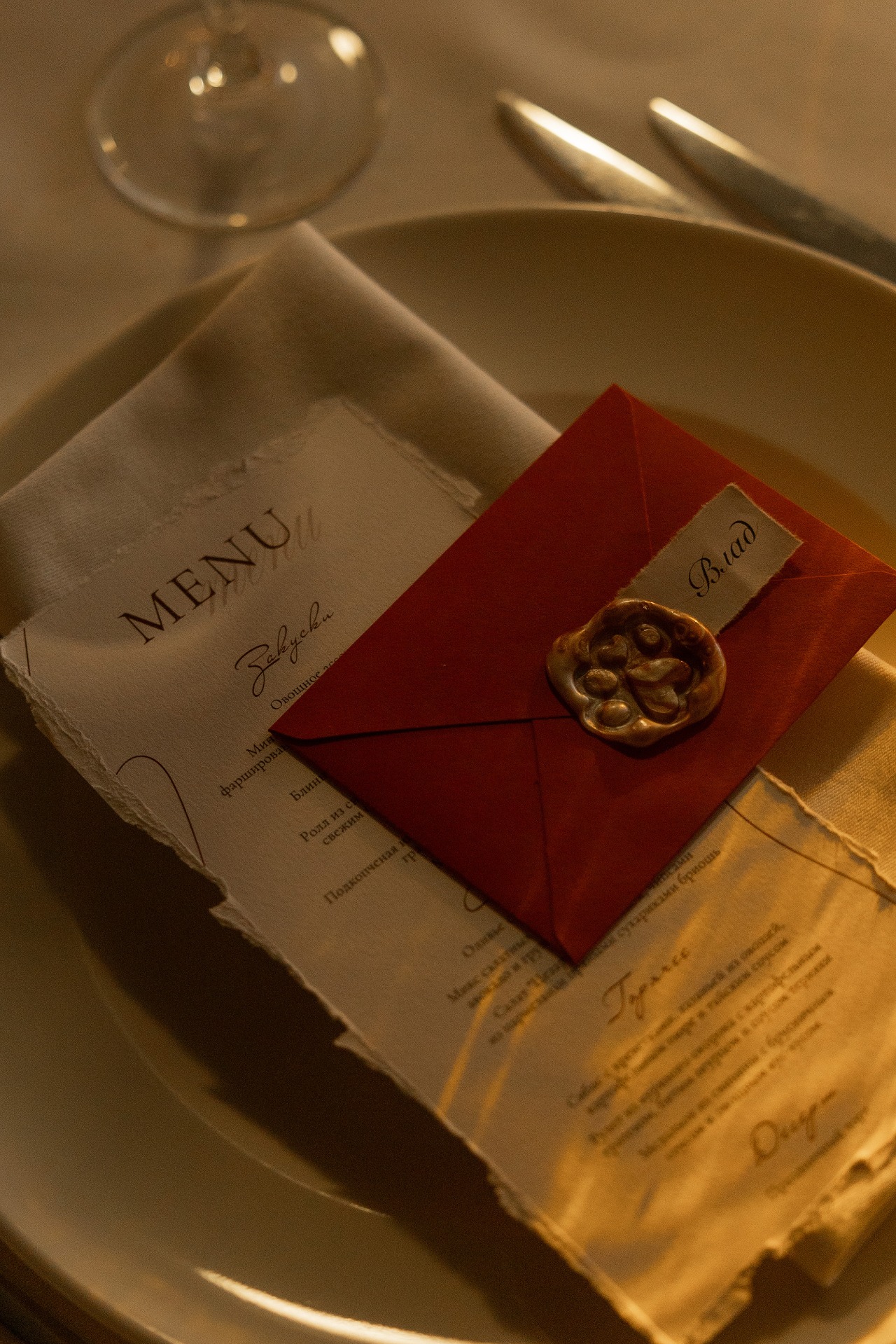 Из нестандартных деталей: мы сделали карточки рассадки своими руками. Я оформила мини-конвертики с именами гостей, а внутри вложила небольшие открытки с тёплыми словами от нас.