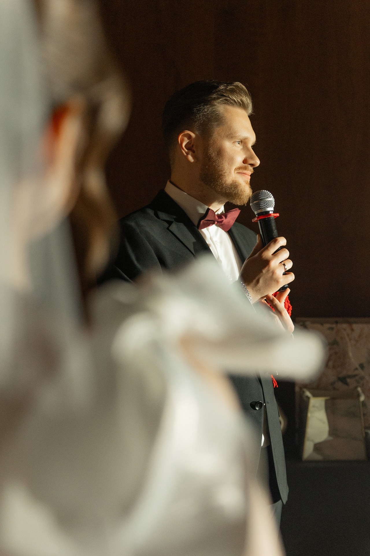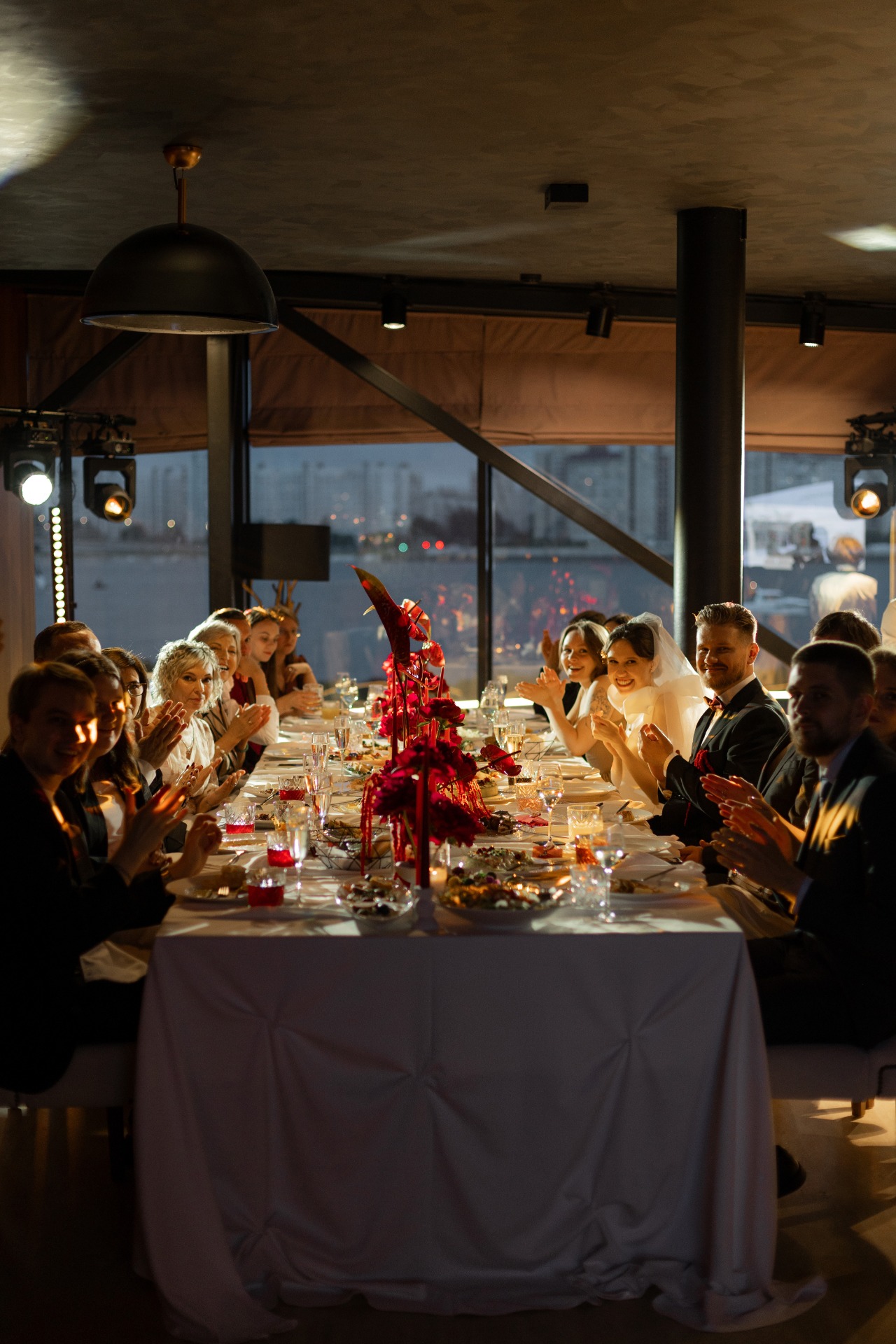 Наш план свадьбы был нестандартным: сборы начались в 13:00 в фотостудии, а роспись в ЗАГСе была назначена на 19:20. Праздничный ужин начинался в 21:00, и нам нужно было уместить всю программу свадьбы в три часа. Ведущий провёл для нас по-настоящему тёплый, семейный вечер, и все гости остались в восторге от праздника.