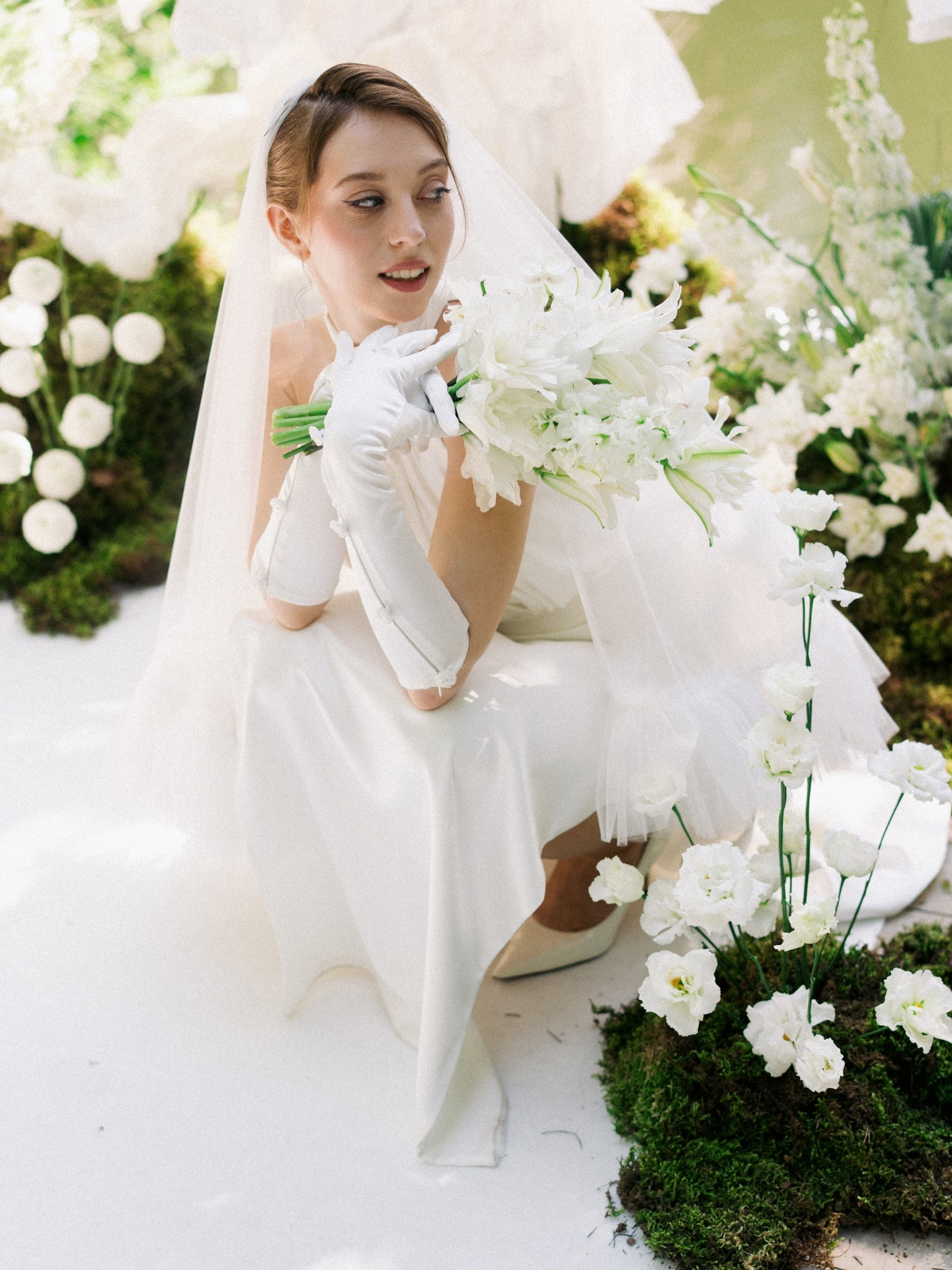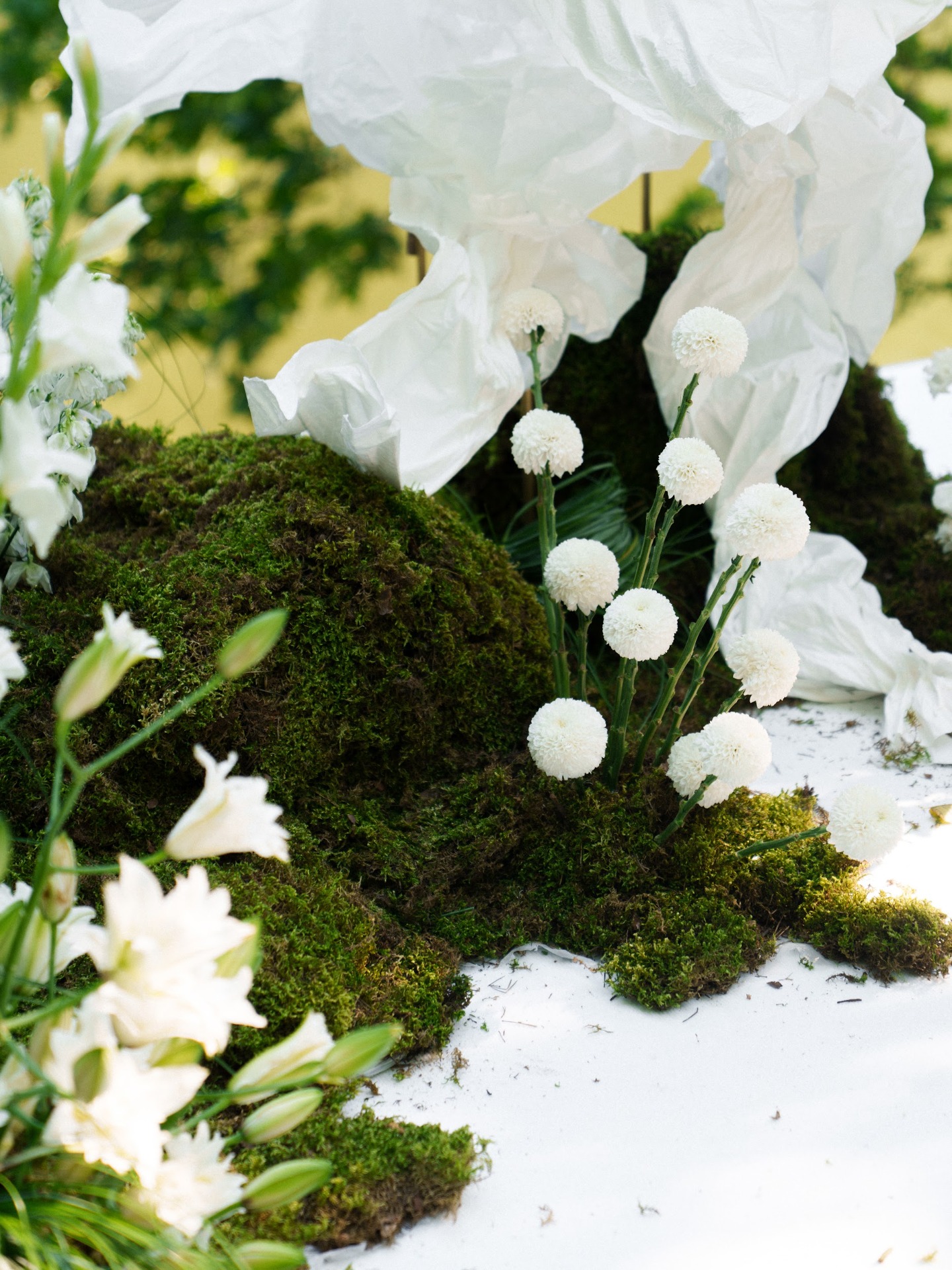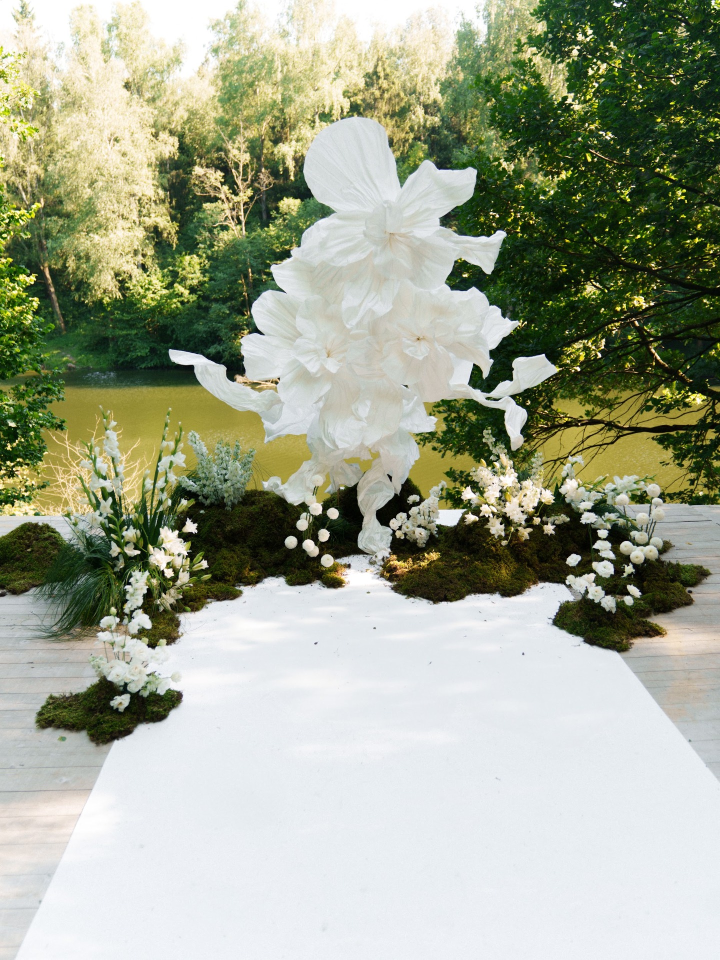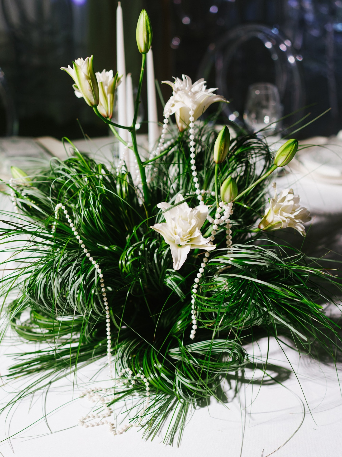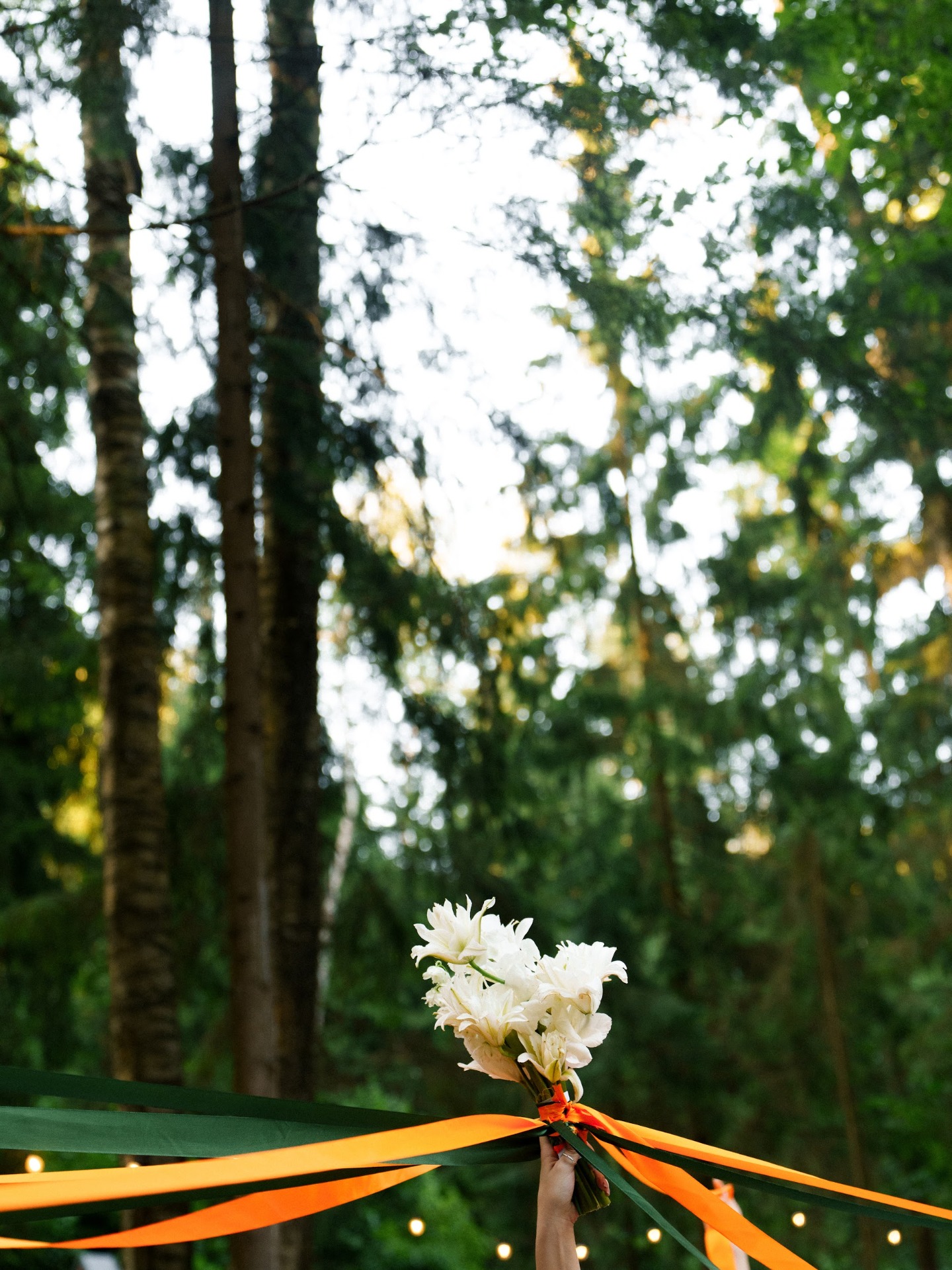 Декор получился просто идеальным: яркая зелень мха и трав, белые лилии, акцентные оранжевые ленты и жемчуг. Каждая деталь складывалась в пазл. Мы заполняли множество анкет, делились референсами с командой декораторов и с трепетом ждали дня, когда увидим весь антураж вживую. И результат оказался именно таким, как мы мечтали.