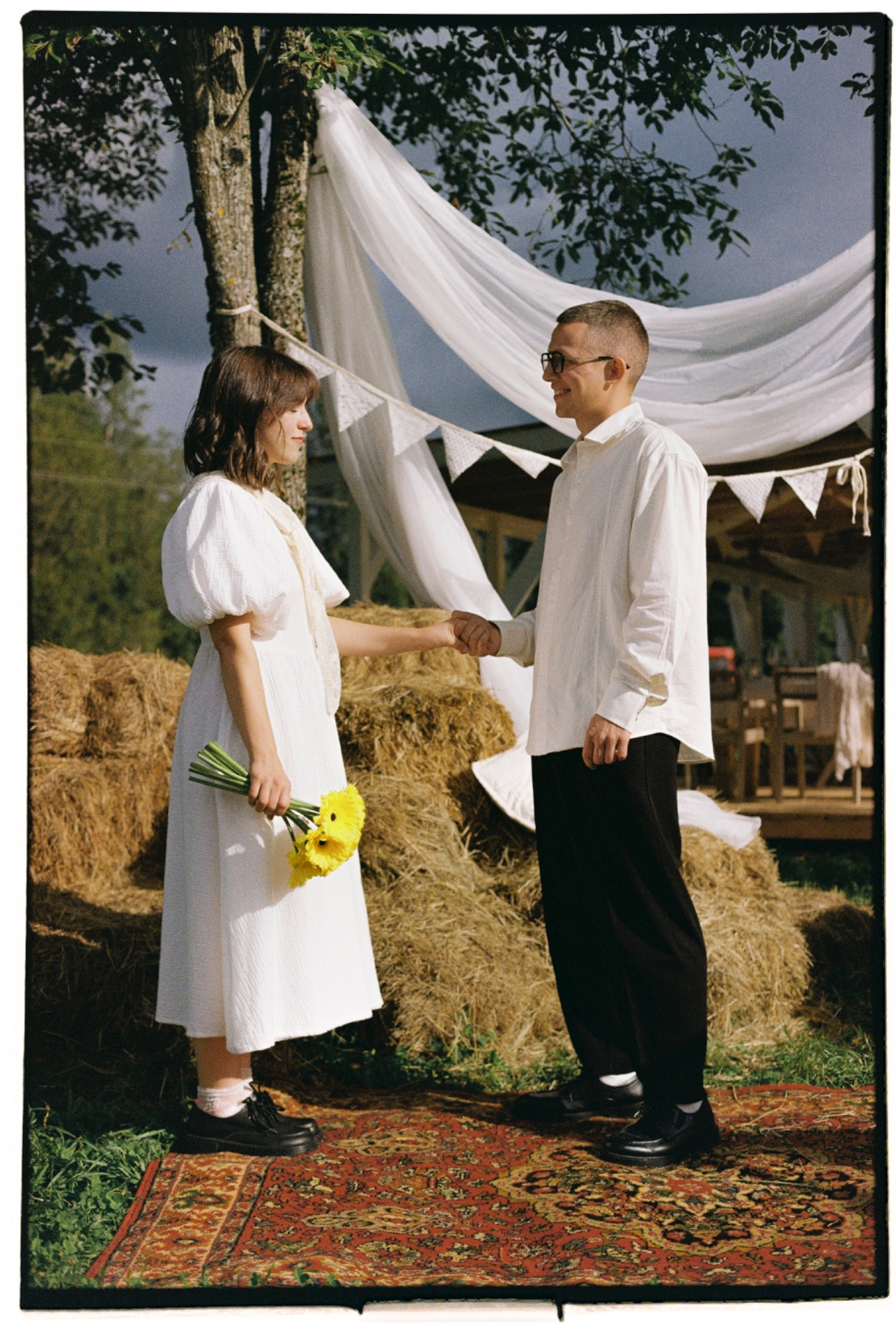 Главной гордостью вечера стал танцпол из советских ковров, которые мы искали несколько месяцев, а тюки сена для рассадки гостей на церемонии мы купили в соседней деревне и сами привезли на «ГАЗели».