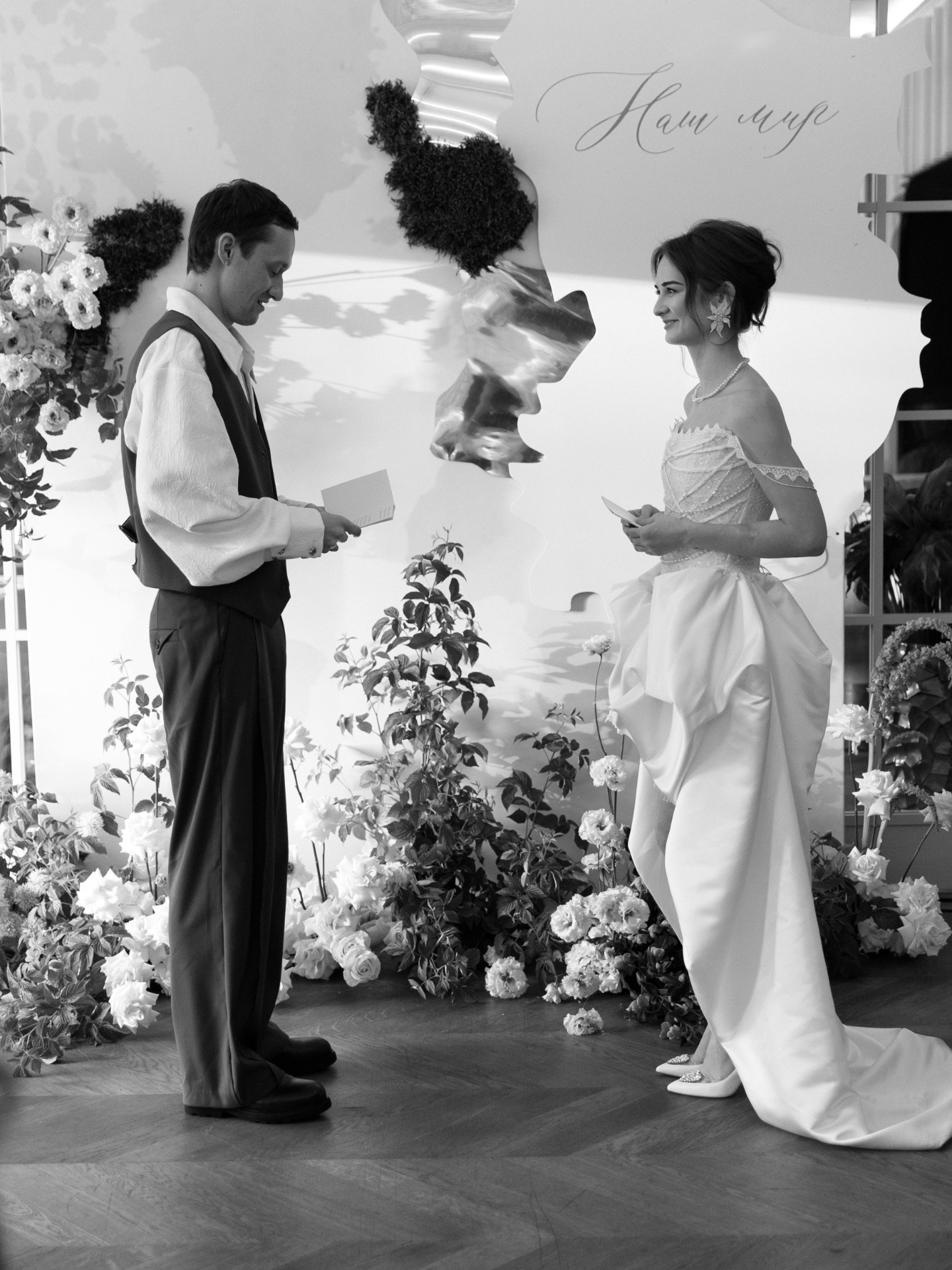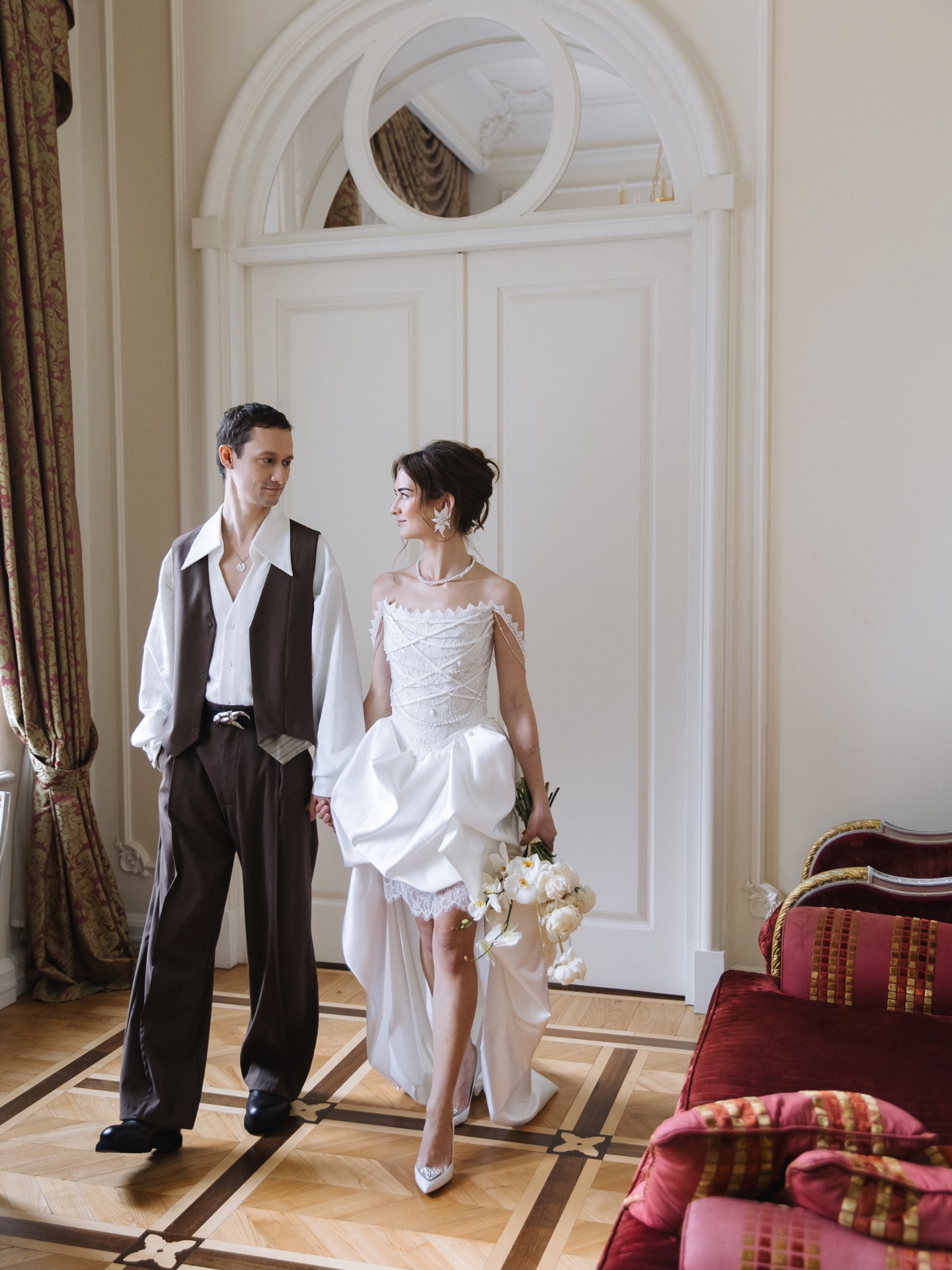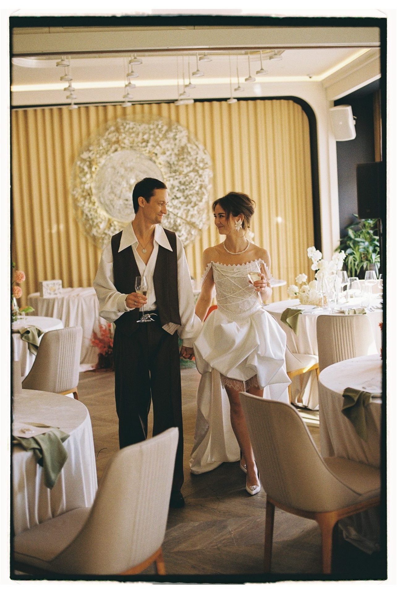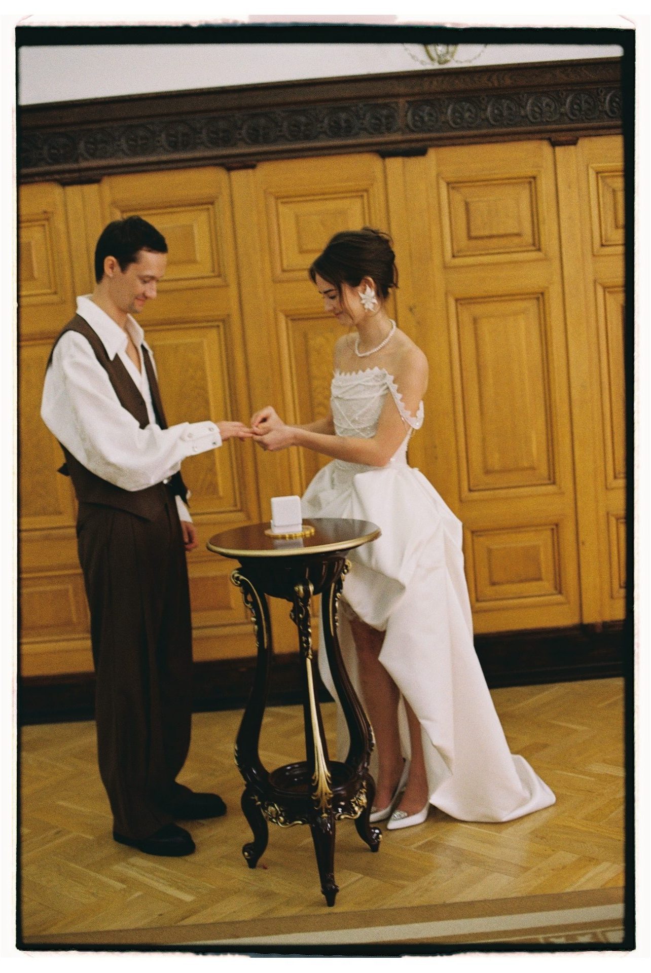 Через несколько месяцев поисков я поняла, что хочу юбку с драпировкой. Когда я увидела платье из коллекции дизайнера Татьяны Осиповой, сразу почувствовала, что оно — моё. Это было первое платье, которое я примерила, и оно сразу оказалось тем самым. Фактически это был не цельный наряд, а корсет с юбкой, но вместе они выглядели очень органично. На примерке мы внесли несколько изменений в изначальный вариант, чтобы сделать комплект более персонализированным. В качестве второго образа у меня было короткое платье и перчатки, сделанные на заказ, на которых были вышиты важные для нас даты и места.