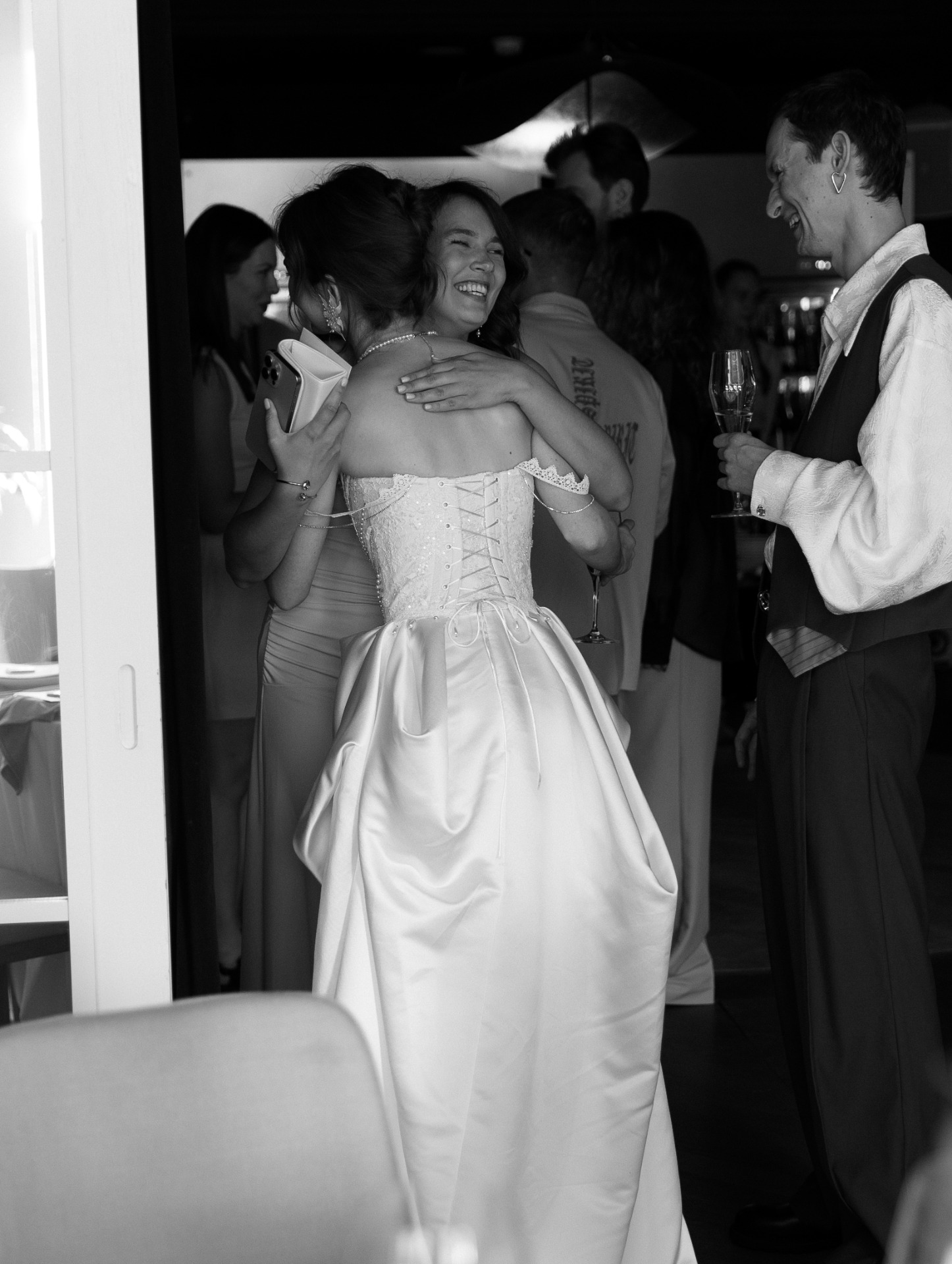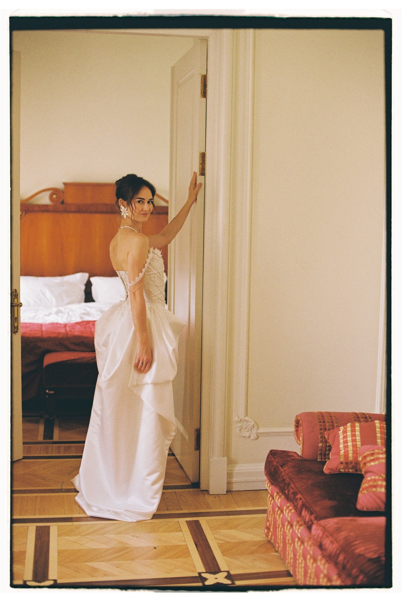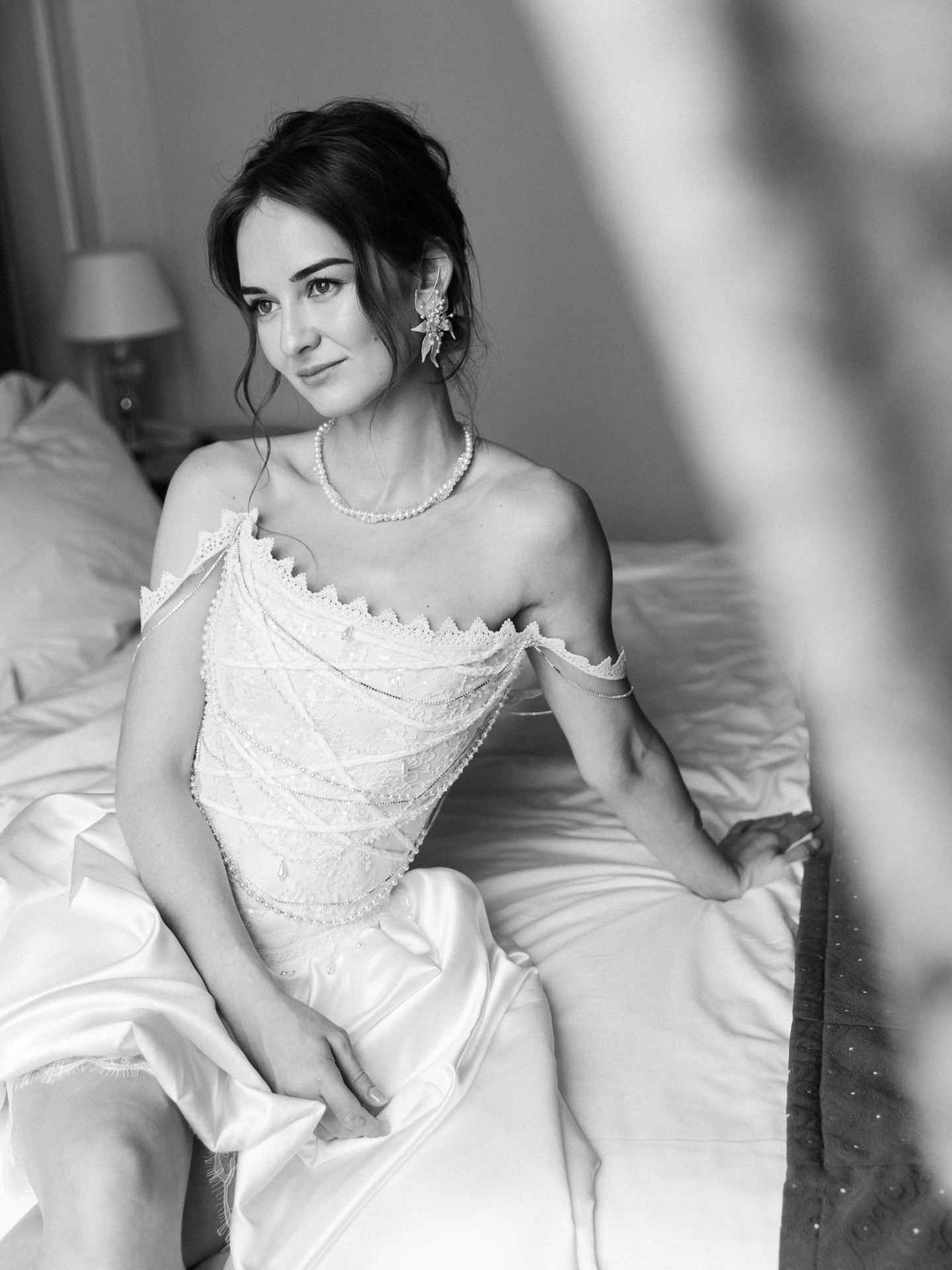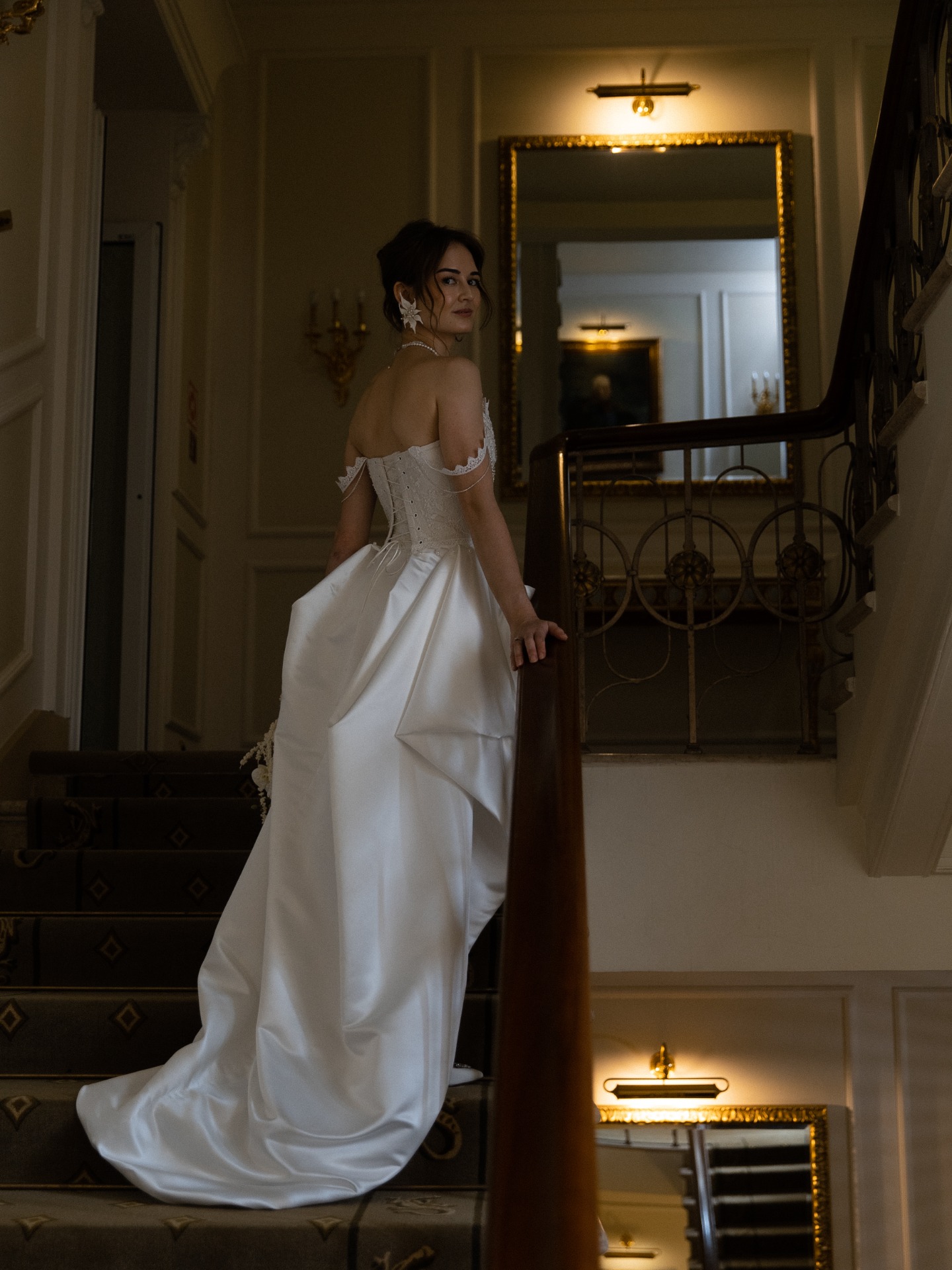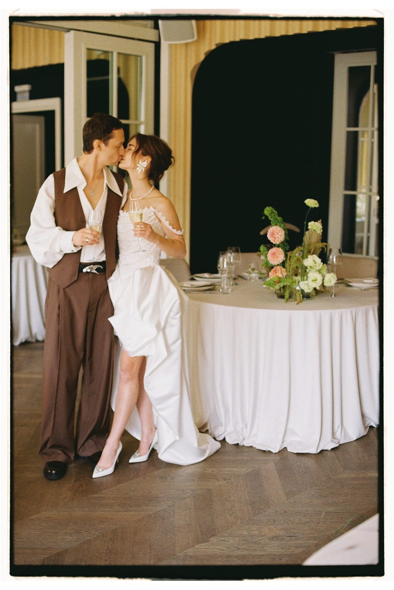 Через несколько месяцев поисков я поняла, что хочу юбку с драпировкой. Когда я увидела платье из коллекции дизайнера Татьяны Осиповой, сразу почувствовала, что оно — моё. Это было первое платье, которое я примерила, и оно сразу оказалось тем самым. Фактически это был не цельный наряд, а корсет с юбкой, но вместе они выглядели очень органично. На примерке мы внесли несколько изменений в изначальный вариант, чтобы сделать комплект более персонализированным. В качестве второго образа у меня было короткое платье и перчатки, сделанные на заказ, на которых были вышиты важные для нас даты и места.