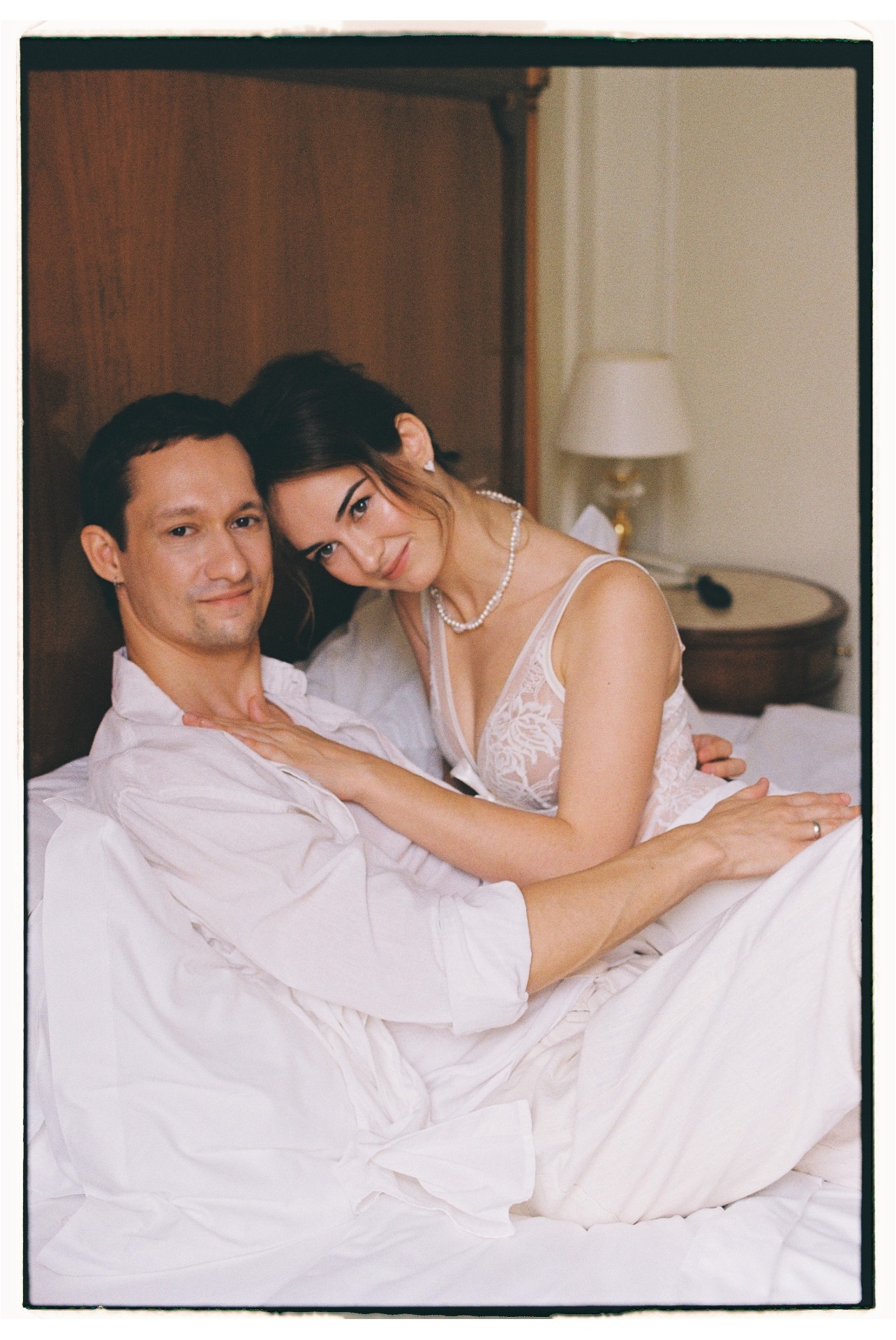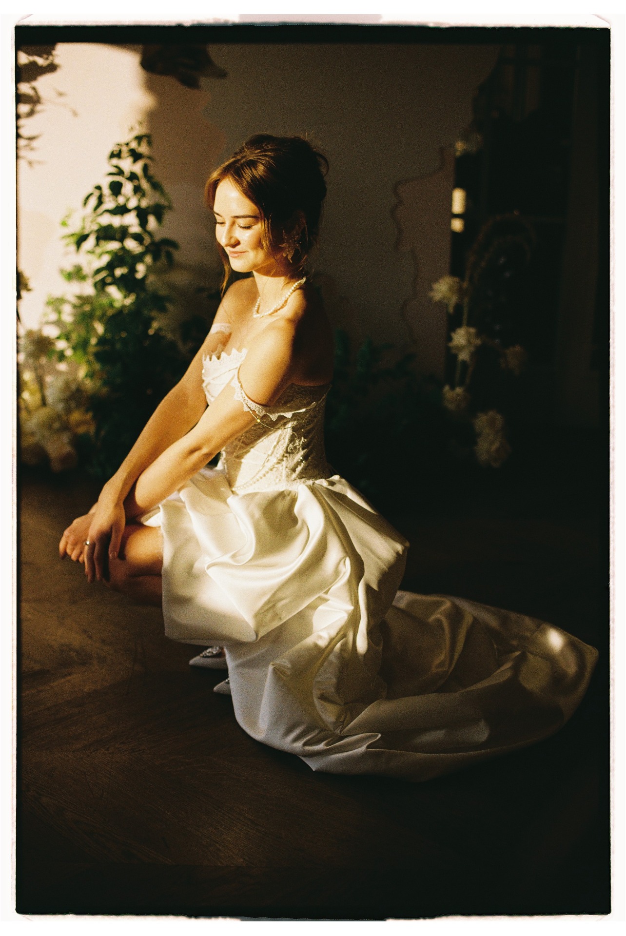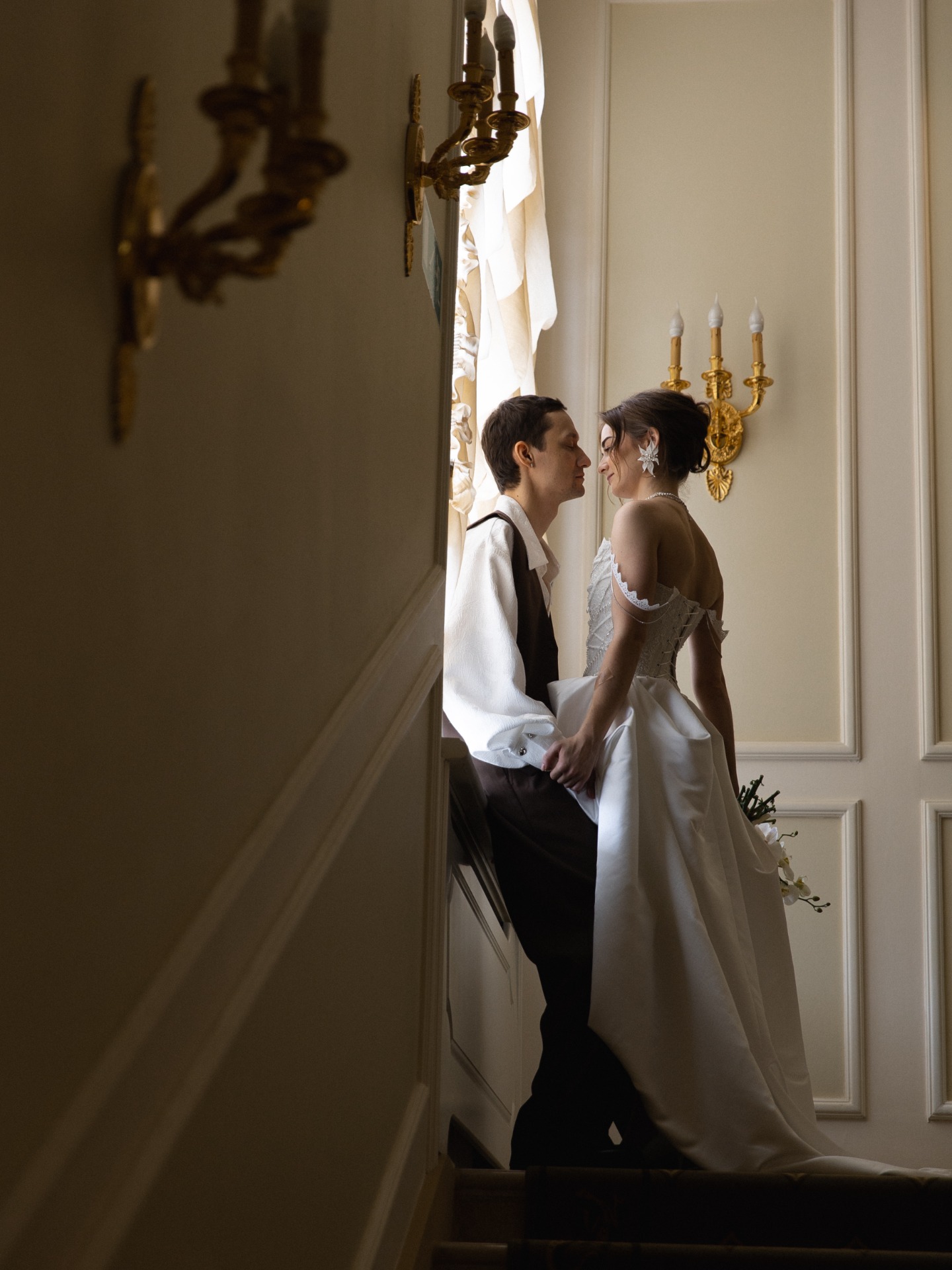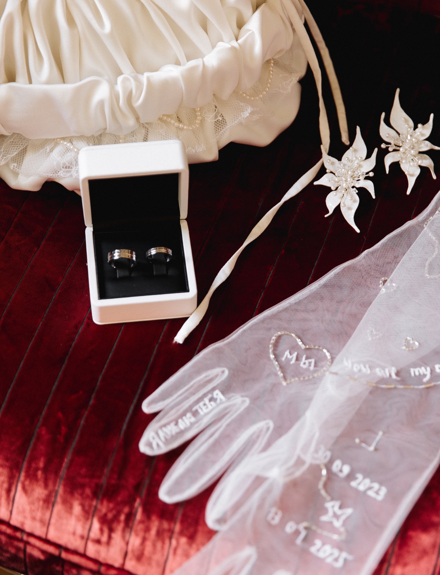 Через несколько месяцев поисков я поняла, что хочу юбку с драпировкой. Когда я увидела платье из коллекции дизайнера Татьяны Осиповой, сразу почувствовала, что оно — моё. Это было первое платье, которое я примерила, и оно сразу оказалось тем самым. Фактически это был не цельный наряд, а корсет с юбкой, но вместе они выглядели очень органично. На примерке мы внесли несколько изменений в изначальный вариант, чтобы сделать комплект более персонализированным. В качестве второго образа у меня было короткое платье и перчатки, сделанные на заказ, на которых были вышиты важные для нас даты и места.