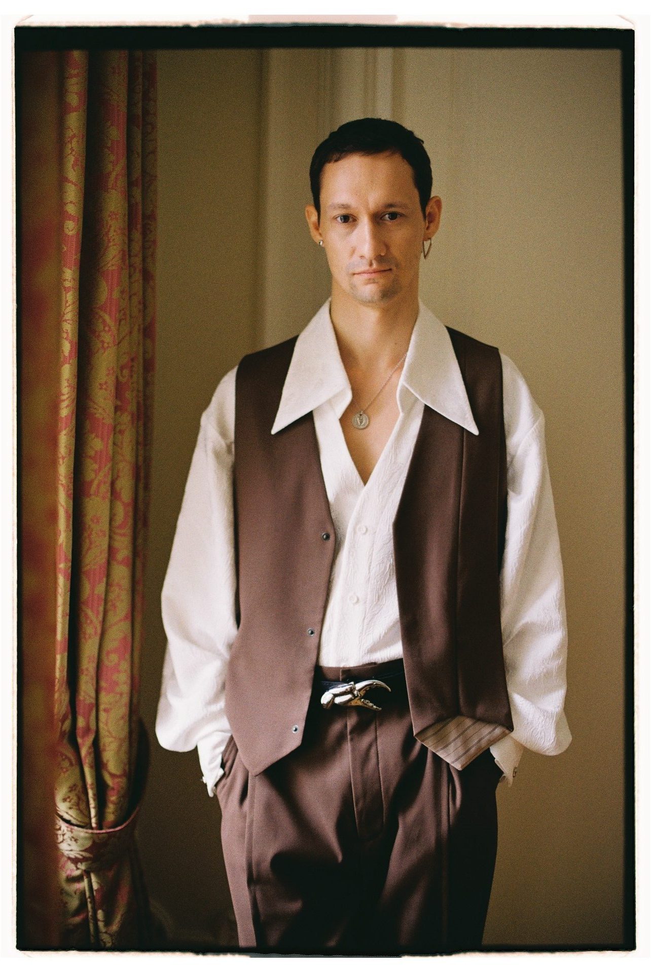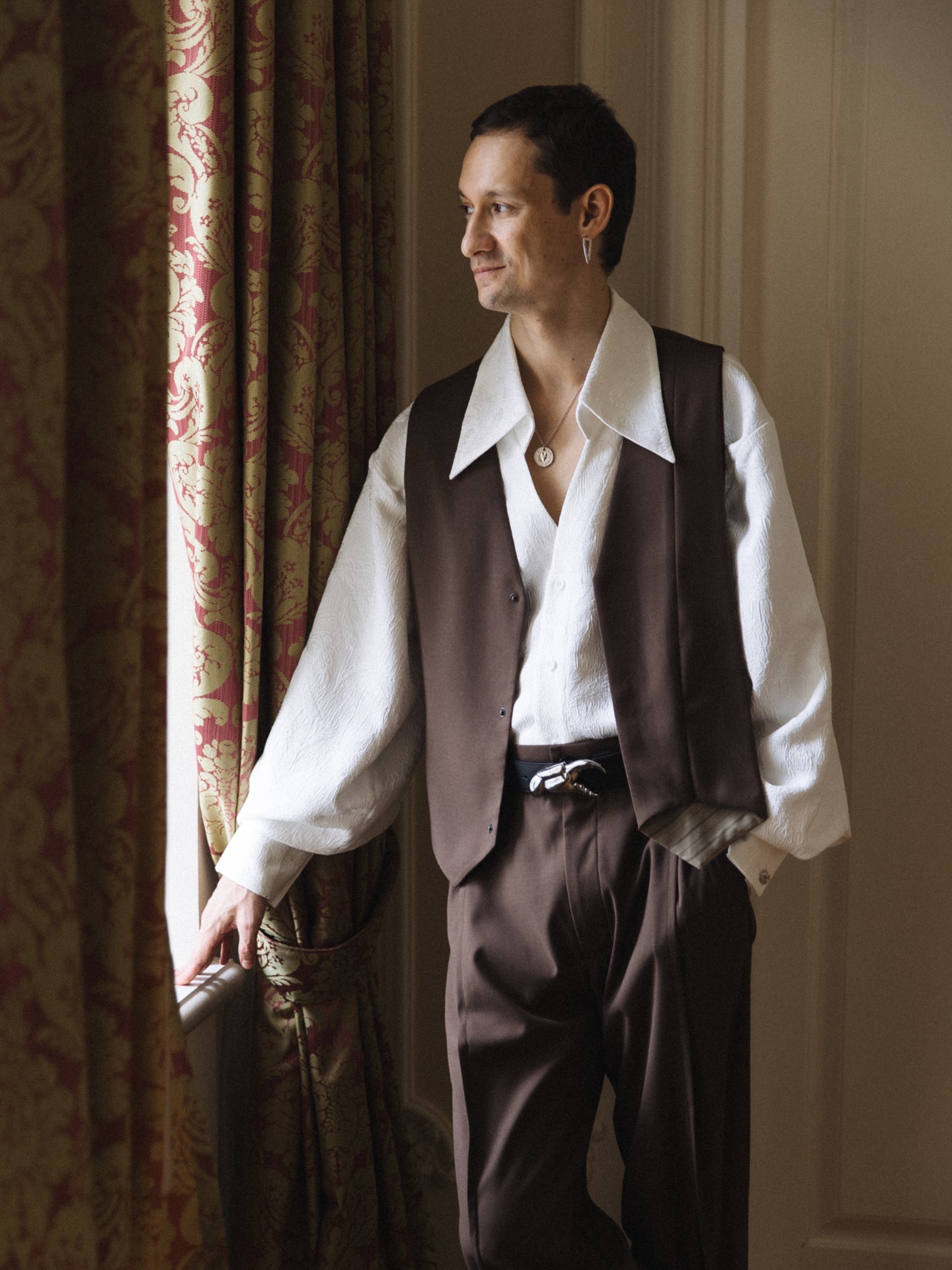 Костюм для жениха мы нашли в Chernim Cherno. Это тоже был первый костюм, который примерил Вова, и он сразу отлично ему подошёл. Интересной деталью в образе Вовы были серьги из Avgst. Одна из них была гвоздиком, а вторая в форме объёмного сердца.