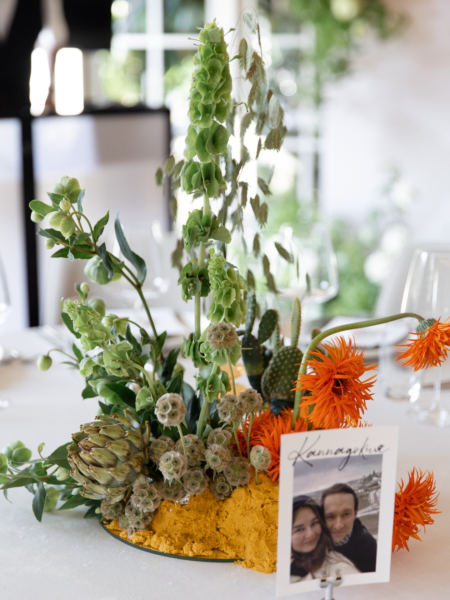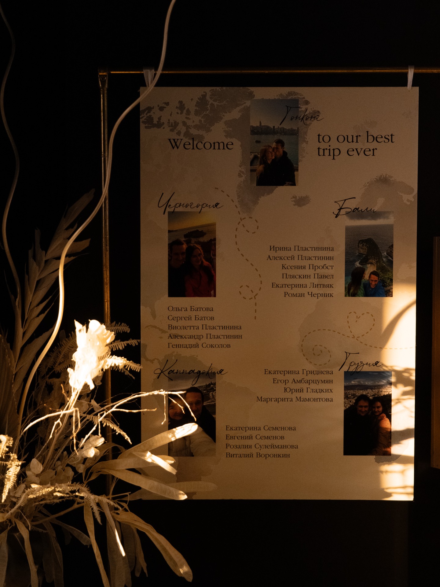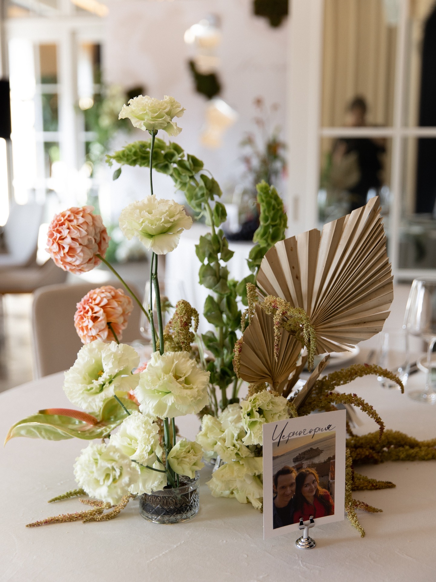 Мы решили не обращаться в агентство и организовать всё самостоятельно. Для поиска вдохновения использовали известные свадебные порталы и искали идеи на Pinterest. Во время наших отношений мы много путешествовали, успели даже пожить в нескольких странах. Поэтому нам хотелось отразить это в декоре как часть нашей истории. Палитру свадьбы предложили декораторы, и это сразу стало попаданием в сердечко. В качестве основных цветов мы выбрали белый, зелёный и коричневый. Гостевые столы и президиум были оформлены в стилистике стран, которые мы посещали. Также у нас была фотозона с изображениями материков из зелени и мха.