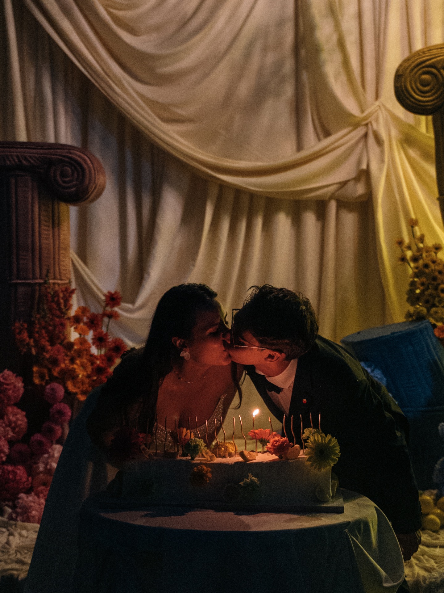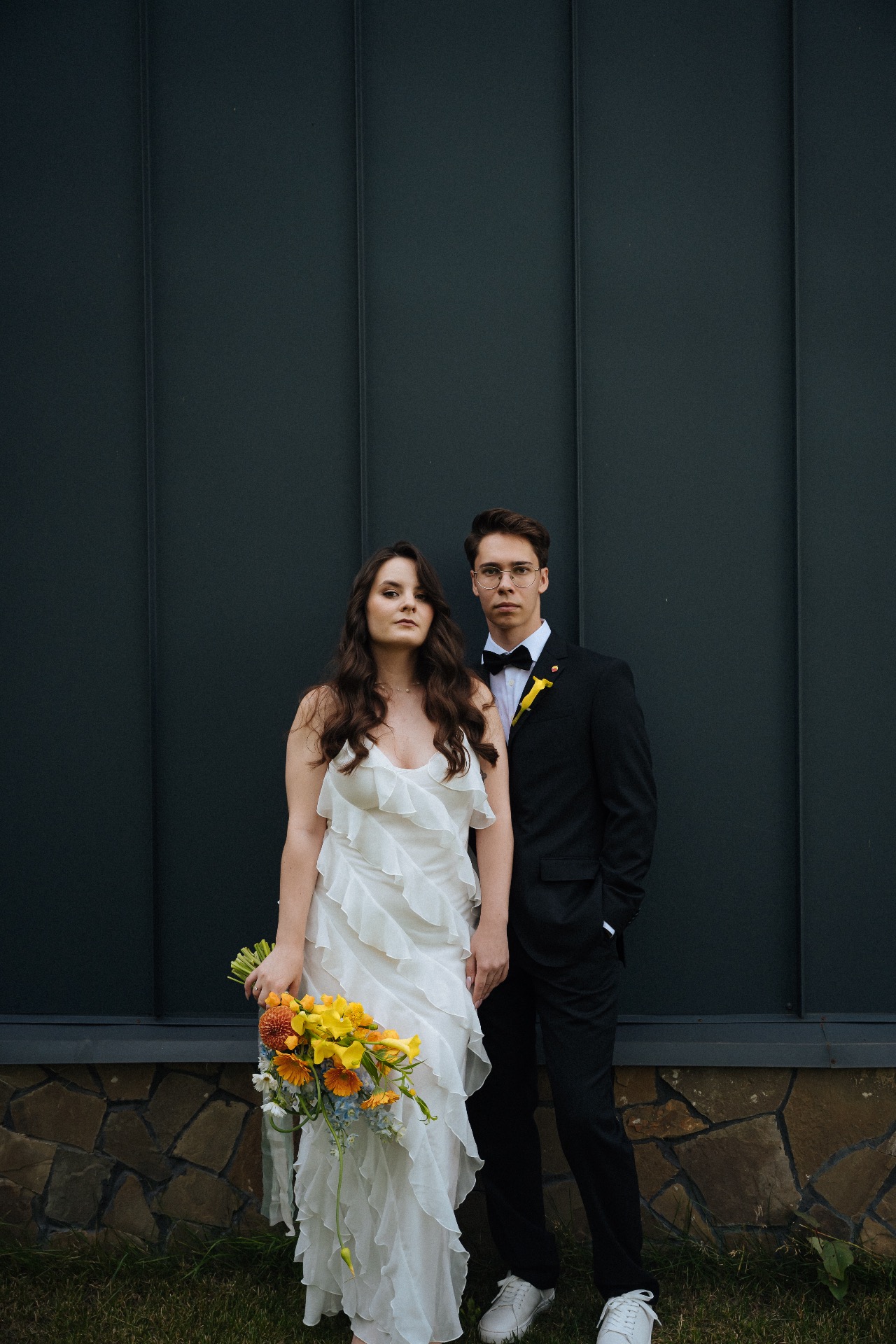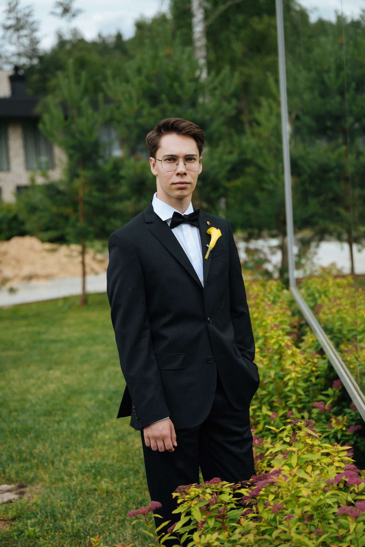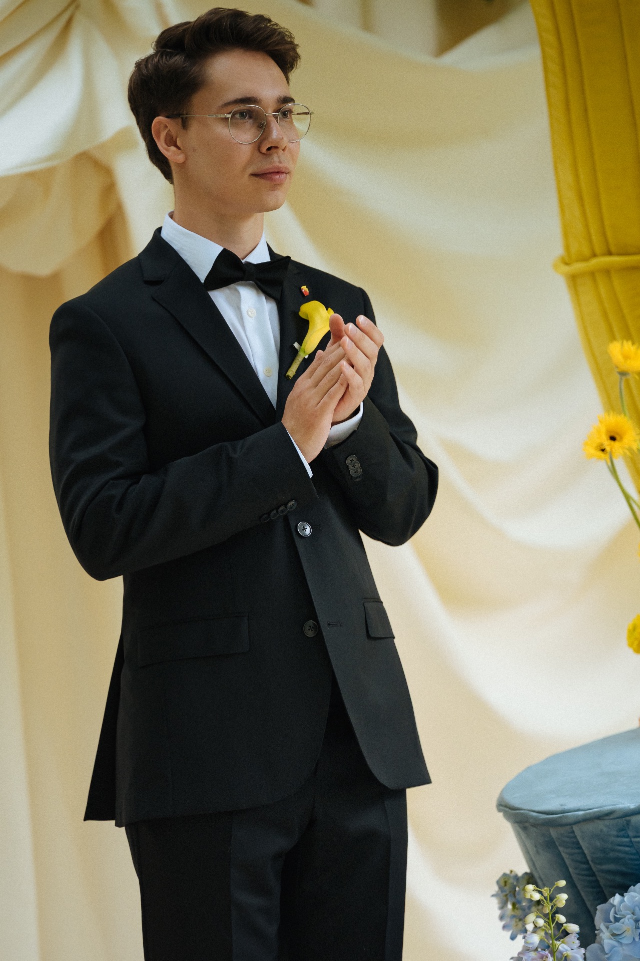 Семён хотел придерживаться классики, но с деталями, добавляющими лёгкости и юмора вечеру. К чёрному костюму он выбрал жёлтую бутоньерку в тон лимонам, из которой потом выпил шот лимончеллы с холостыми друзьями, чтобы её разыграть. А ещё он прикрепил пин с эмодзи огненного сердца.