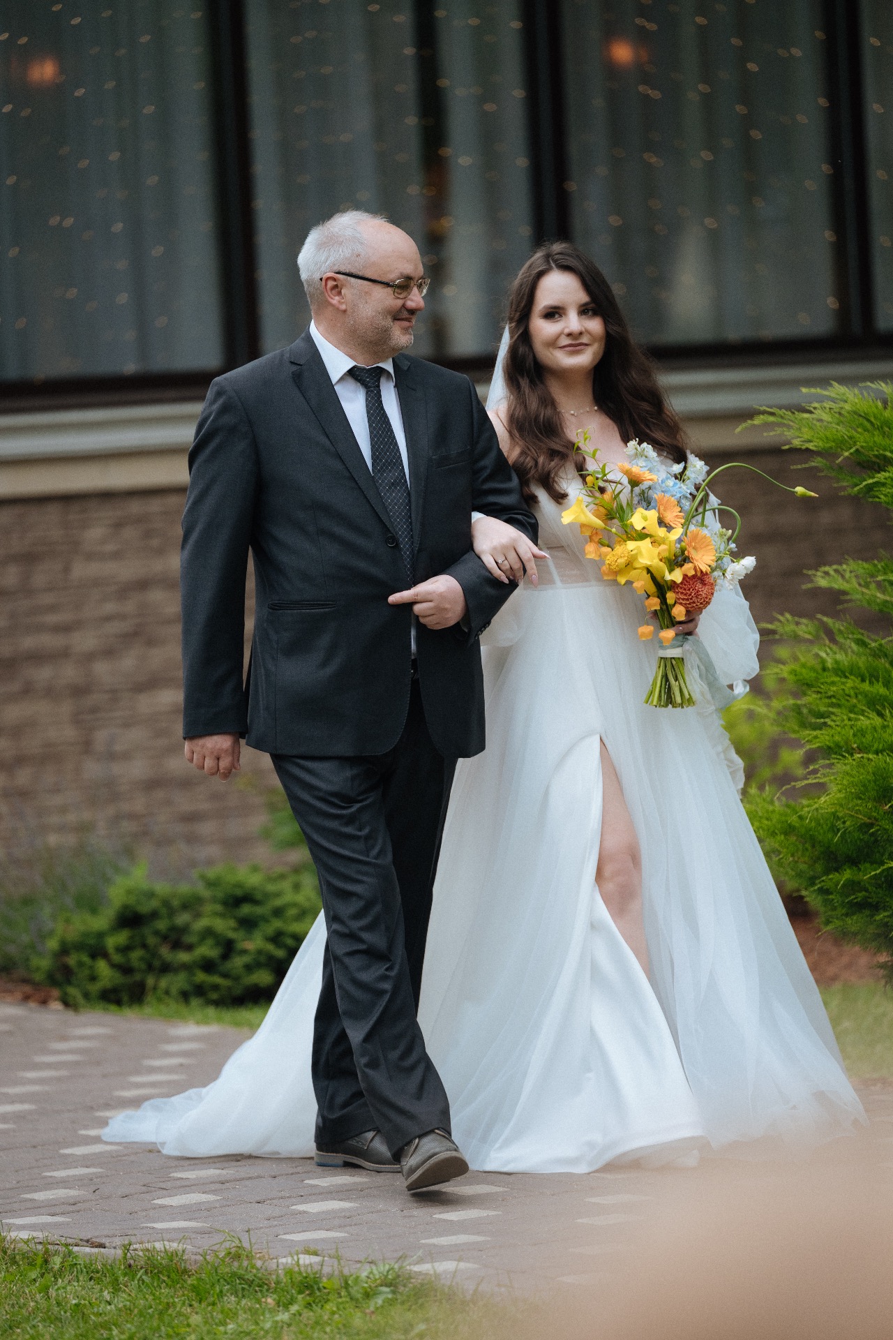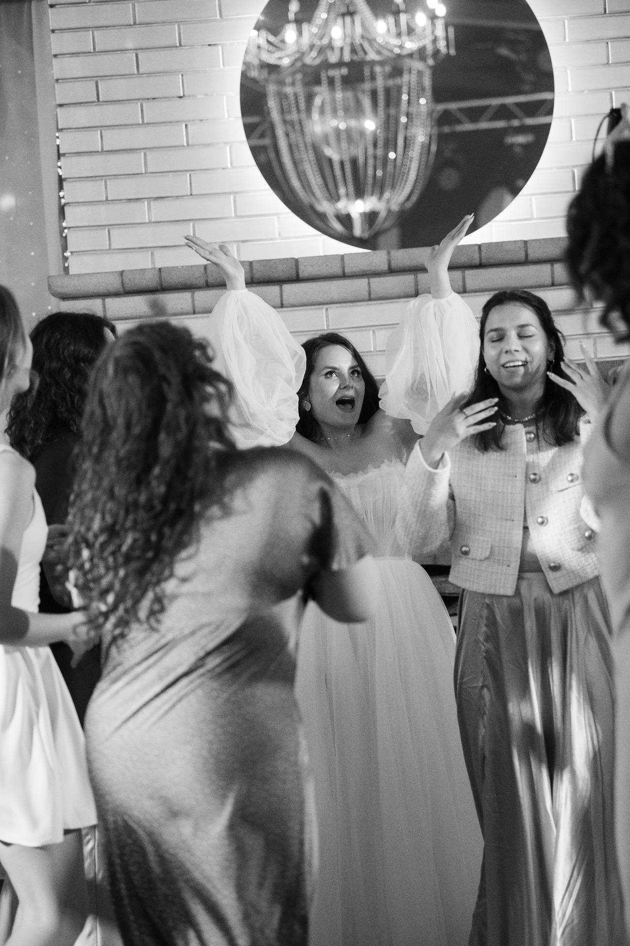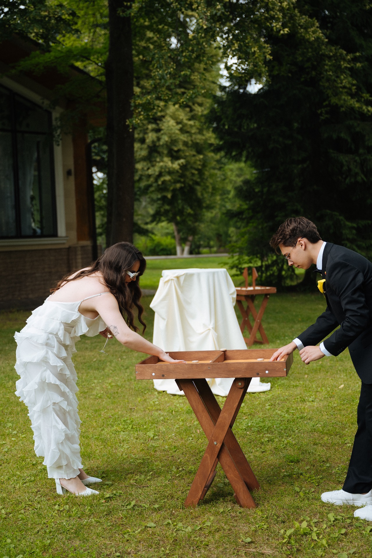 Во время церемонии Семён, как фанат Формулы 1, выходил в красных тапочках с логотипом Ferrari, а затем друзья сделали ему пит-стоп перед алтарём, переобув в свадебный образ. В конце вечера мы сделали ещё одну отсылку к этому увлечению и устроили дождь из шампанского.