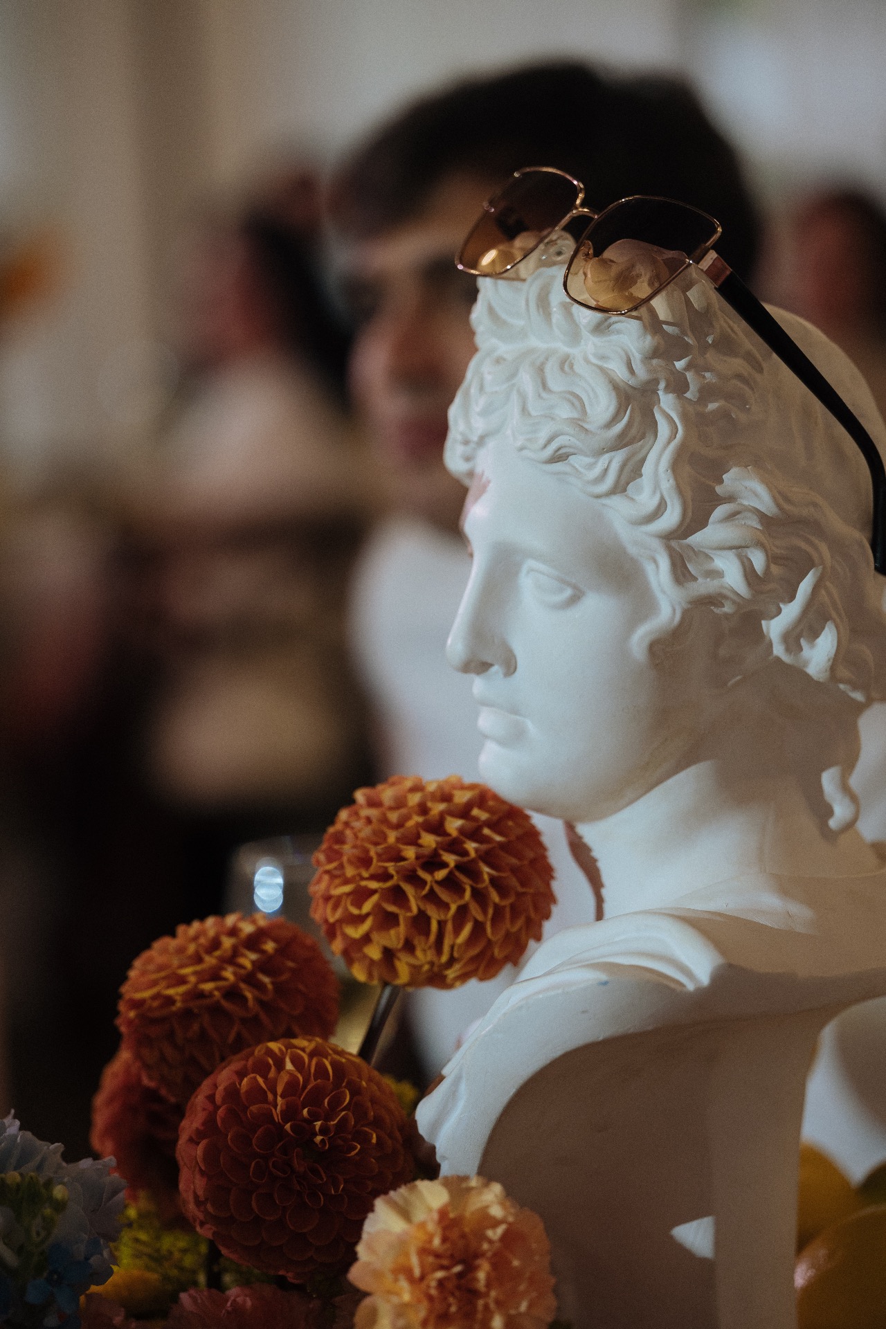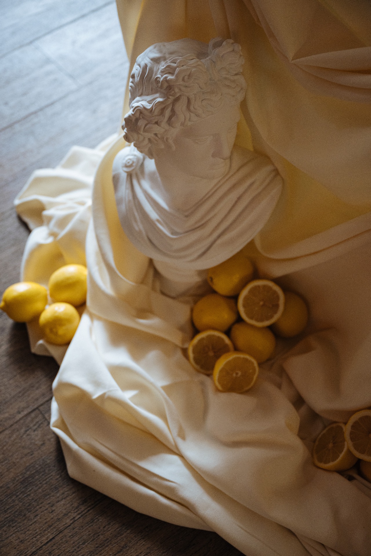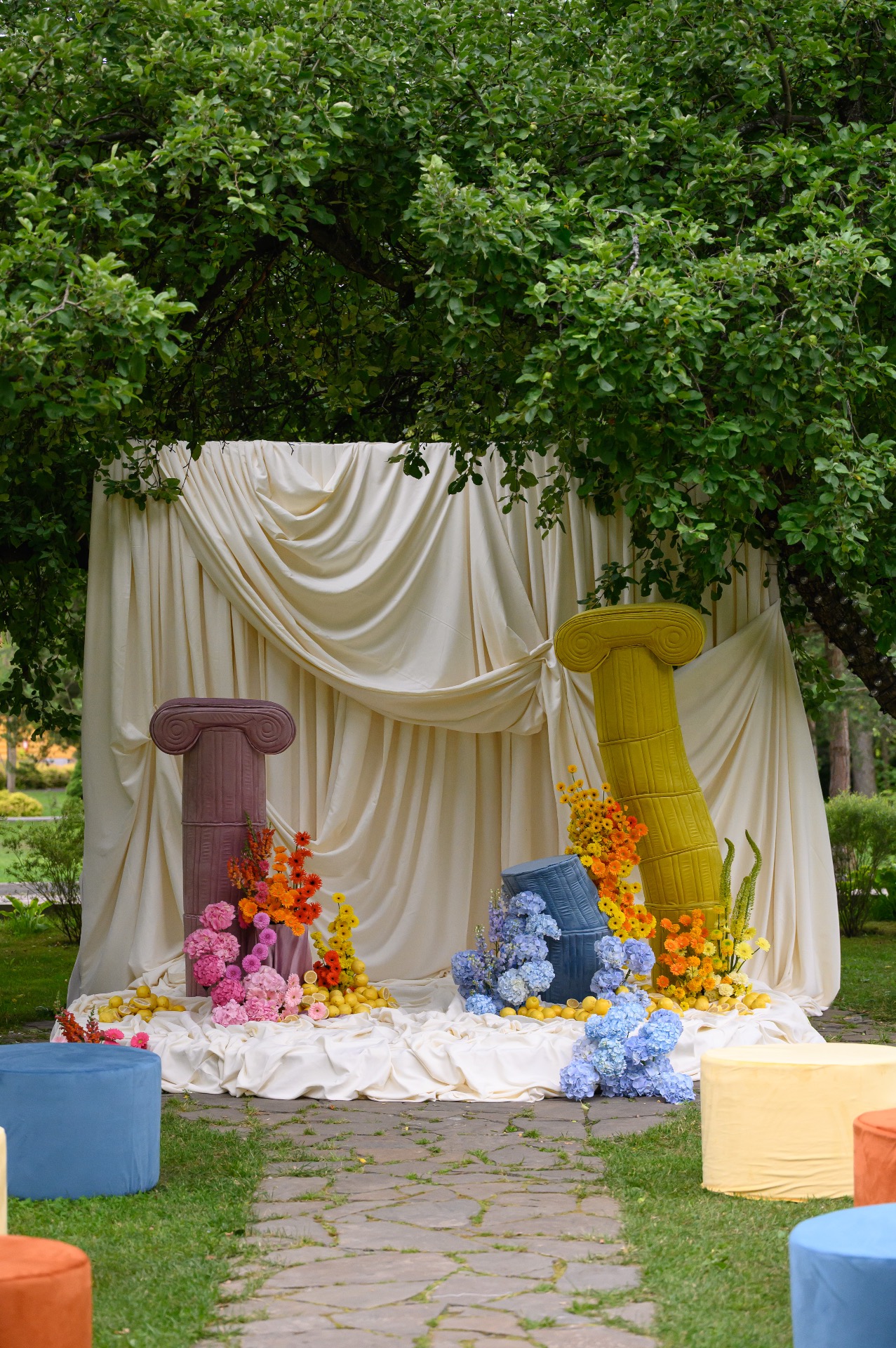 На первой встрече с декораторами мы рассматривали совсем разные варианты концепций, и в одной из них увидели огромные плюшевые колонны в качестве примера. И тут нас осенило: нам нужны колонны, бюсты и желанные нами лимоны. Так мы придумали нашу Италию, которую оба любим.