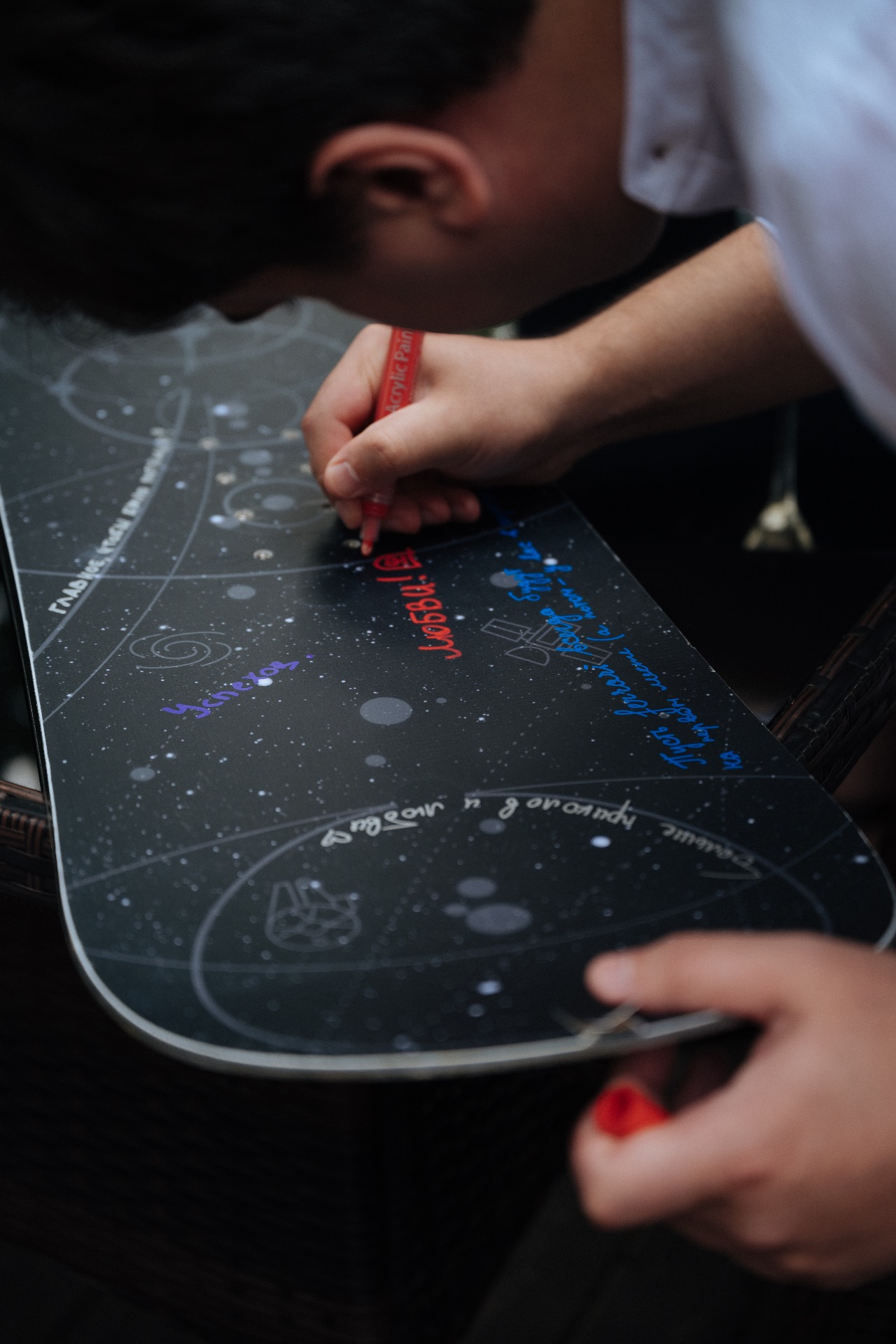 Для зоны встречи гостей мы составили плейлист только из итальянской музыки, чтобы задать тон всему дню. Мы встречали каждого приглашённого со стопками лимончеллы в ледяных рюмках, которые затем предлагали разбить о табличку за наше счастье. Гости могли сфотографироваться и вклеить фото и пожелания в альбом, а чтобы поздравления были также выдержаны в стилистике нашей свадьбы, мы подготовили наклейки на итальянскую тематику. Дополнительно мы поставили сноуборд для росписи вместо книги пожеланий.