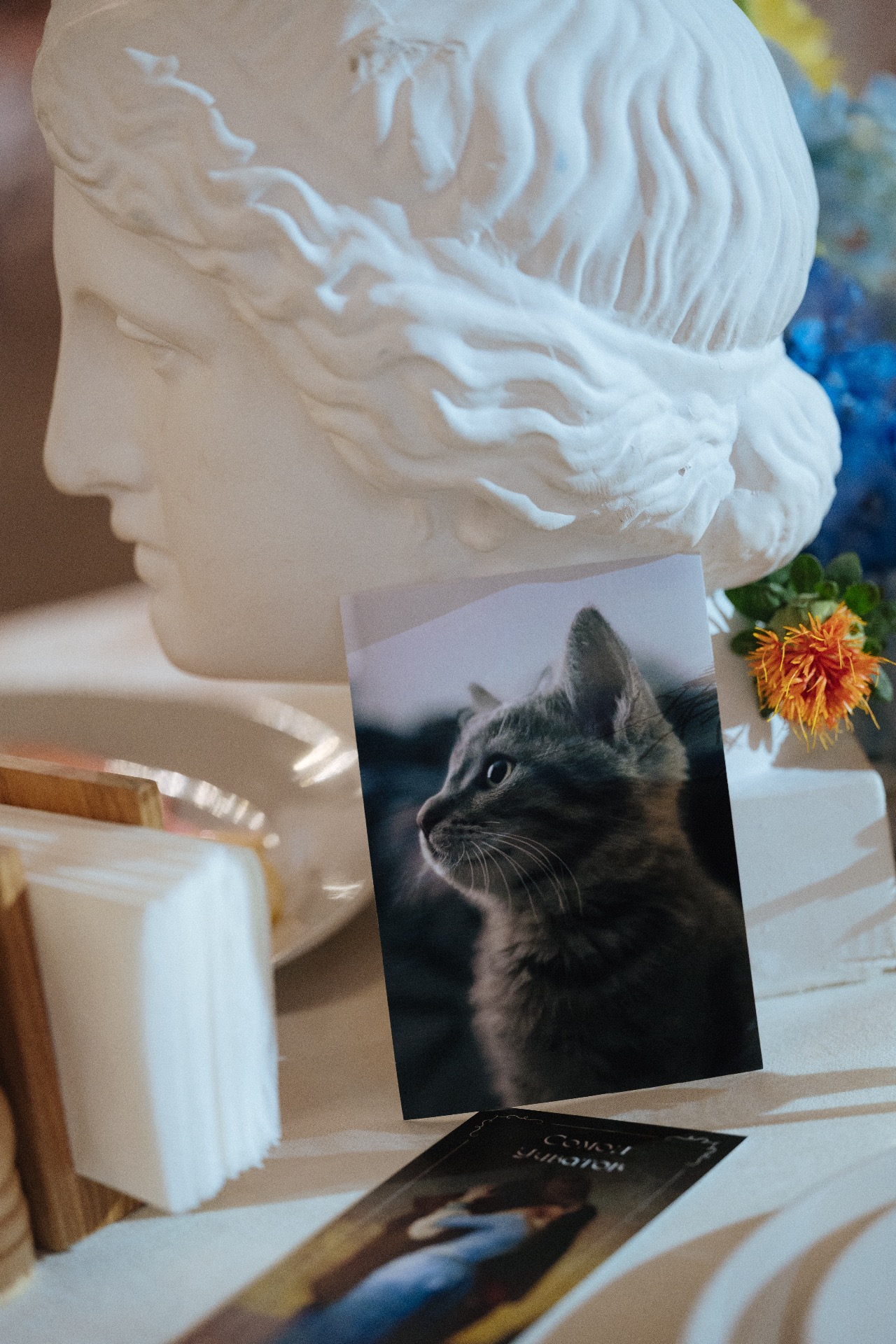 Трогательным моментом стал особенный подарок от наших друзей. Все знают, как сильно мы любим нашего кота, поэтому ребята принесли для нас отдельную табличку с его фото, которая простояла с нами весь вечер.