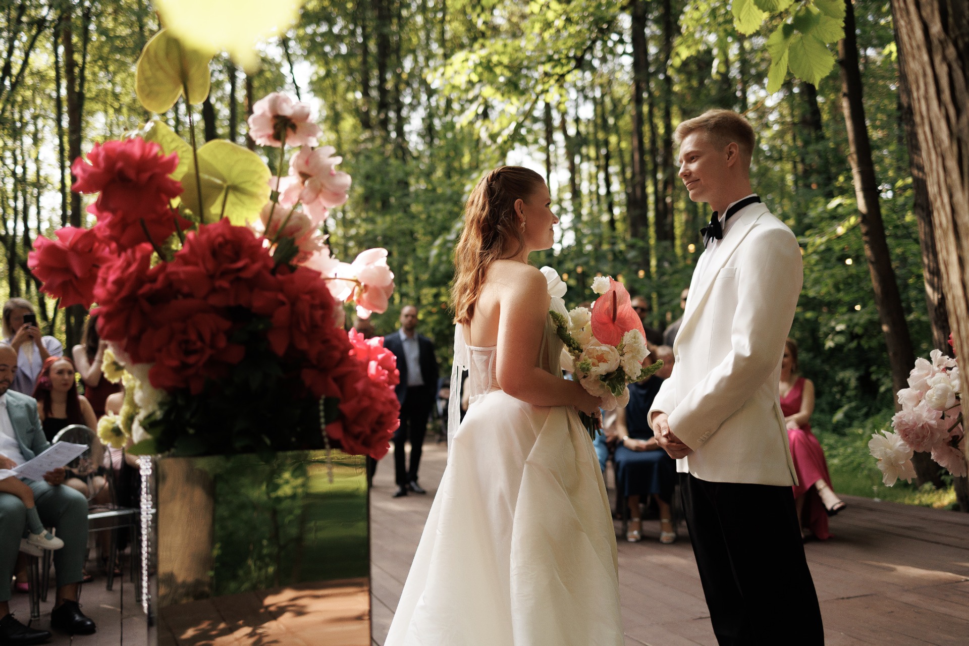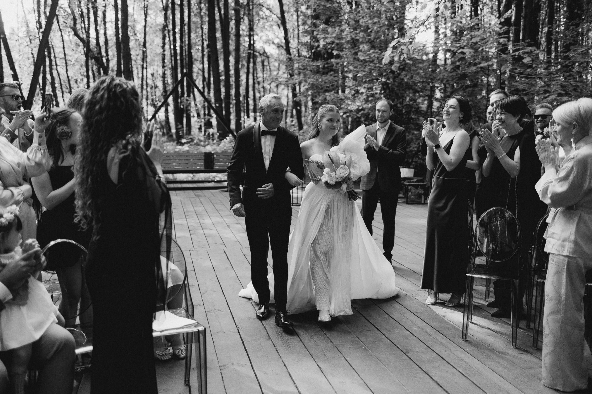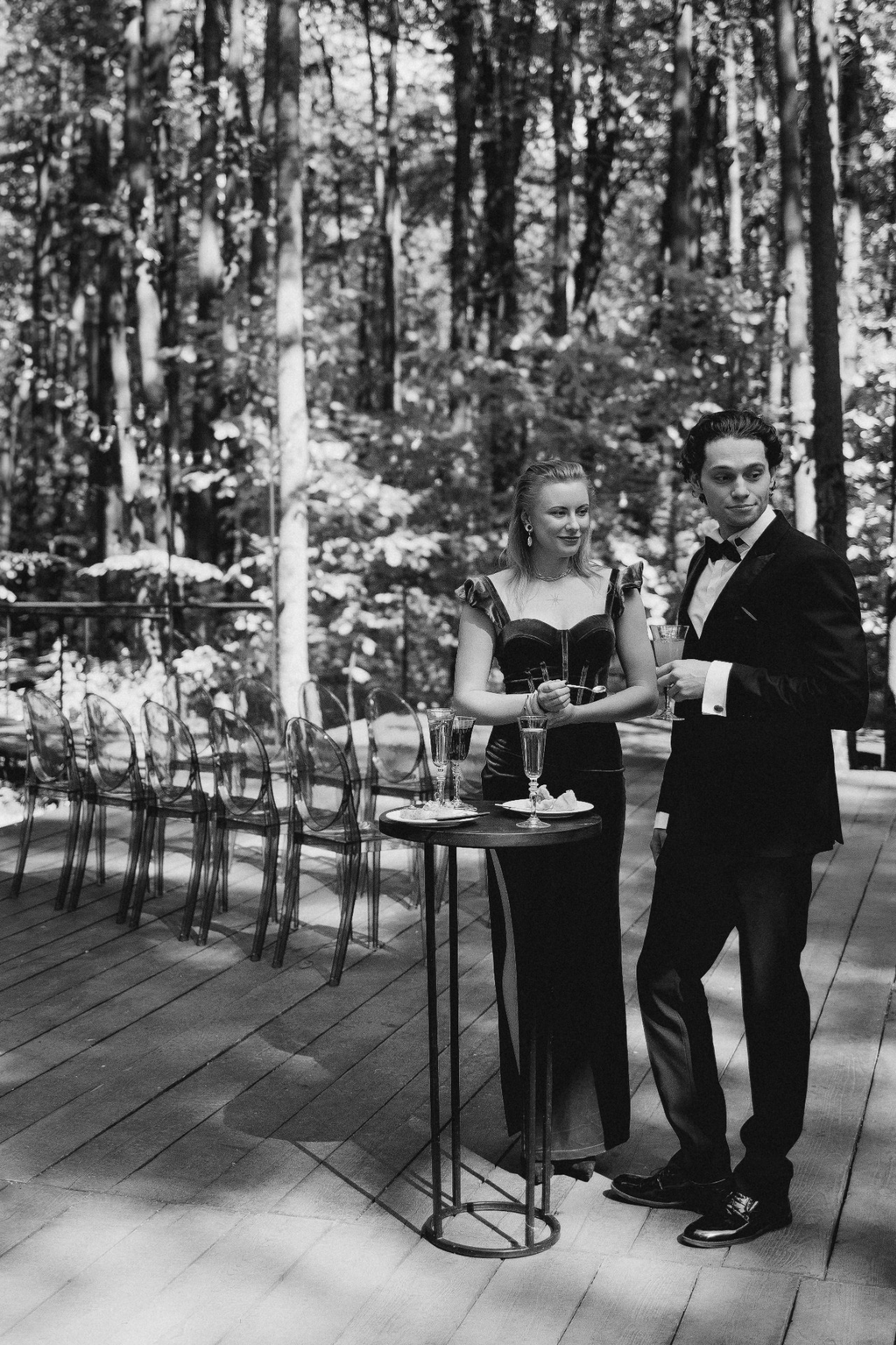 Место мы выбрали сразу. Ещё пару лет назад я случайно наткнулась на видео в Reels со стеклянной оранжереей посреди леса и сохранила его в папку «Свадьба». После предложения показала Серёже и он тоже загорелся. В октябре мы съездили посмотреть площадку и сразу её забронировали. Нам хотелось сделать «сказку в лесу». Пространство само по себе камерное и очень красивое, хотелось сохранить его атмосферу.