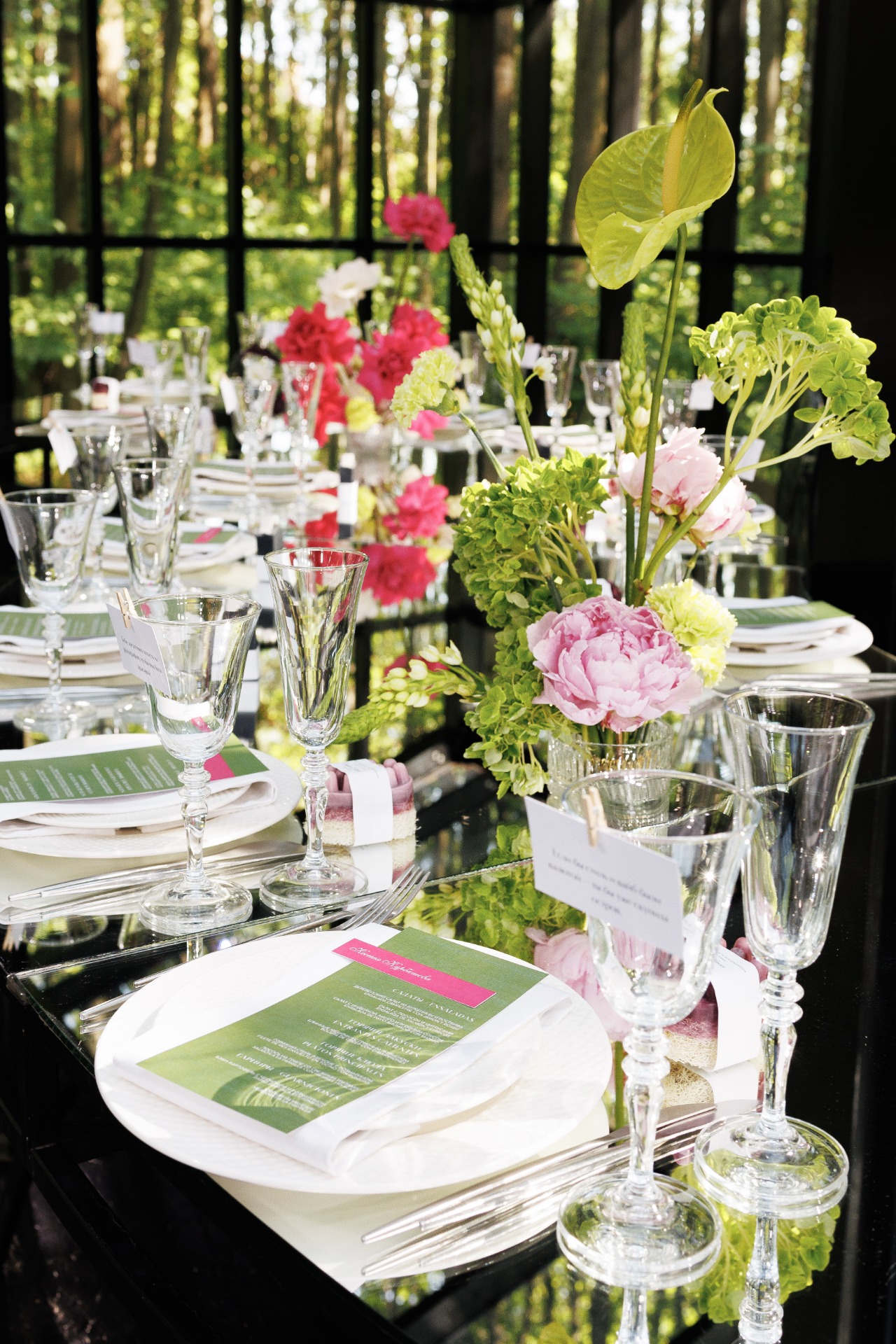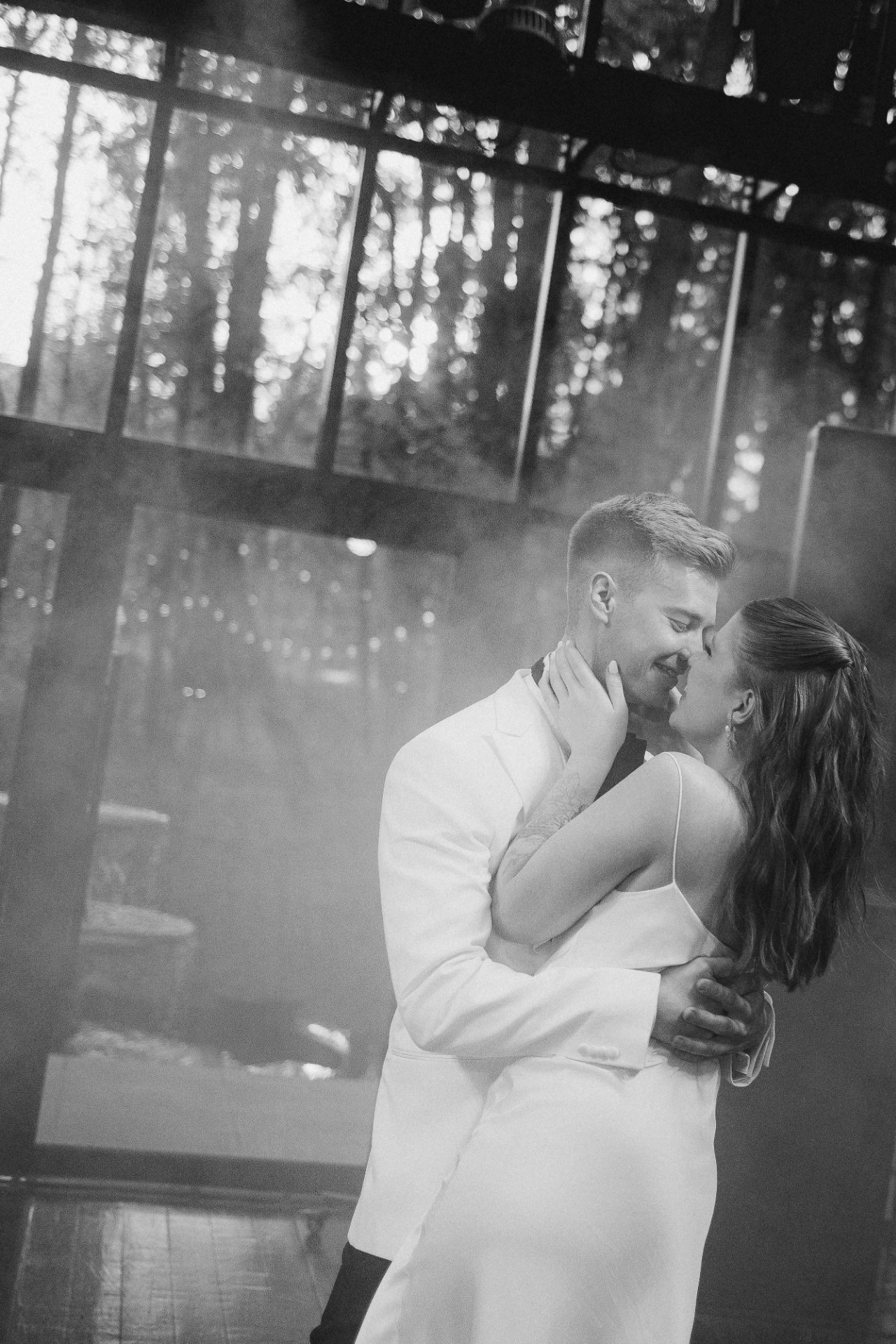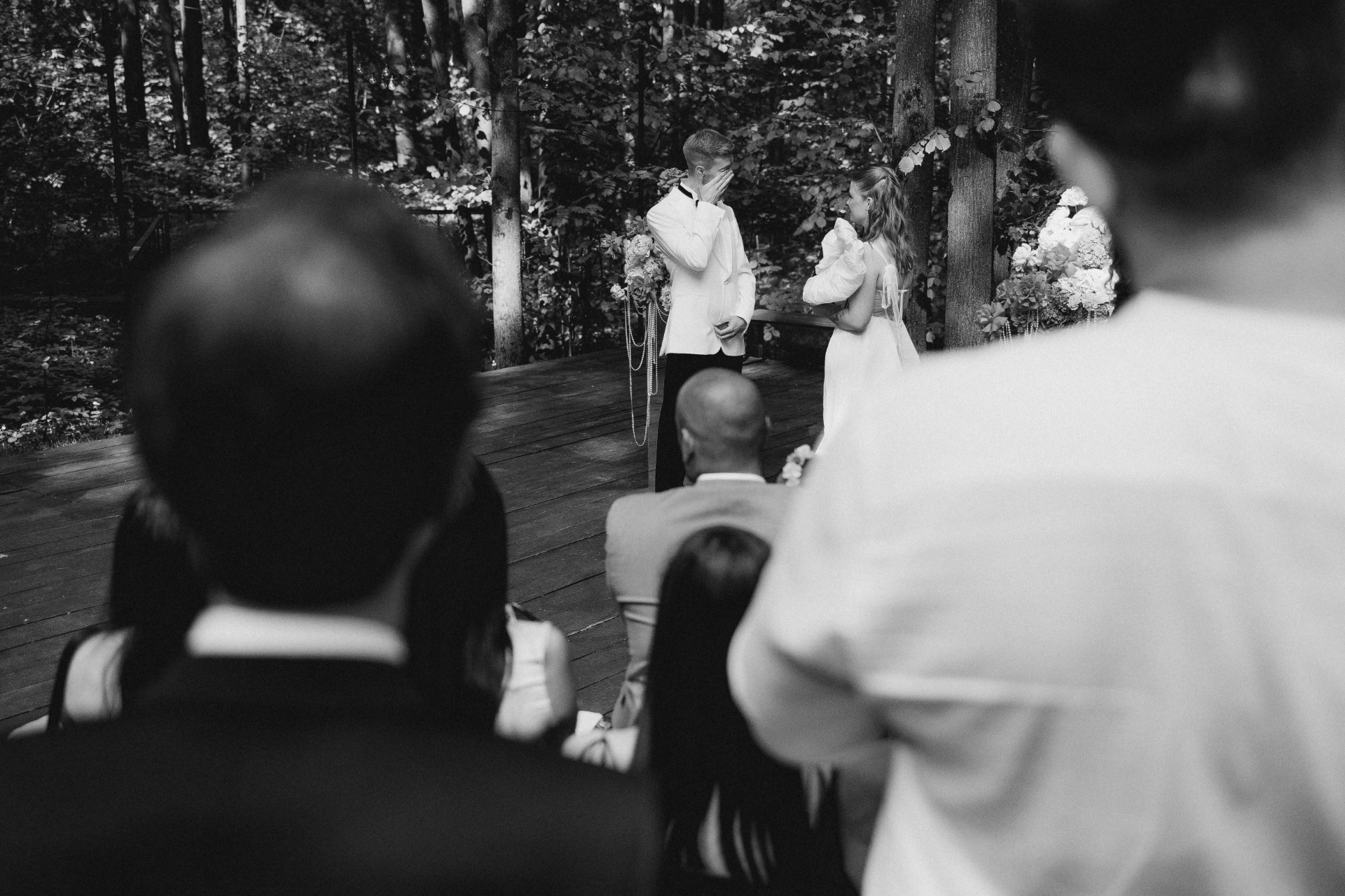 Место мы выбрали сразу. Ещё пару лет назад я случайно наткнулась на видео в Reels со стеклянной оранжереей посреди леса и сохранила его в папку «Свадьба». После предложения показала Серёже и он тоже загорелся. В октябре мы съездили посмотреть площадку и сразу её забронировали. Нам хотелось сделать «сказку в лесу». Пространство само по себе камерное и очень красивое, хотелось сохранить его атмосферу.