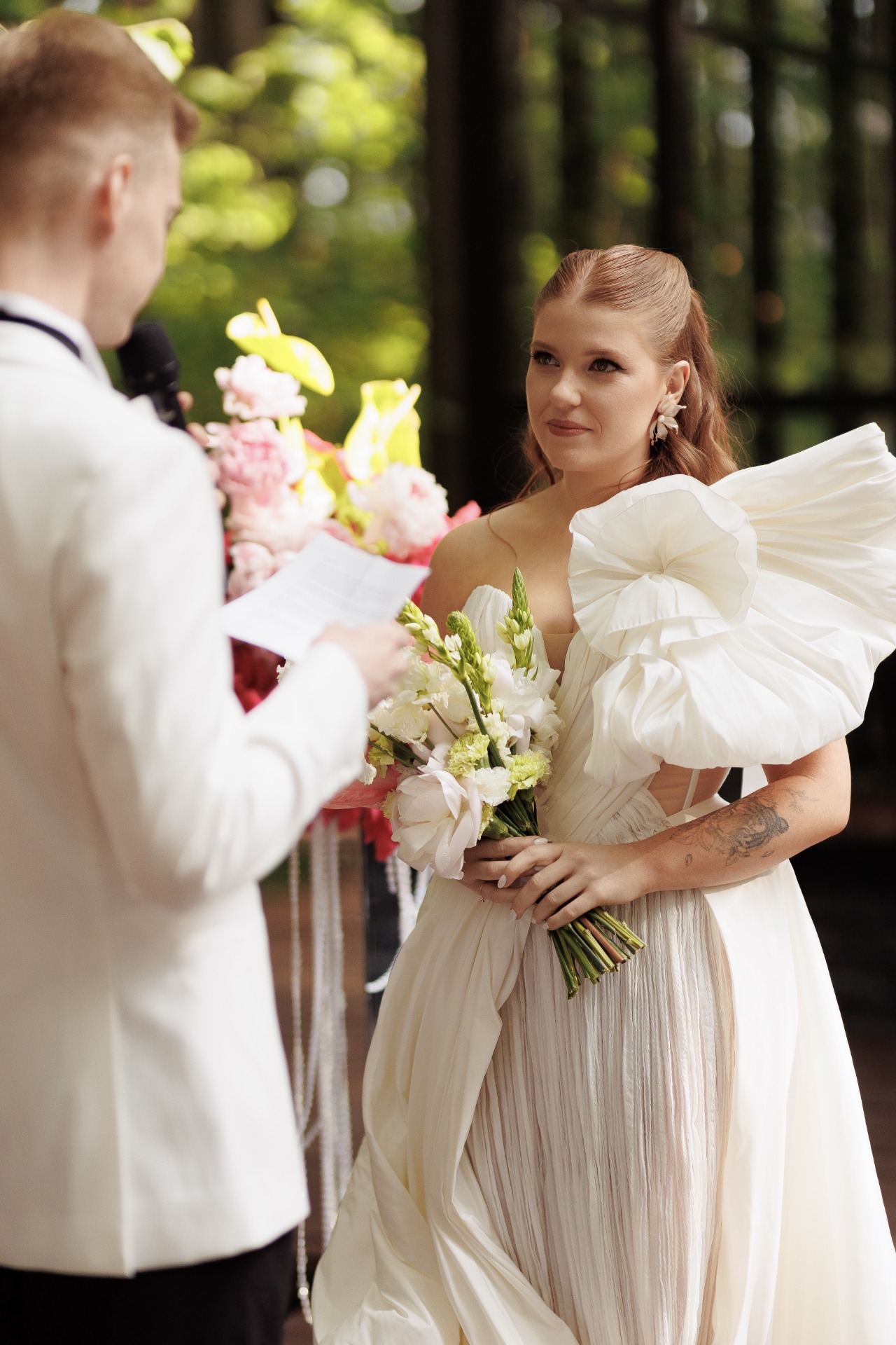 Наш день прошёл, как в сказке, но с нотками настоящей жизни. Церемония была на двух языках: испанском и русском, потому что моя семья, в основном, испанцы, а мама — русская. Серёжа полгода учил испанский специально для этого дня и свою клятву произнёс на двух языках, это было очень трогательно и круто. Кольца принёс наш верный друг — собака Арчи, и это добавило ещё больше тепла и уюта моменту.