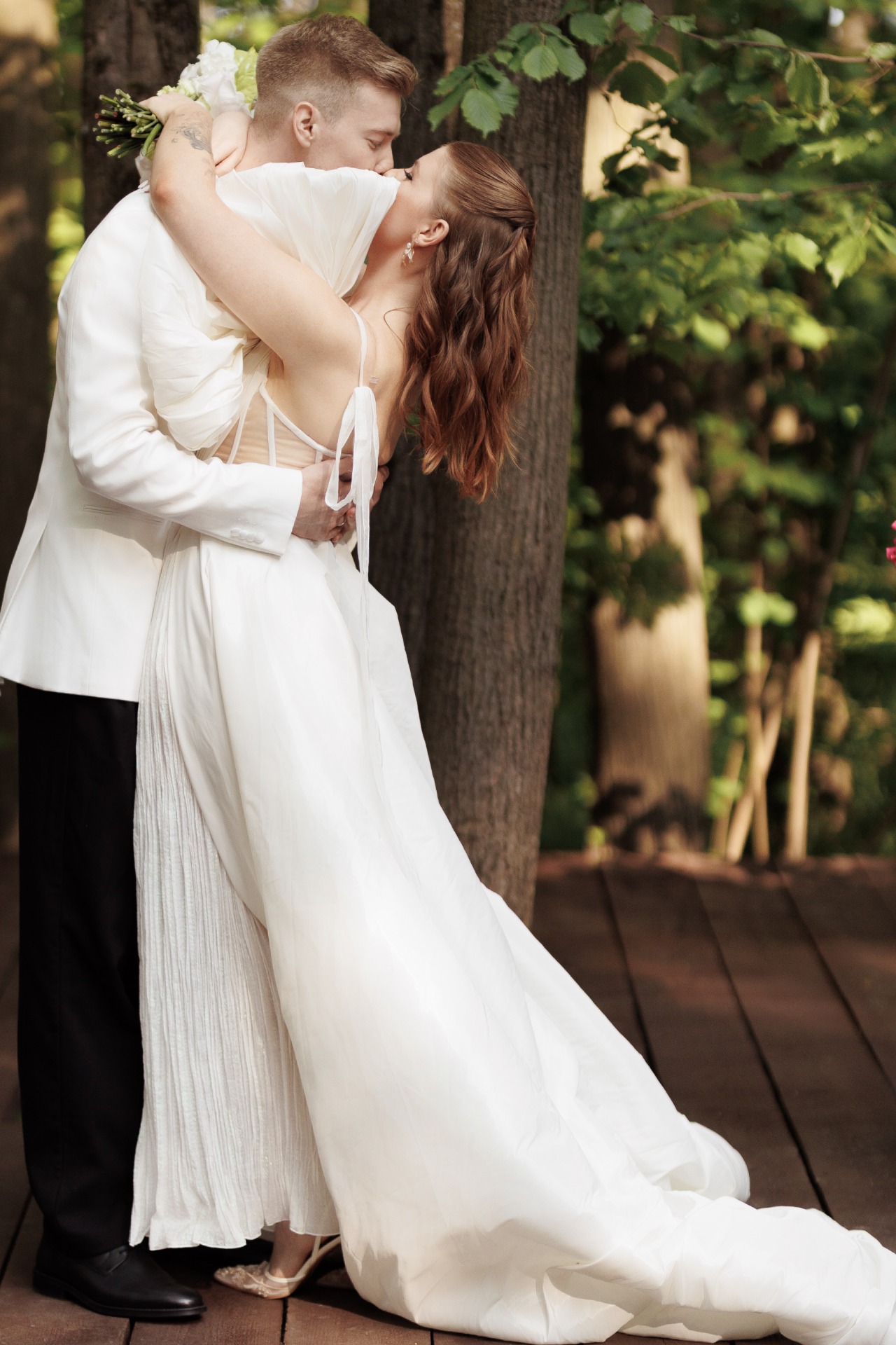 Изначально я мечтала о платье-трансформере, чтобы менять образы в течение дня. Мы наняли дизайнера, всё шилось индивидуально для меня. Но за месяц до свадьбы я пошла с подругами в салон, просто «примерить что-нибудь другое». И уже на третьем платье поняла: я влюбилась. Это было оно. Перламутровое платье от Rara Couture, найденное в Kuraje в Москве. Я не смогла уйти без него. Так я нашла своё платье мечты.