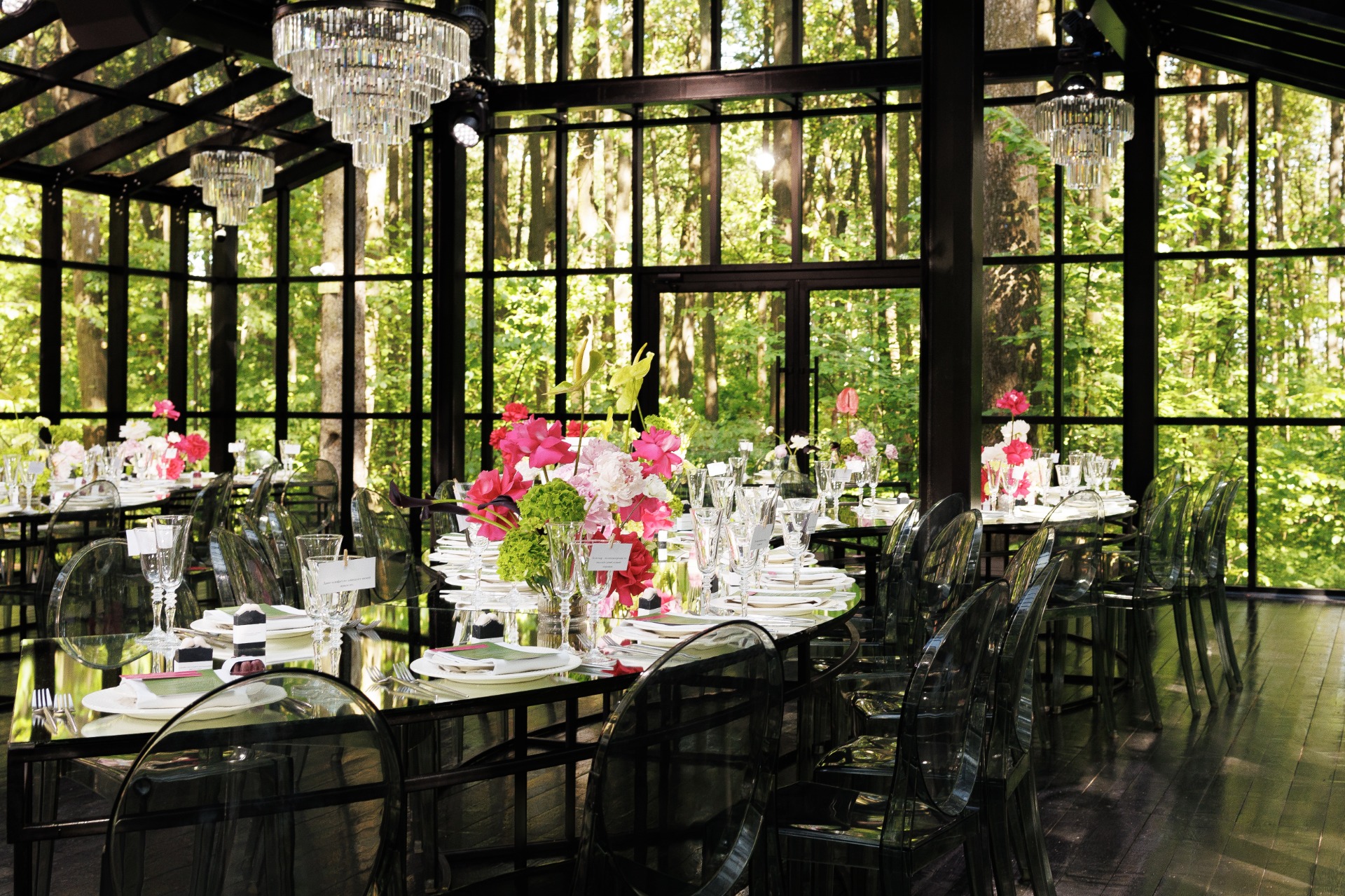 Над декором я долго размышляла и решила сыграть на контрасте: стеклянные столы в форме змейки и яркие цветочные композиции. Пространство заиграло: стало лёгким и живым. Мы заказали профессиональный свет, и лучи солнца играли на стекле и лепестках. Всё выглядело, как поле цветов на закате.