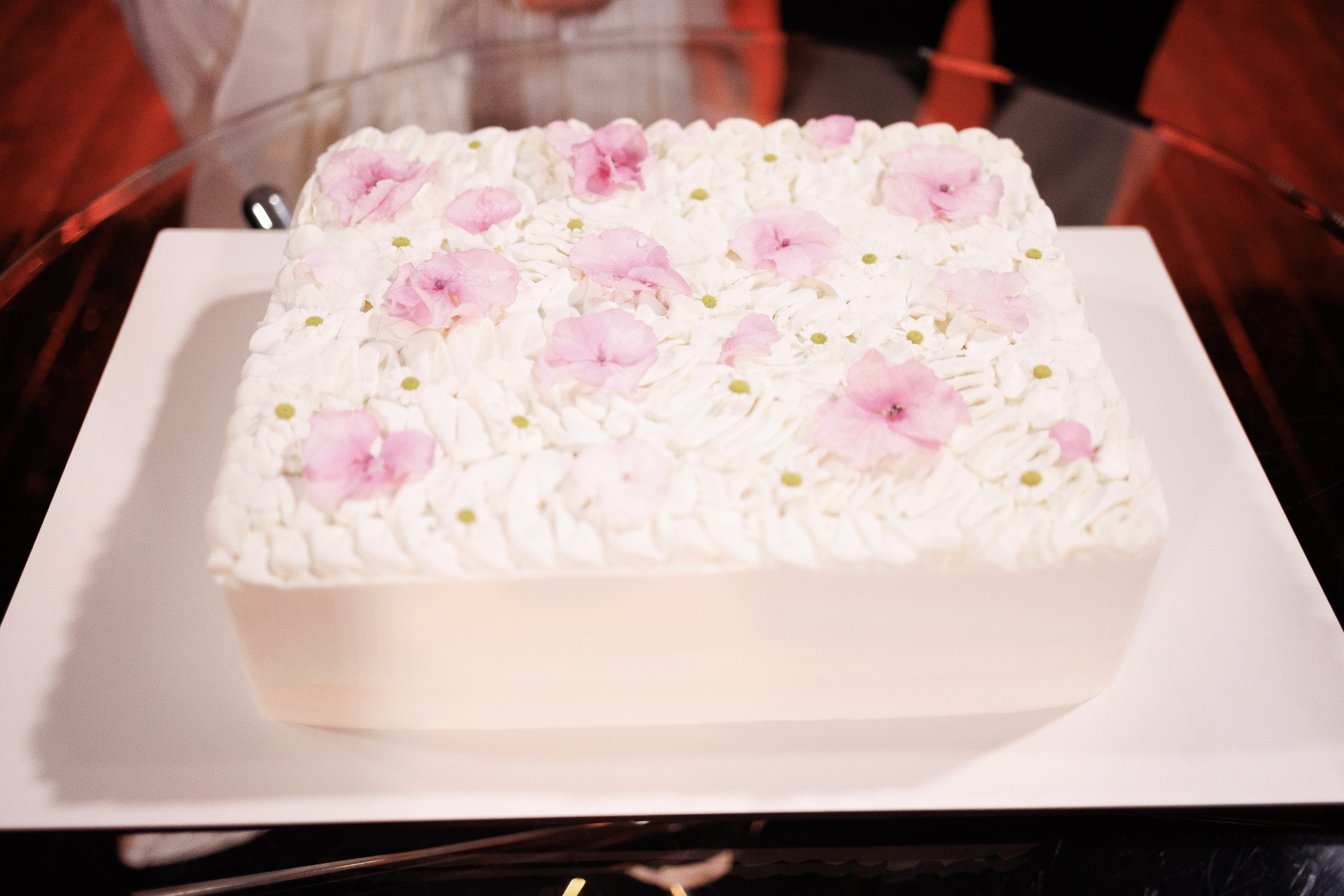 Торт был квадратным, украшенным живыми цветами, что полностью соответствовало концепции.