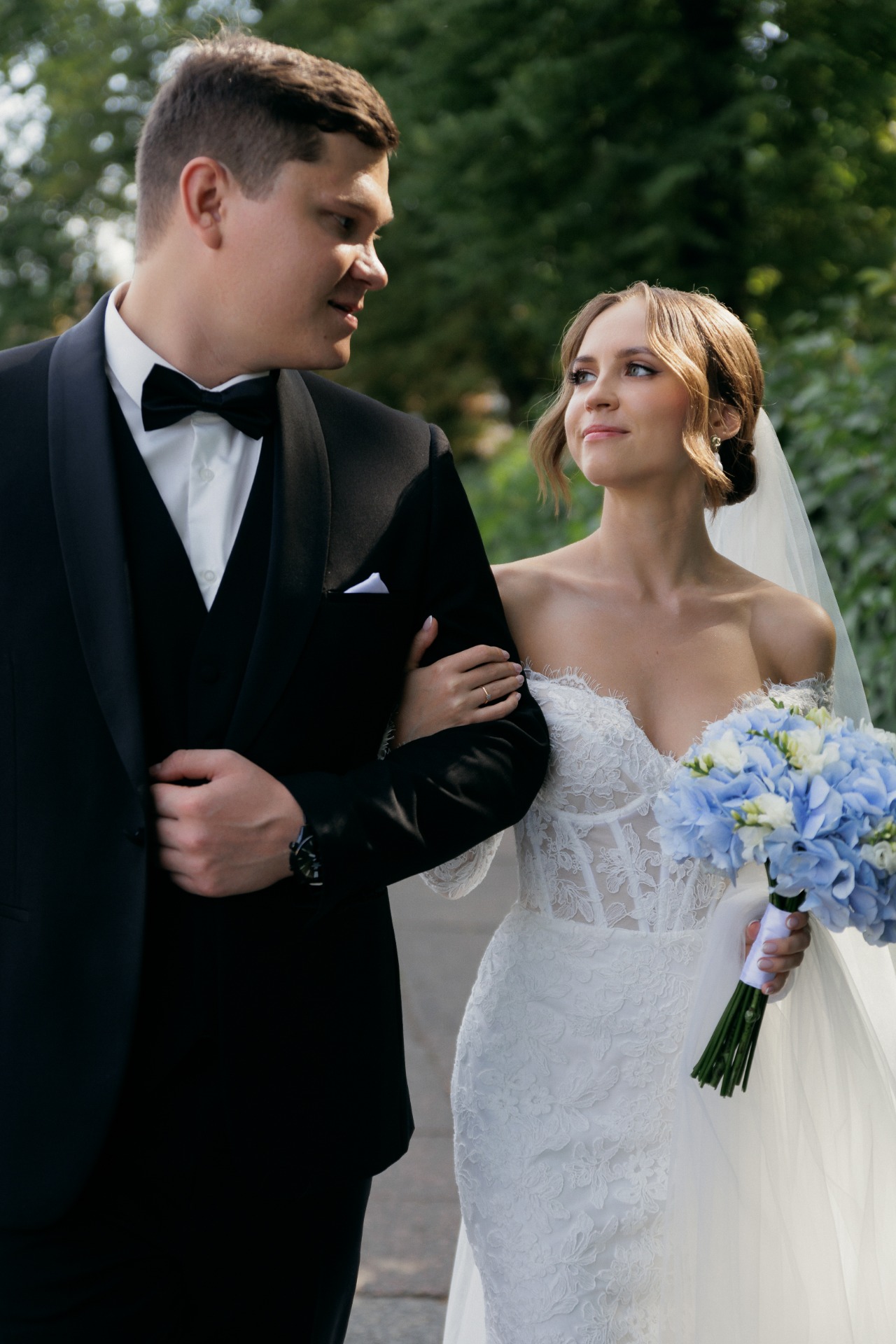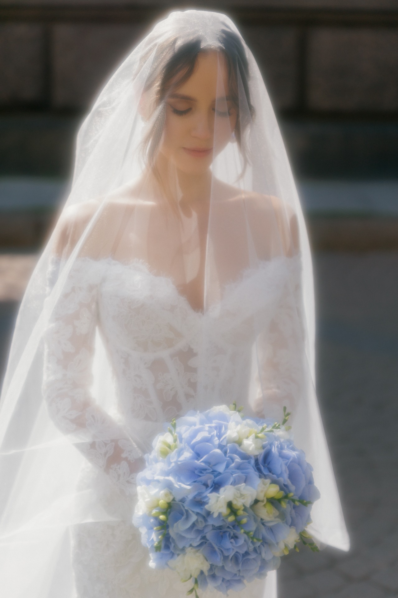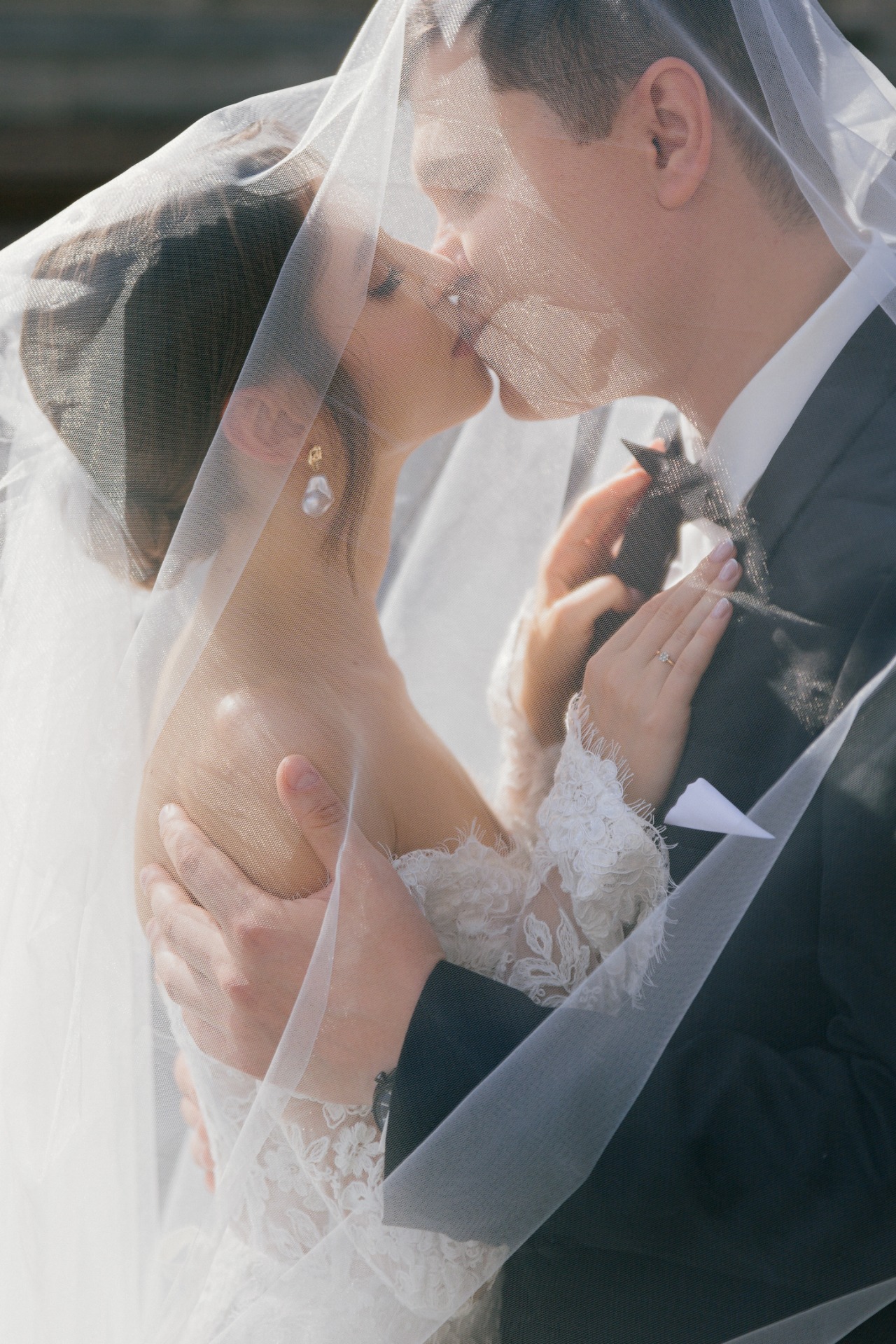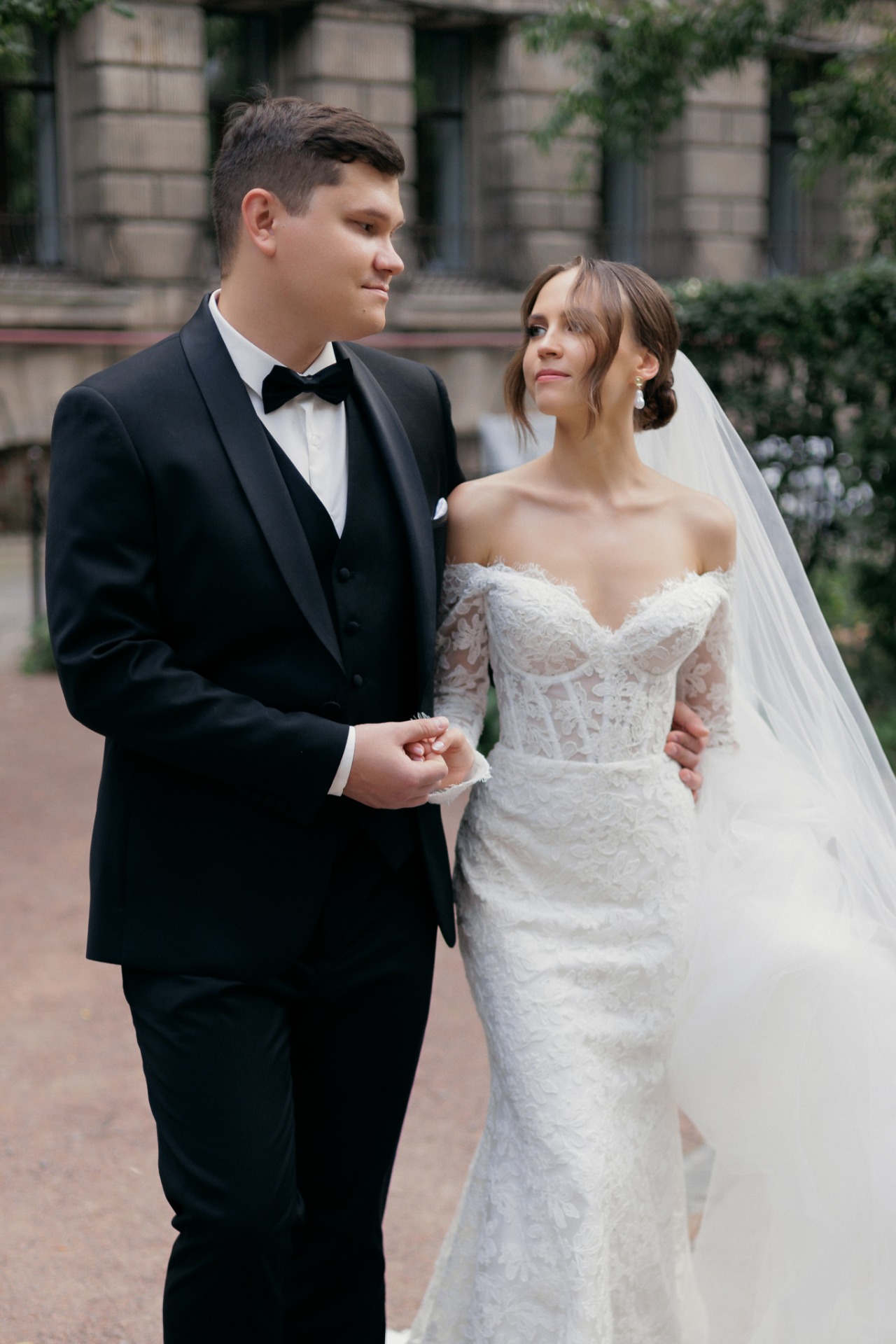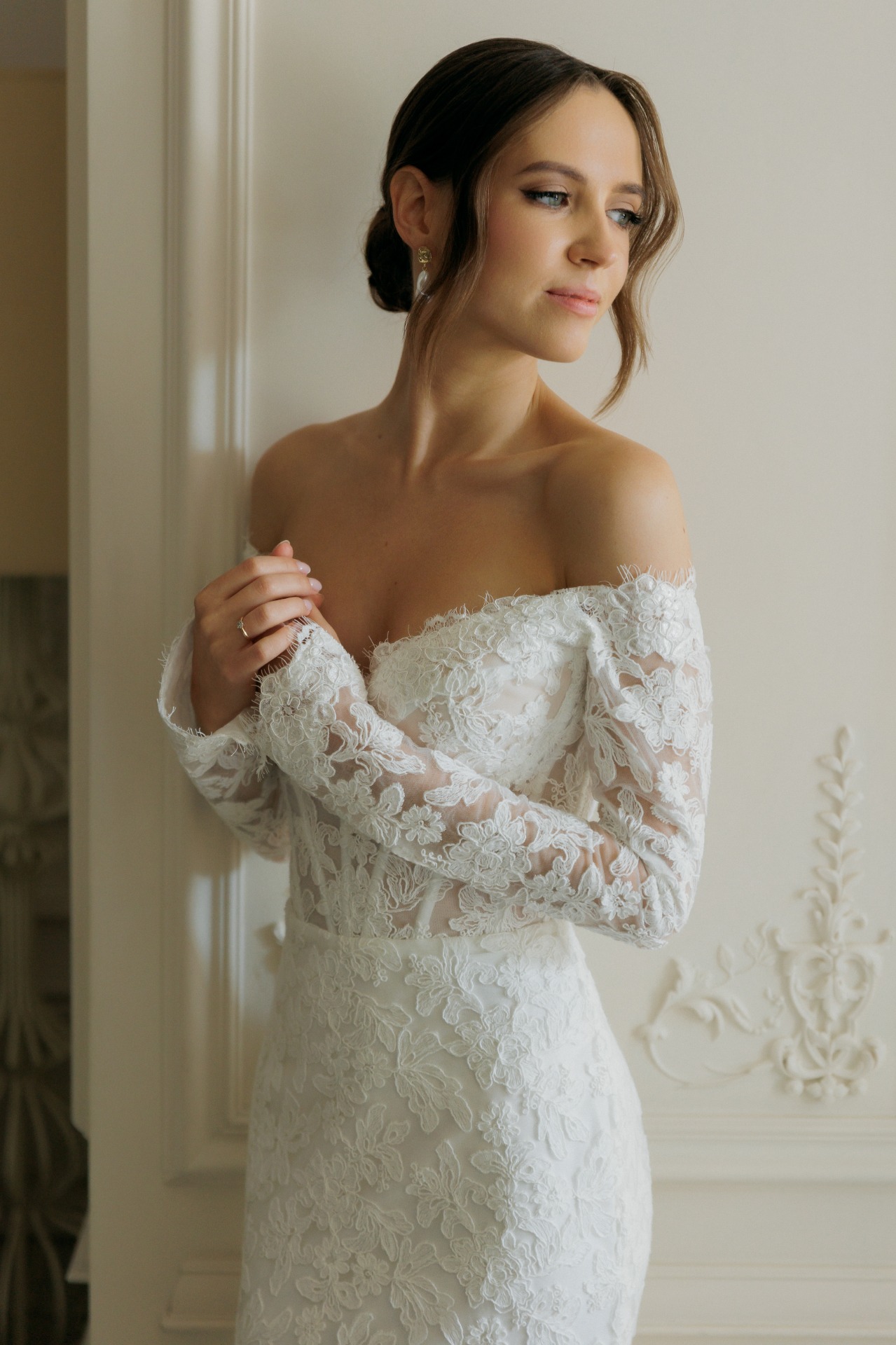 Предпочтение отдала кружевному платью с длинными рукавами и открытыми плечами — нежное, изящное, элегантное. К нему сшила длинную и пышную перекидную фату, дополнила образ серьгами с барочным жемчугом.