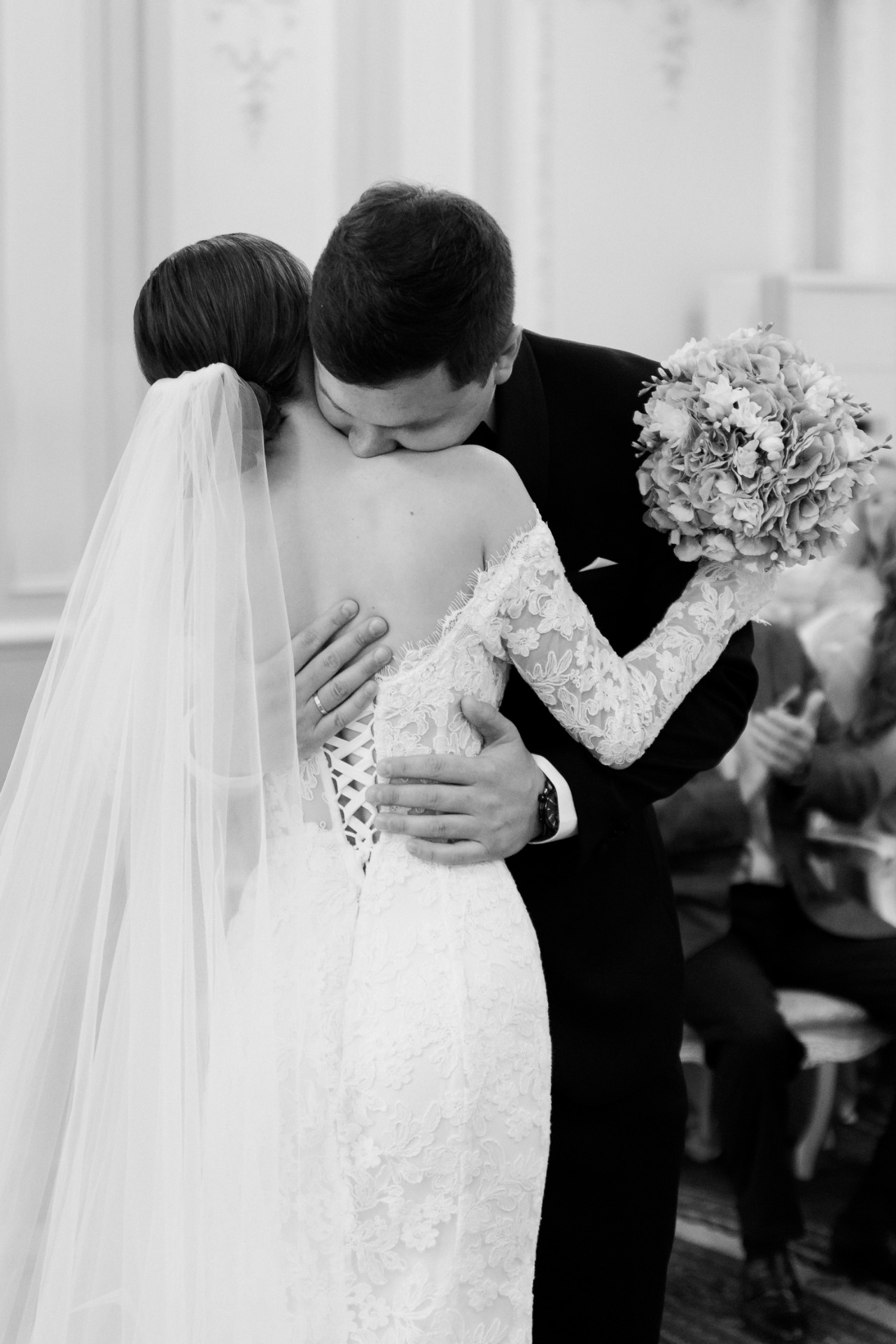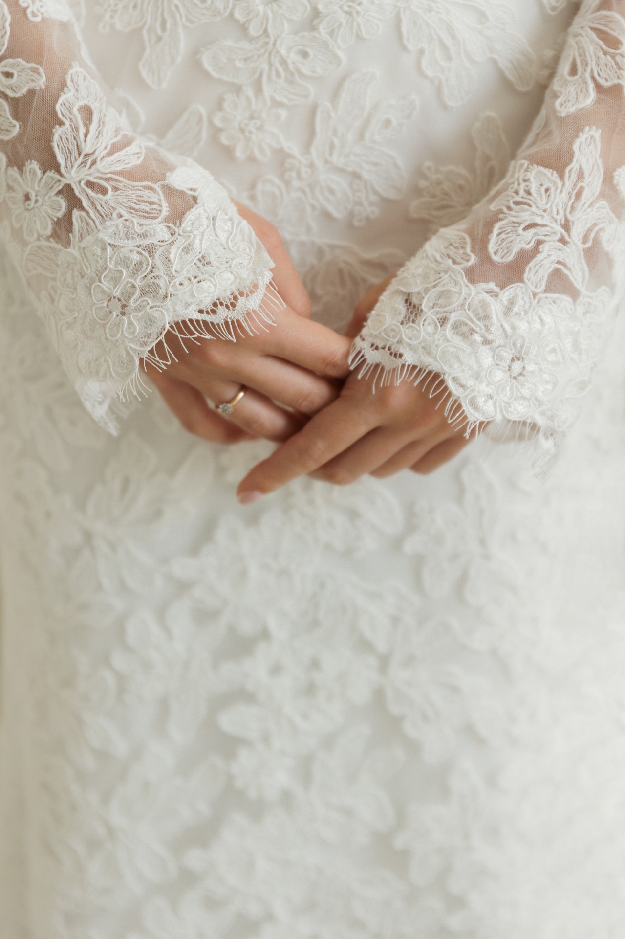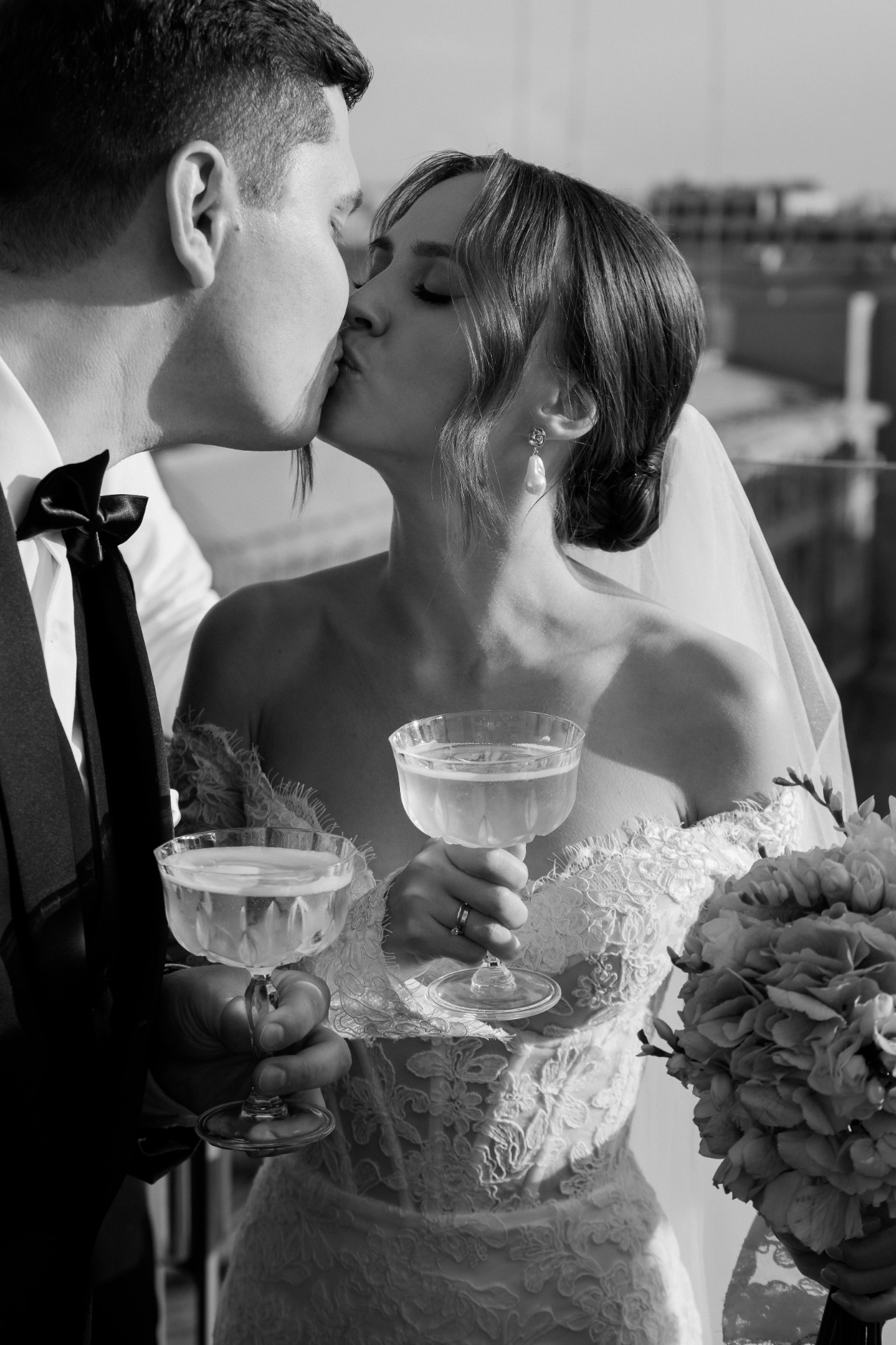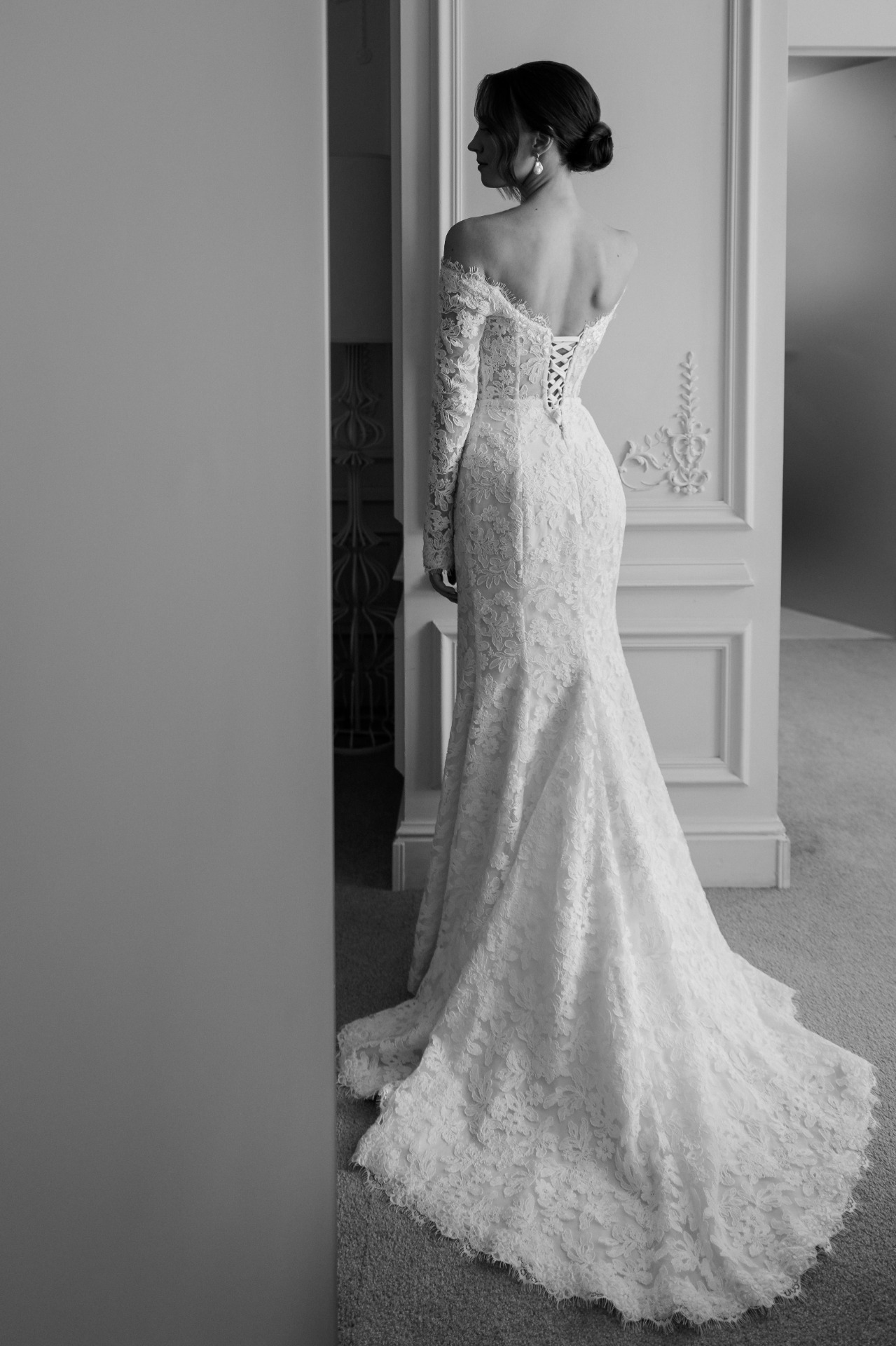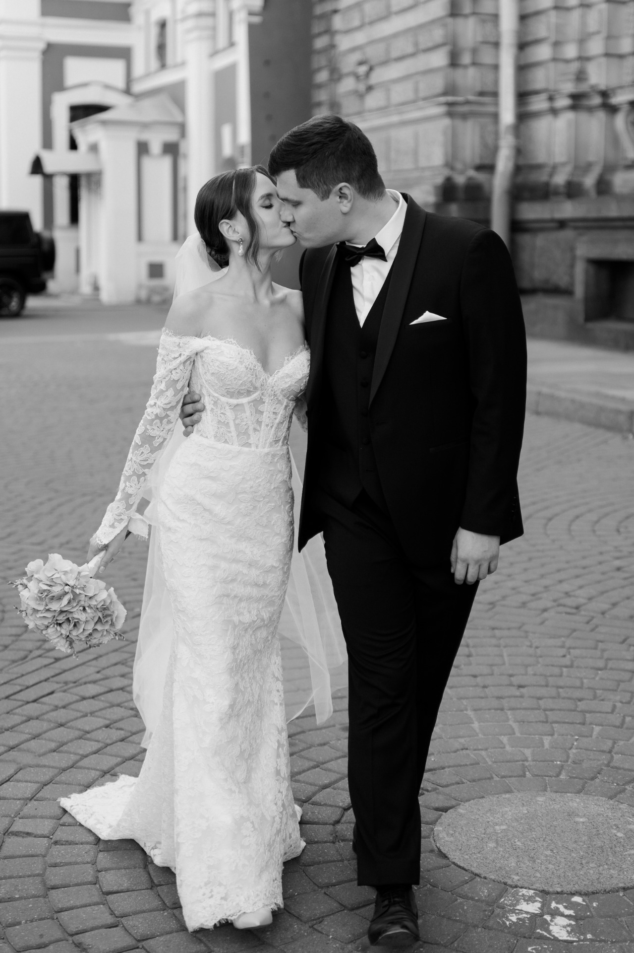 Предпочтение отдала кружевному платью с длинными рукавами и открытыми плечами — нежное, изящное, элегантное. К нему сшила длинную и пышную перекидную фату, дополнила образ серьгами с барочным жемчугом.