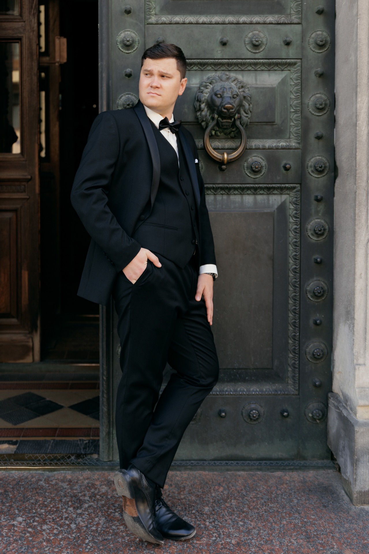 Что касается костюма на свадьбу — жених выбрал классический чёрный смокинг.
