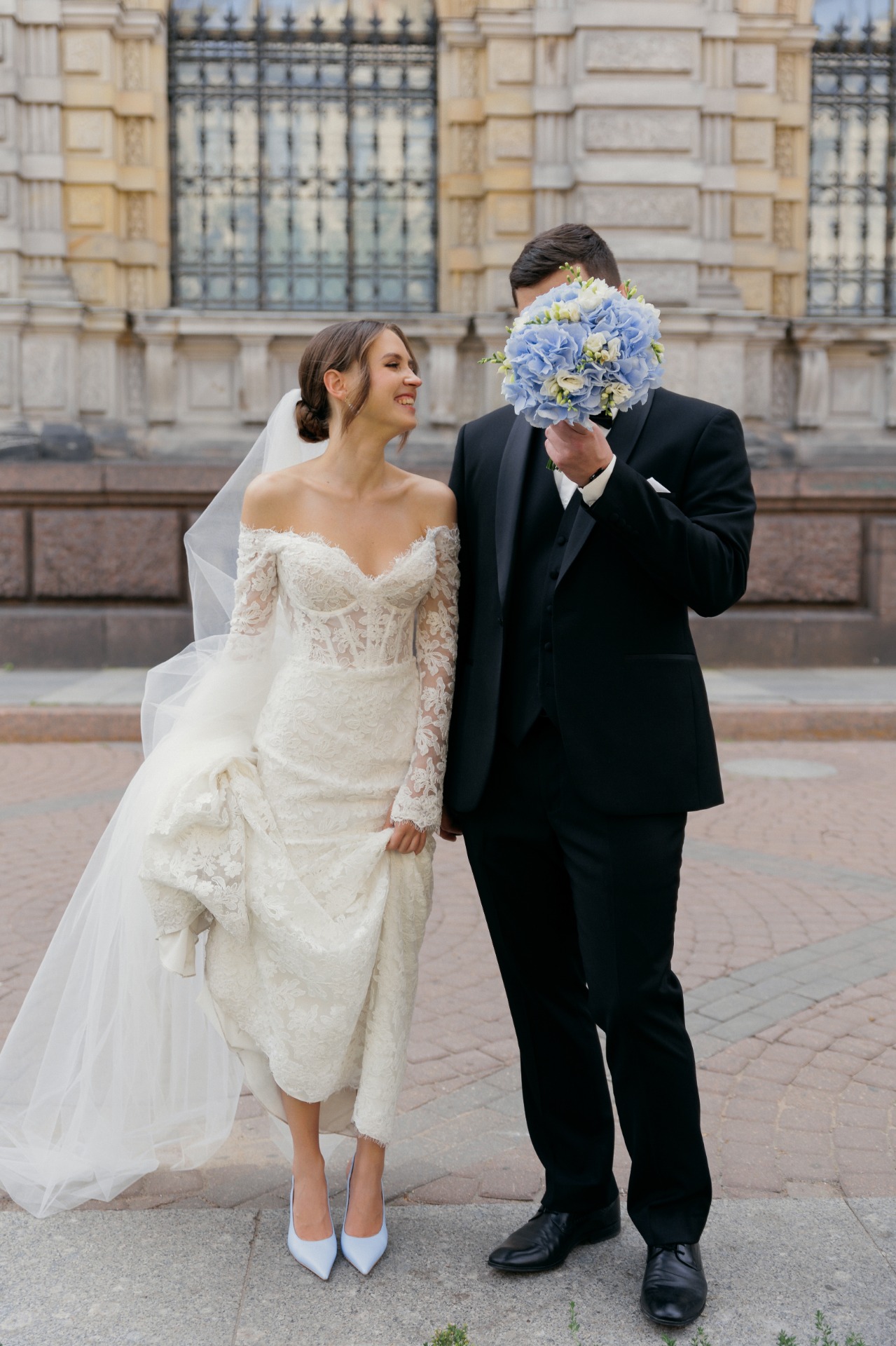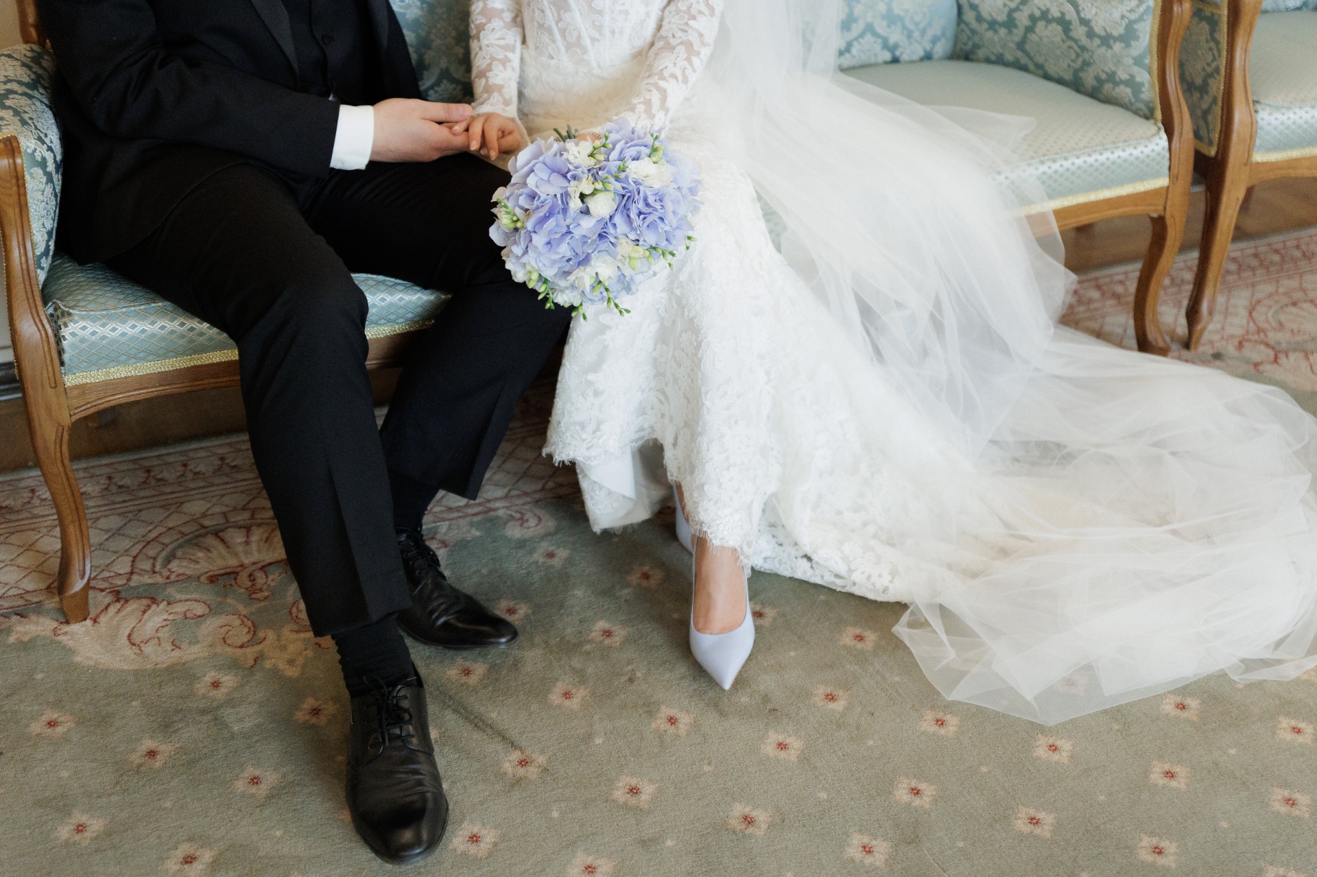 Ещё до выбора платья я решила, что хочу сделать акцент на обуви и букете. Всегда мечтала, что это будут мои любимые голубые гортензии! Также решила добавить к букету фрезии. А в тон к цветам подобрала туфли нежно-голубого цвета.