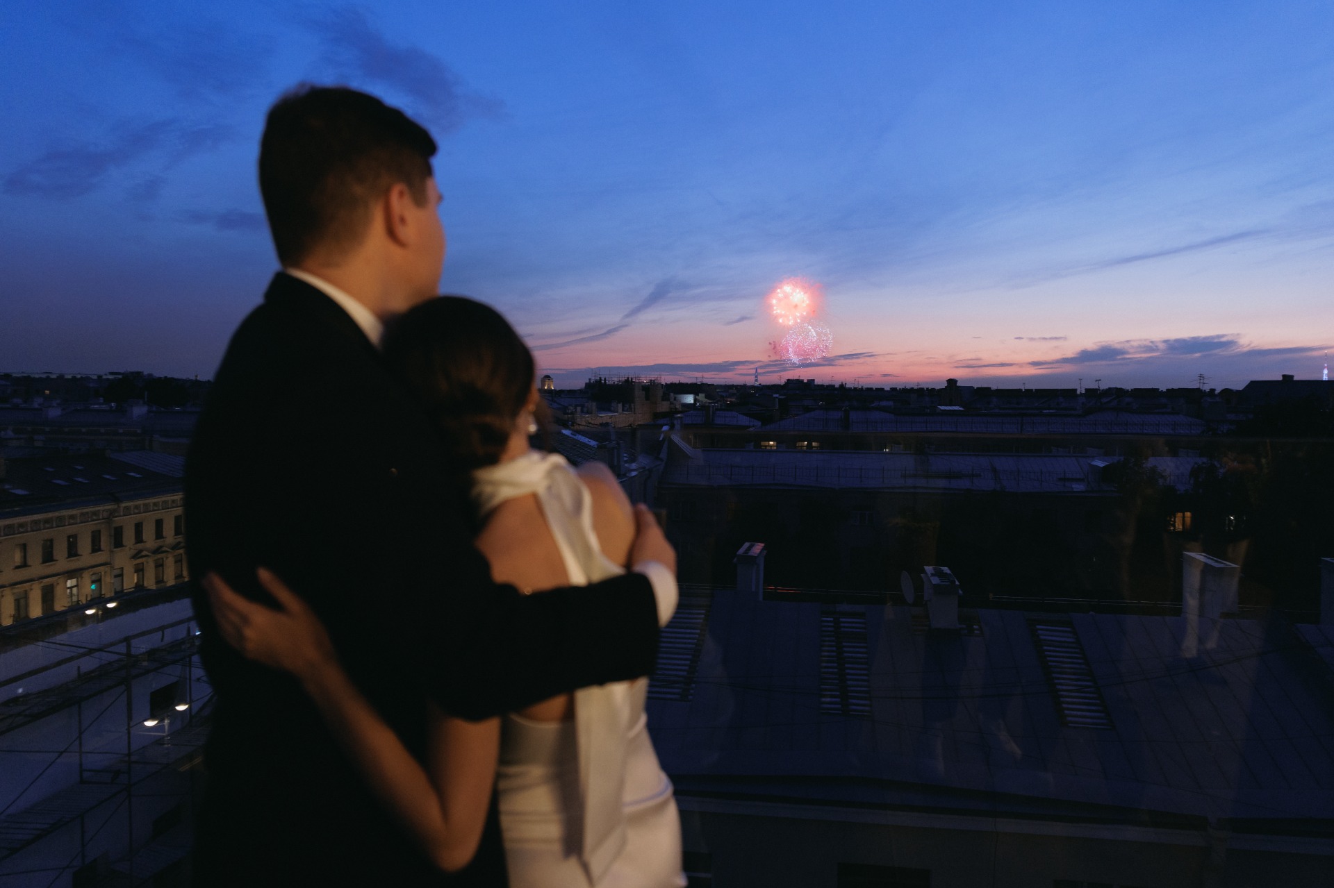 В качестве бонуса за принесенные неудобства Петербург наградил нас красивейшим салютом, которым в завершении свадьбы мы наслаждались с террасы. Многие гости и не поняли, что фейерверк был не по случаю нашего торжества, а в честь дня ВМФ! :)