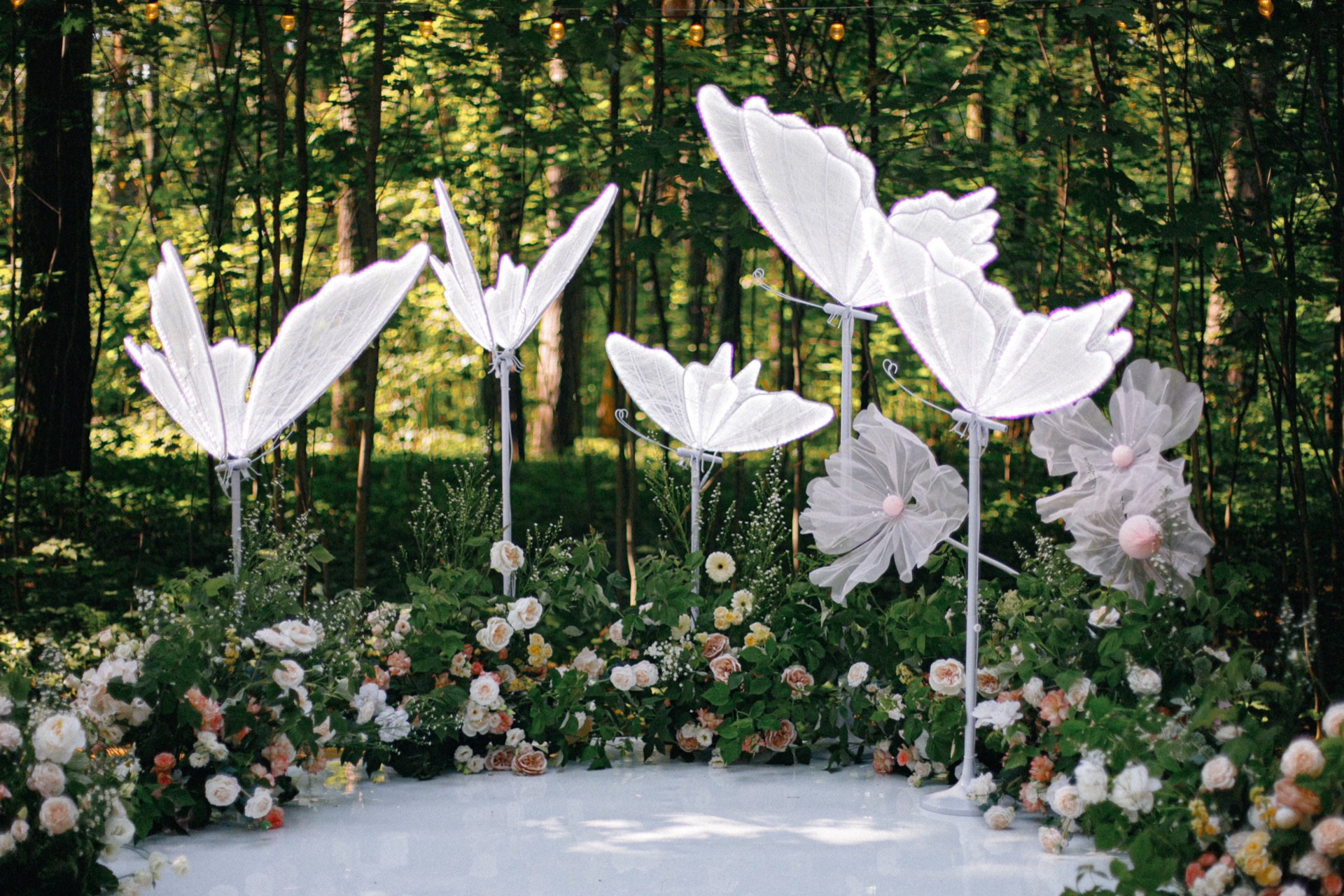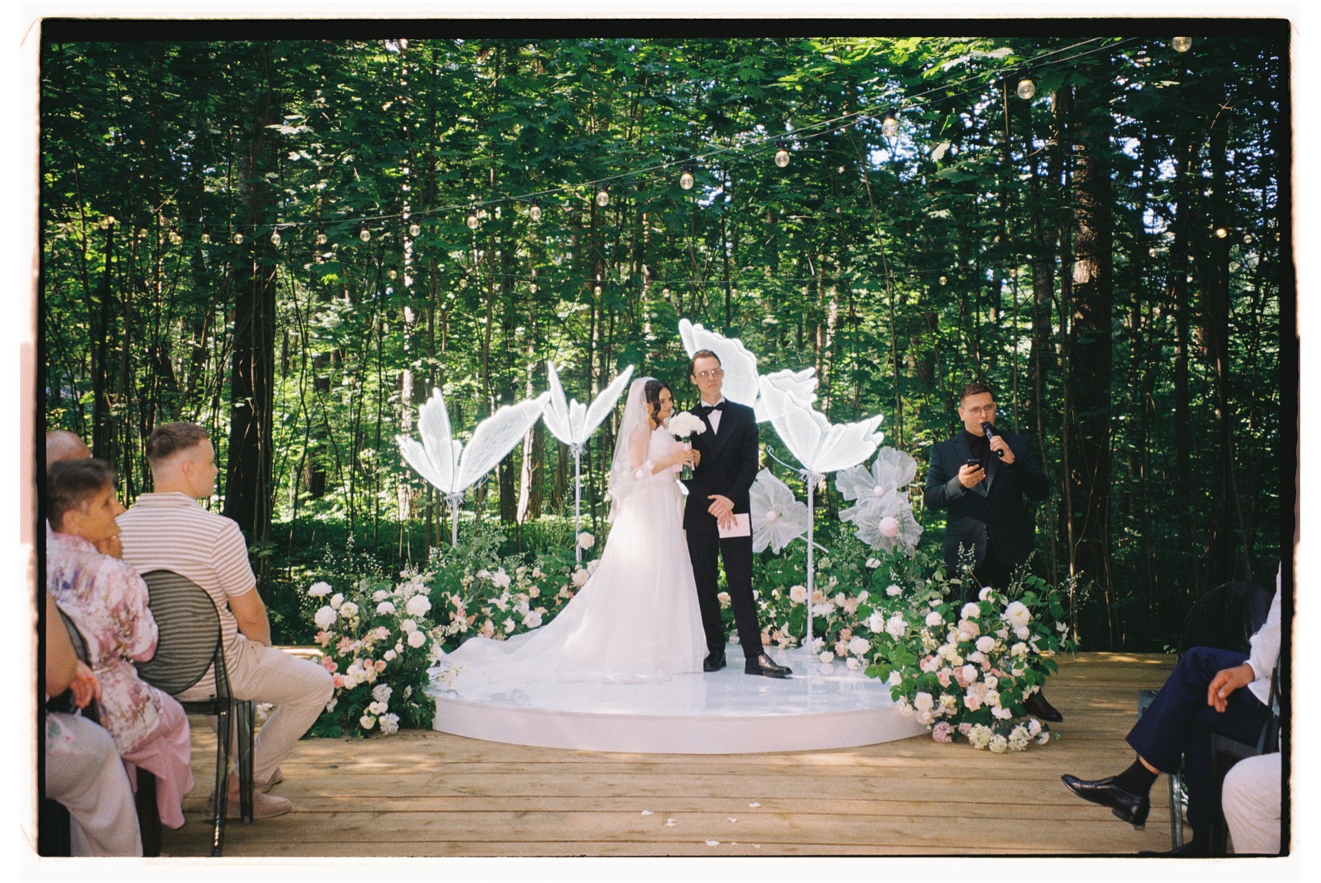Изначально мы планировали зону церемонии с двухметровыми цветами, но потом увидели больших светящихся бабочек и сразу поняли: это именно то, что нужно. Бабочки стали символом нового начала, в нашем случае — рождения семьи.