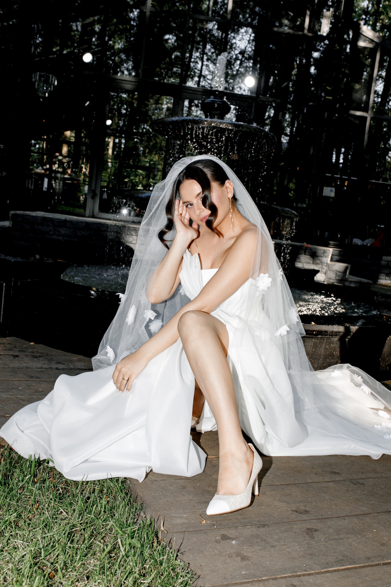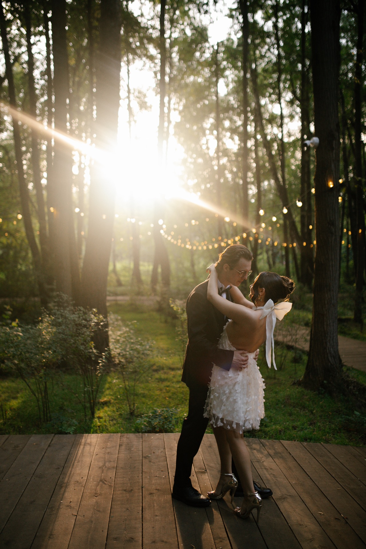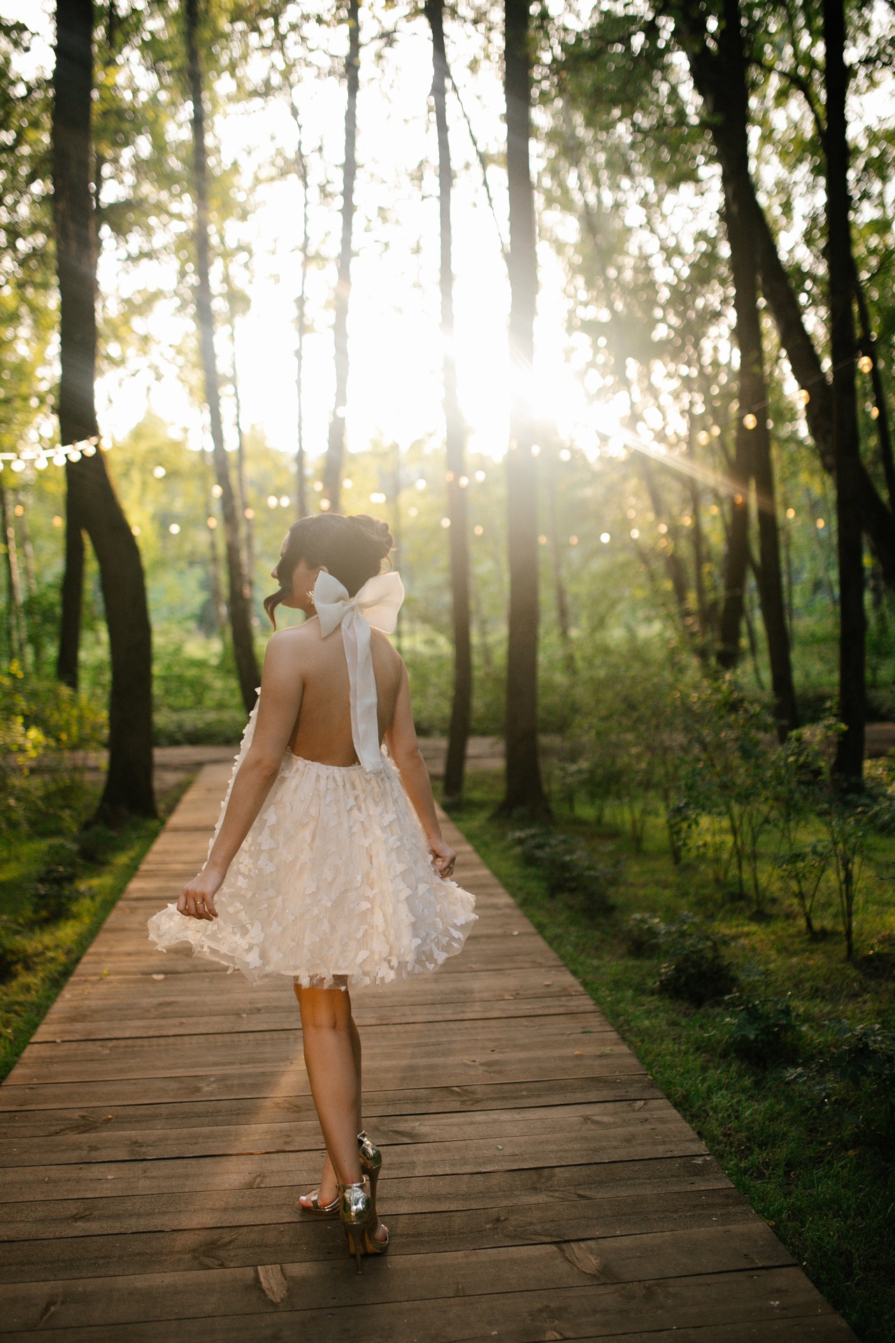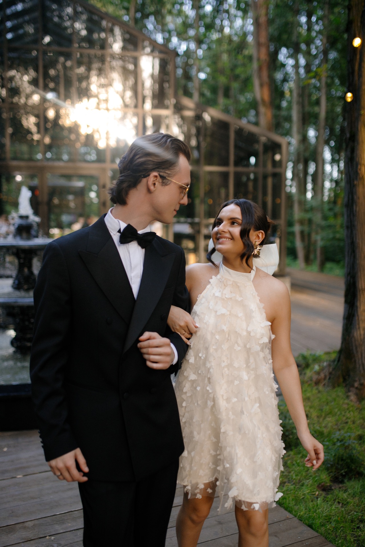 Для церемонии — длинное платье со шлейфом. Лаконичное, с верхом, напоминающим лепестки. К нему моя бабушка сшила фату и расшила её маленькими цветами. Это, пожалуй, самая трогательная и значимая деталь в моём образе, я буду хранить её ещё долгие годы. Второй образ — короткое платье, полностью расшитое бабочками. Оно стало отличной отсылкой к оформлению зоны церемонии, хотя я выбрала его ещё до того, как мы определились с декором.