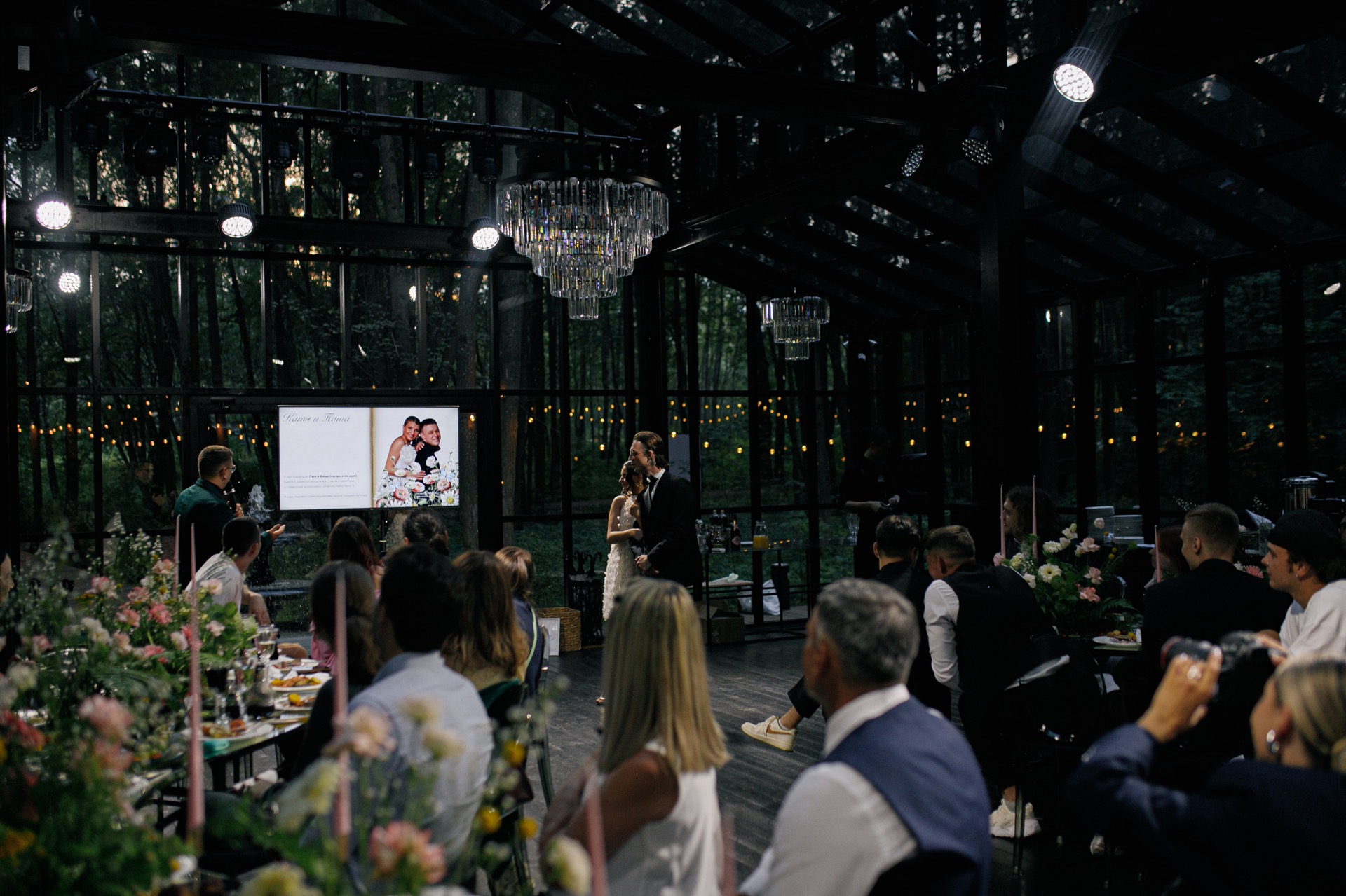 Перед первым танцем на большом экране мы показали видео нашего выпускного вальса, оно плавно перешло в наш первый свадебный танец.