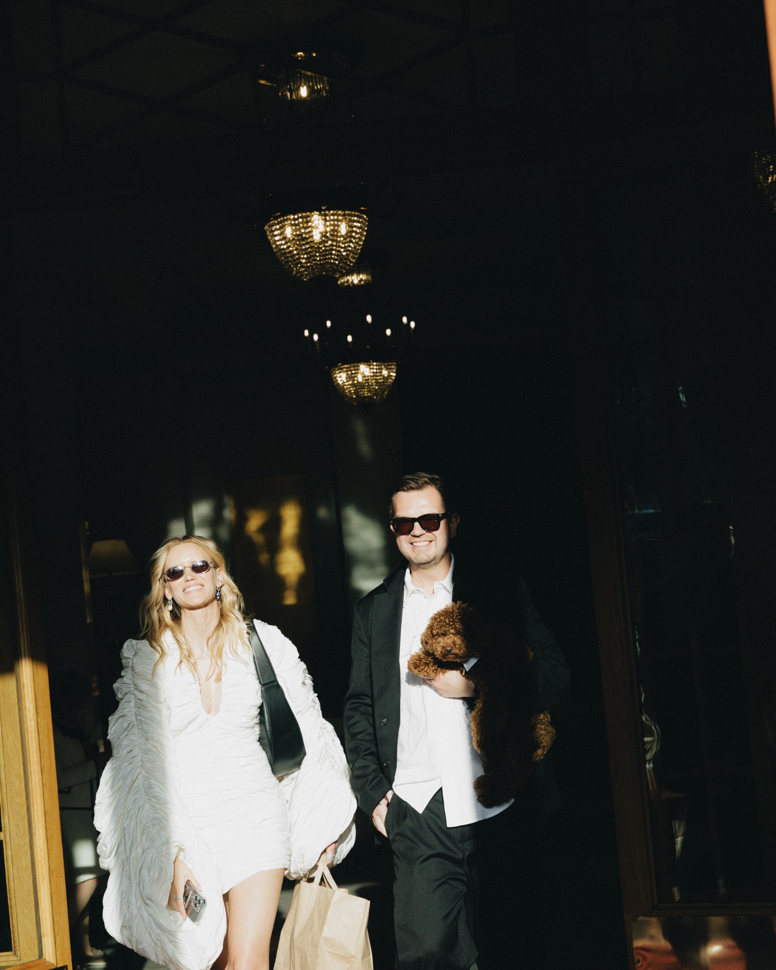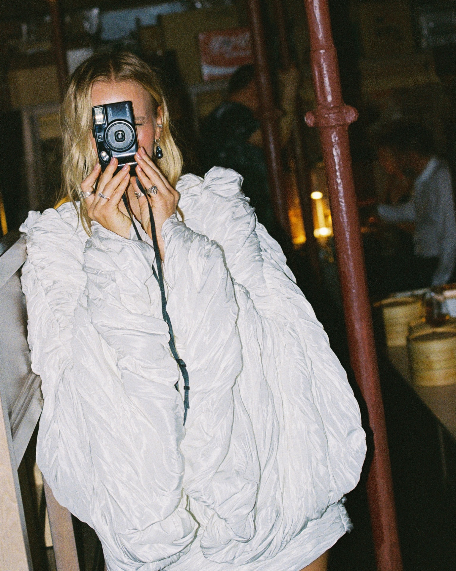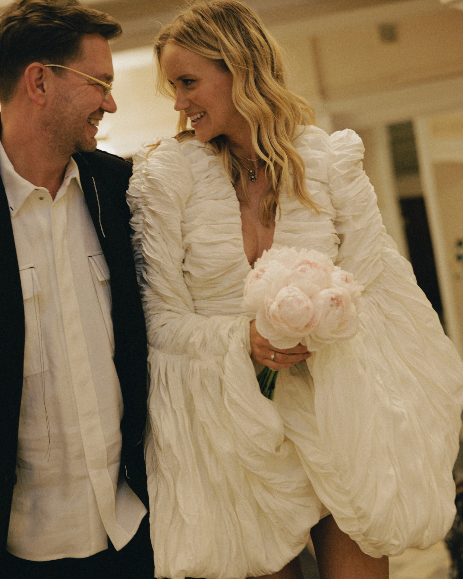 Я остановилась на единственном платье — воздушном, но дерзком мини от Murashka из нежной тафты с огромными рукавами. Туда гости, кстати, складывали конверты с подарками :)