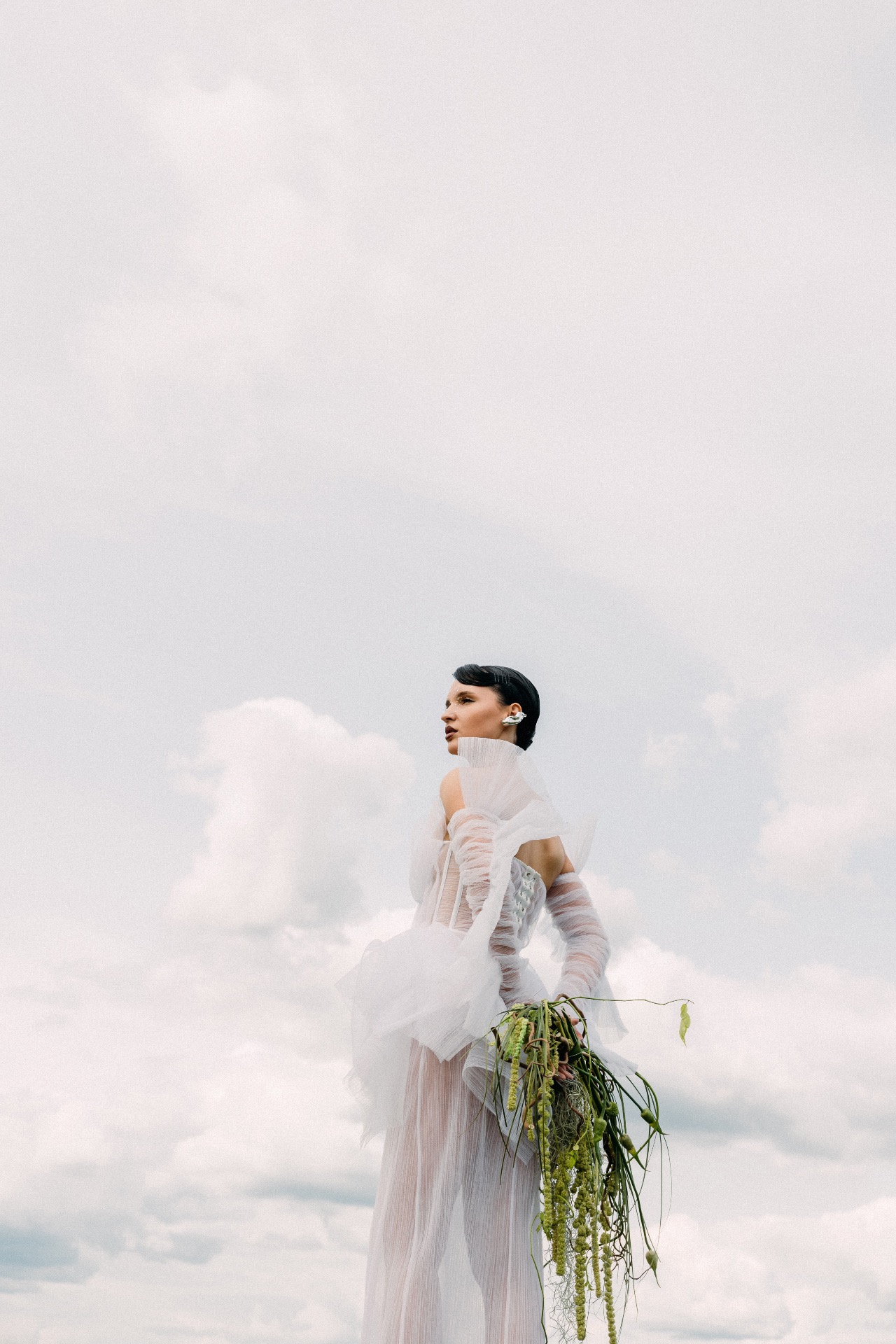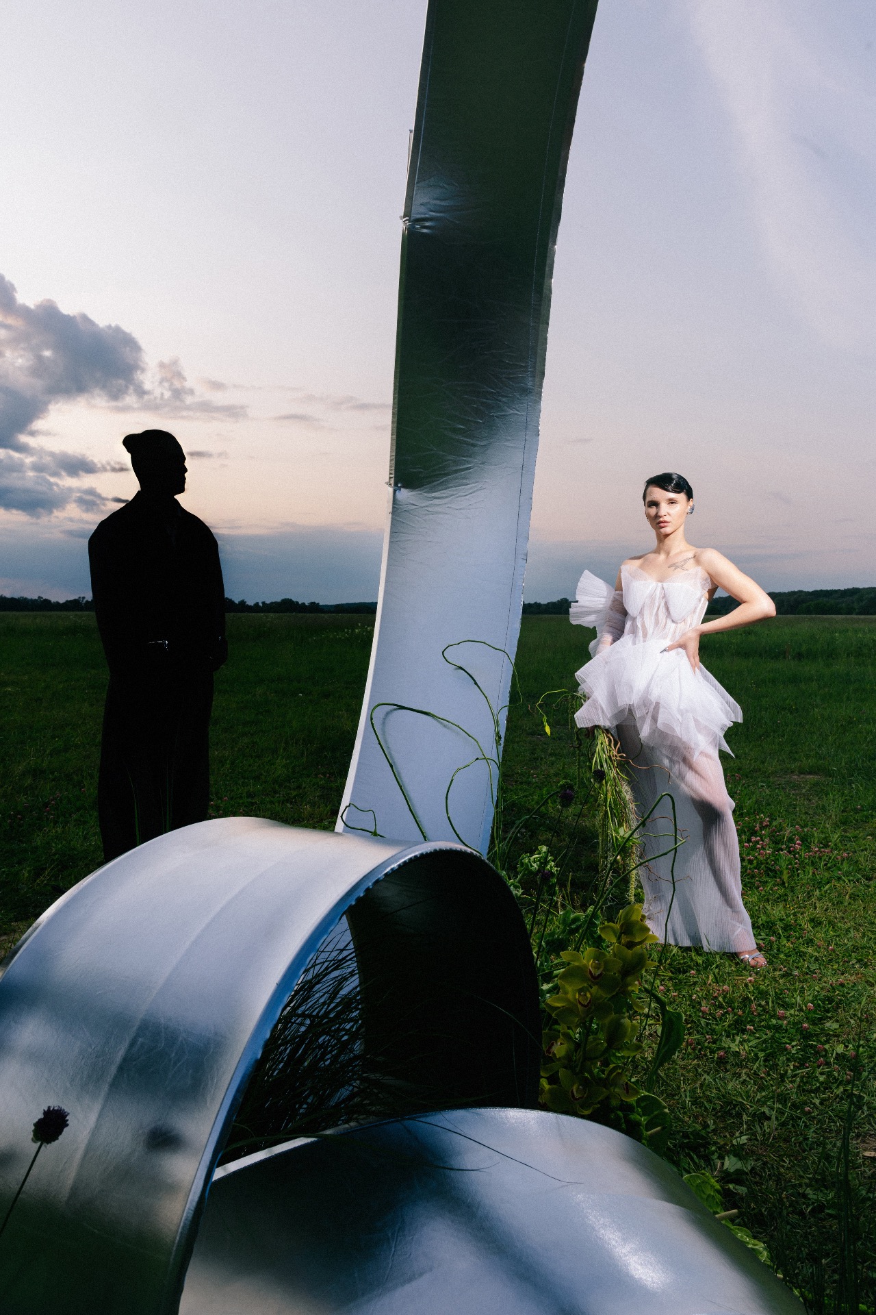 Поскольку я выбрала довольно акцентный наряд, мне не хотелось переборщить с аксессуарами. В тот момент мы уже утвердили с декоратором металлические конструкции в декоре, и я хотела поддержать эту идею в своём образе. Поэтому моё платье органично дополняли маникюр в цвете «металлик», серебристые босоножки и каф на ухе. В макияж я добавила небольшие стразы, чтобы создать ощущение французского шика. А в качестве причёски выбрала укладку с эффектом мокрых волос.