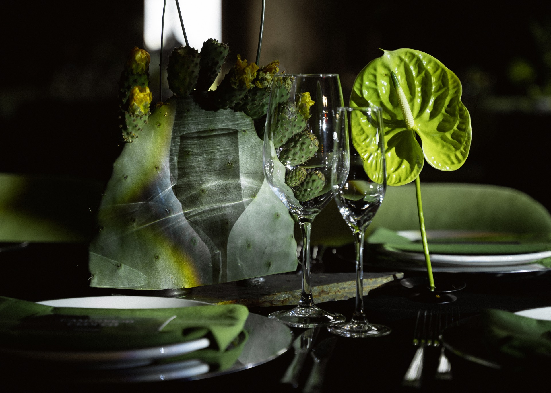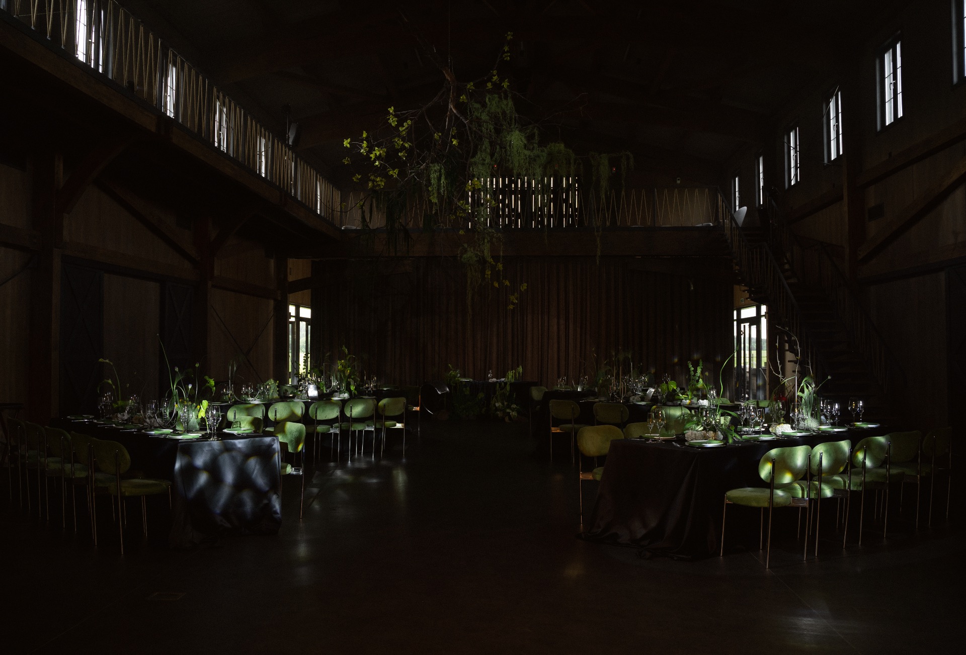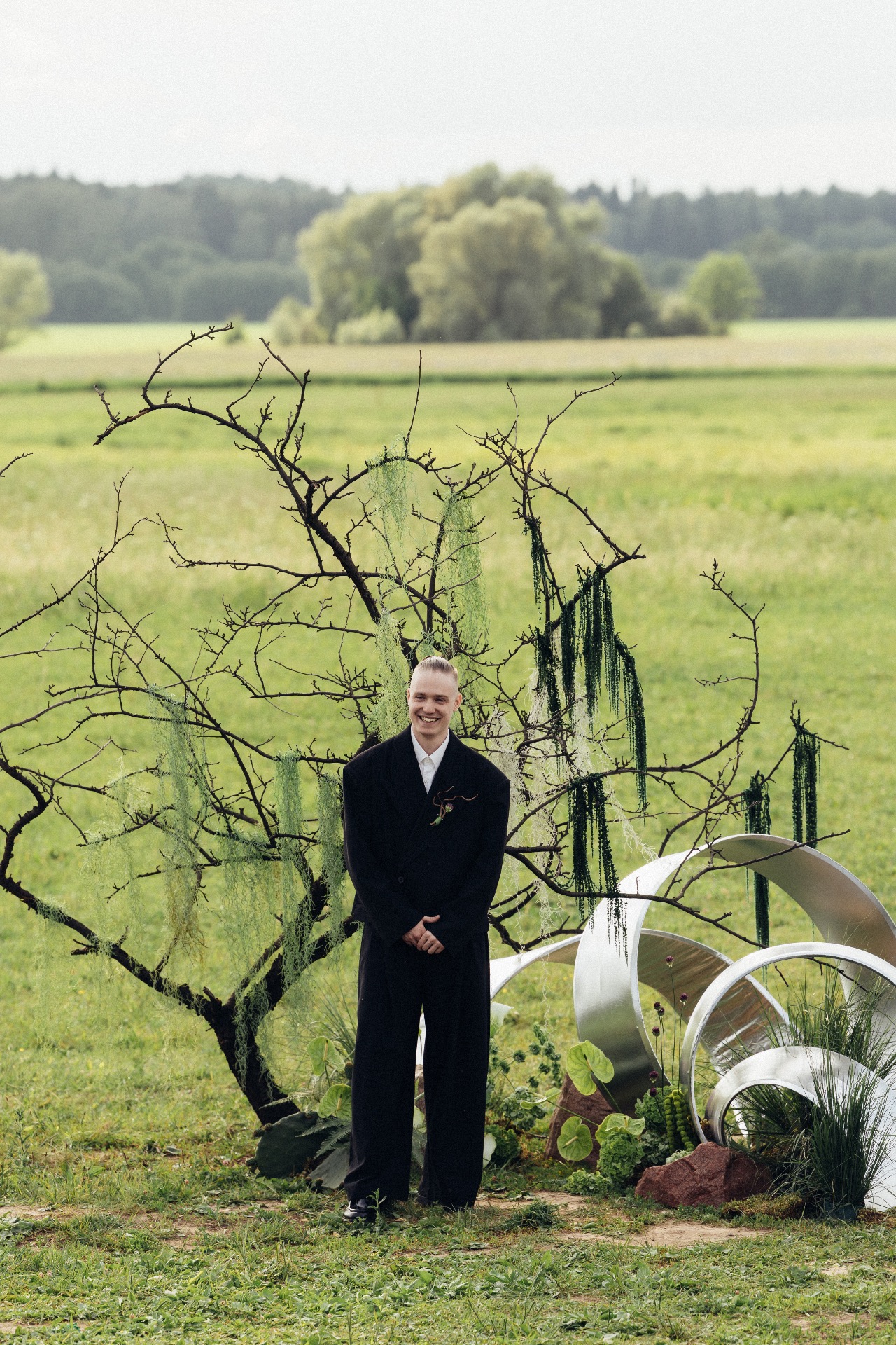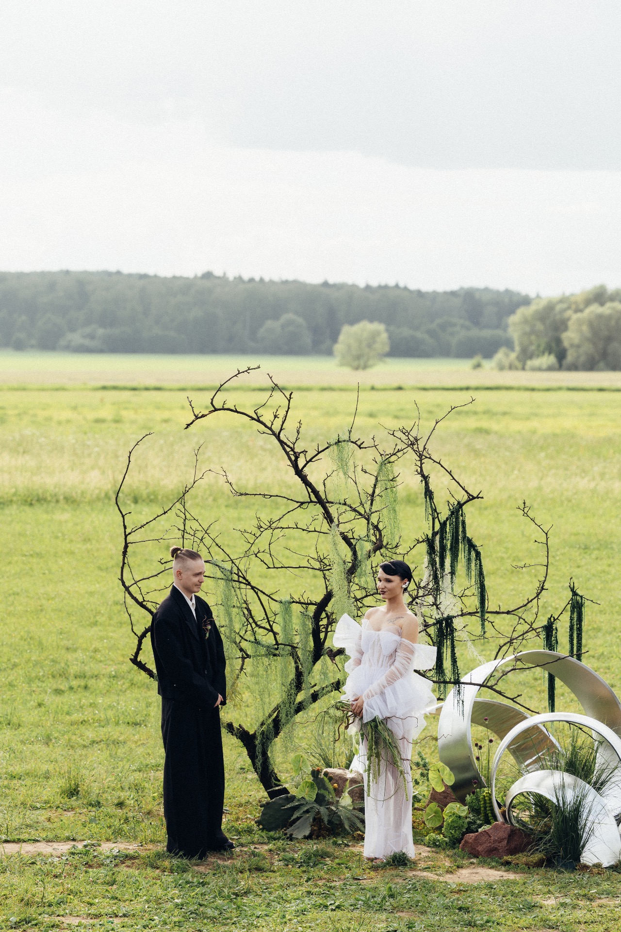 В качестве локации мы выбрали амбар в поле. Обычно его используют для свадеб в деревенской стилистике, но нам захотелось добавить роскоши. Вместо классических цветочных композиций мы придумали разместить кактусы, ветки и металлические конструкции. А декоратор предложила подвесить дерево на потолке банкетного зала, мы сразу согласились. Когда я увидела декор вживую, ожидание и реальность совпали полностью.