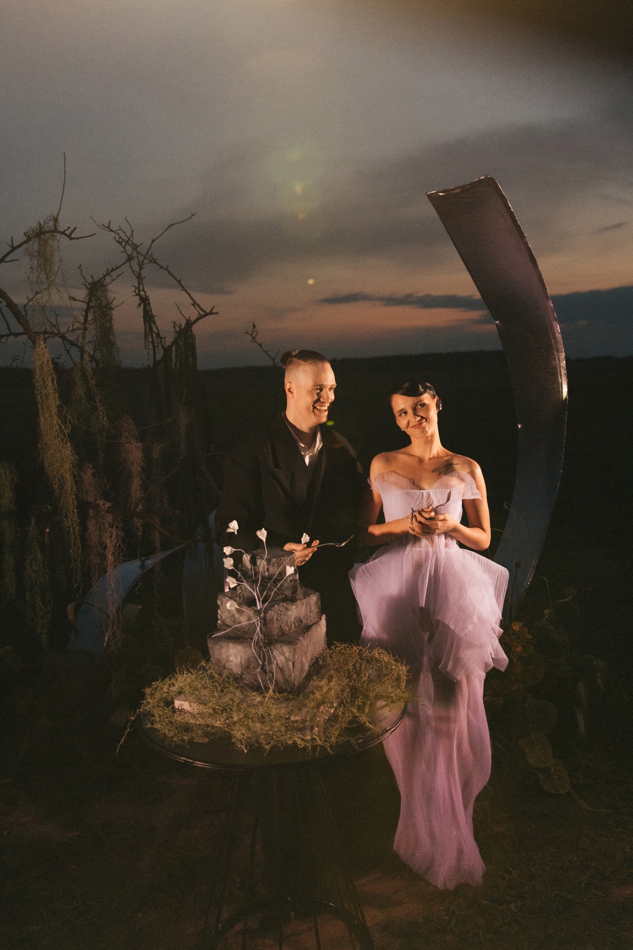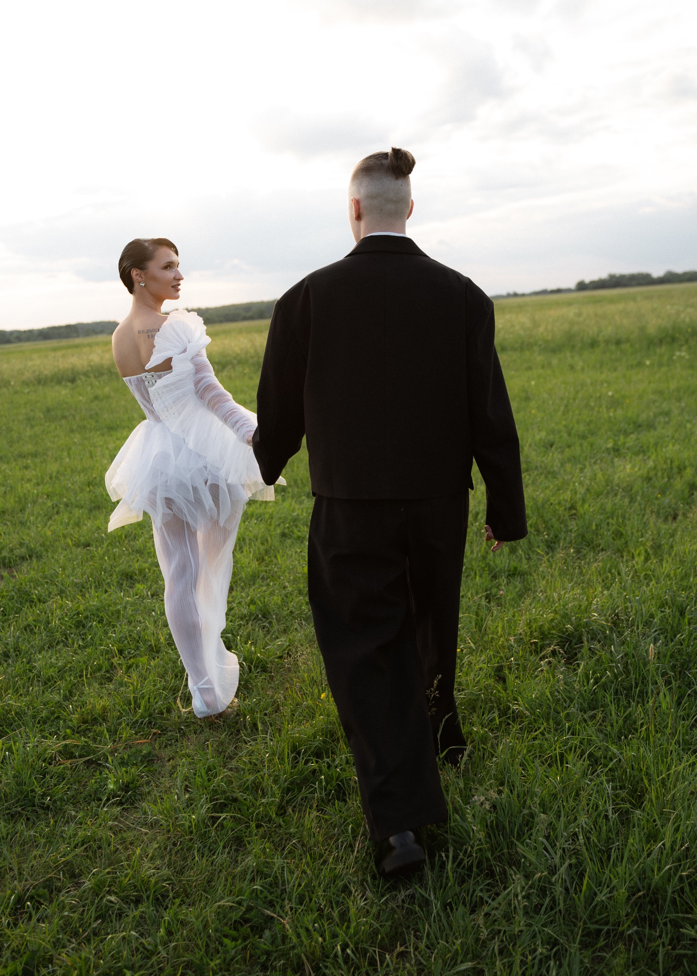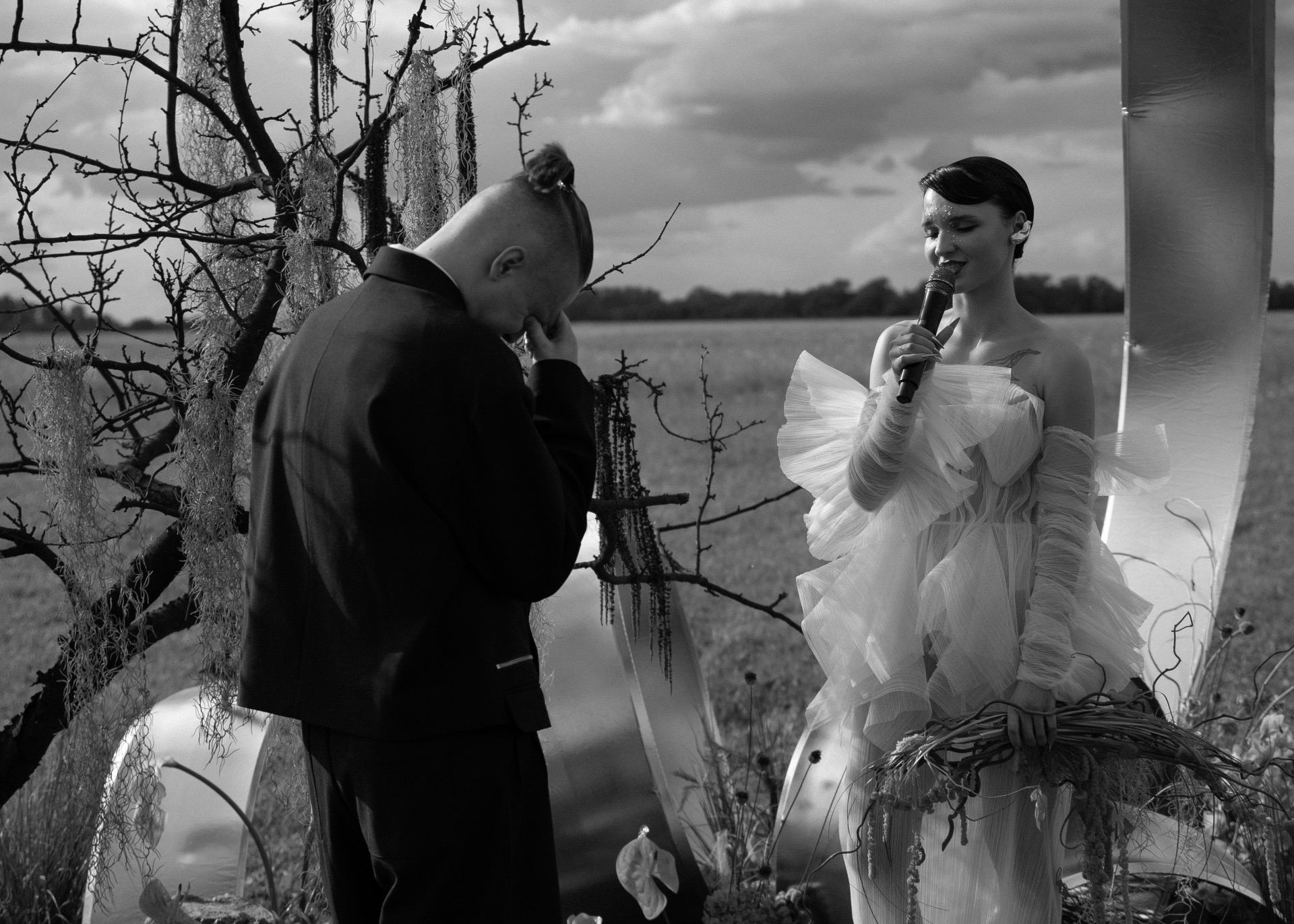 Дальше вечеринка сменила настроение с сентиментального на радостное. Мы создали свою маленькую вселенную в поле на этот день. И завершили наше торжество рейв-вечеринкой. Нам очень хотелось продолжить историю с концепцией торжества и сыграть на контрастах не только в декоре, но и в программе. Поэтому все гости нашего праздника участвовали в типичных конкурсах из 80-х.