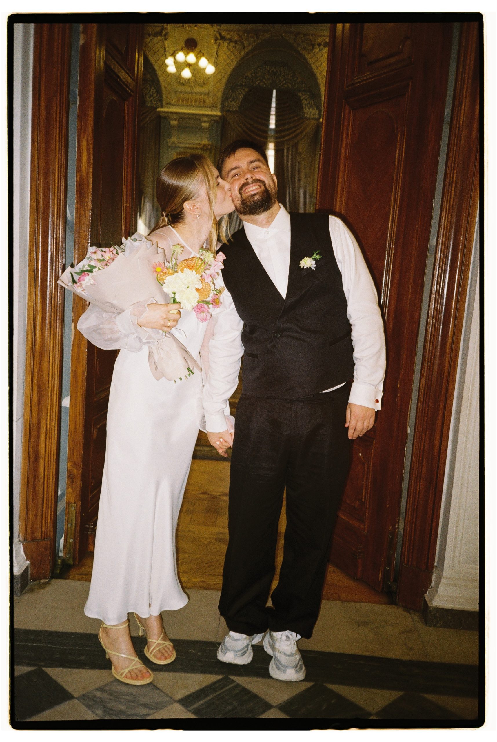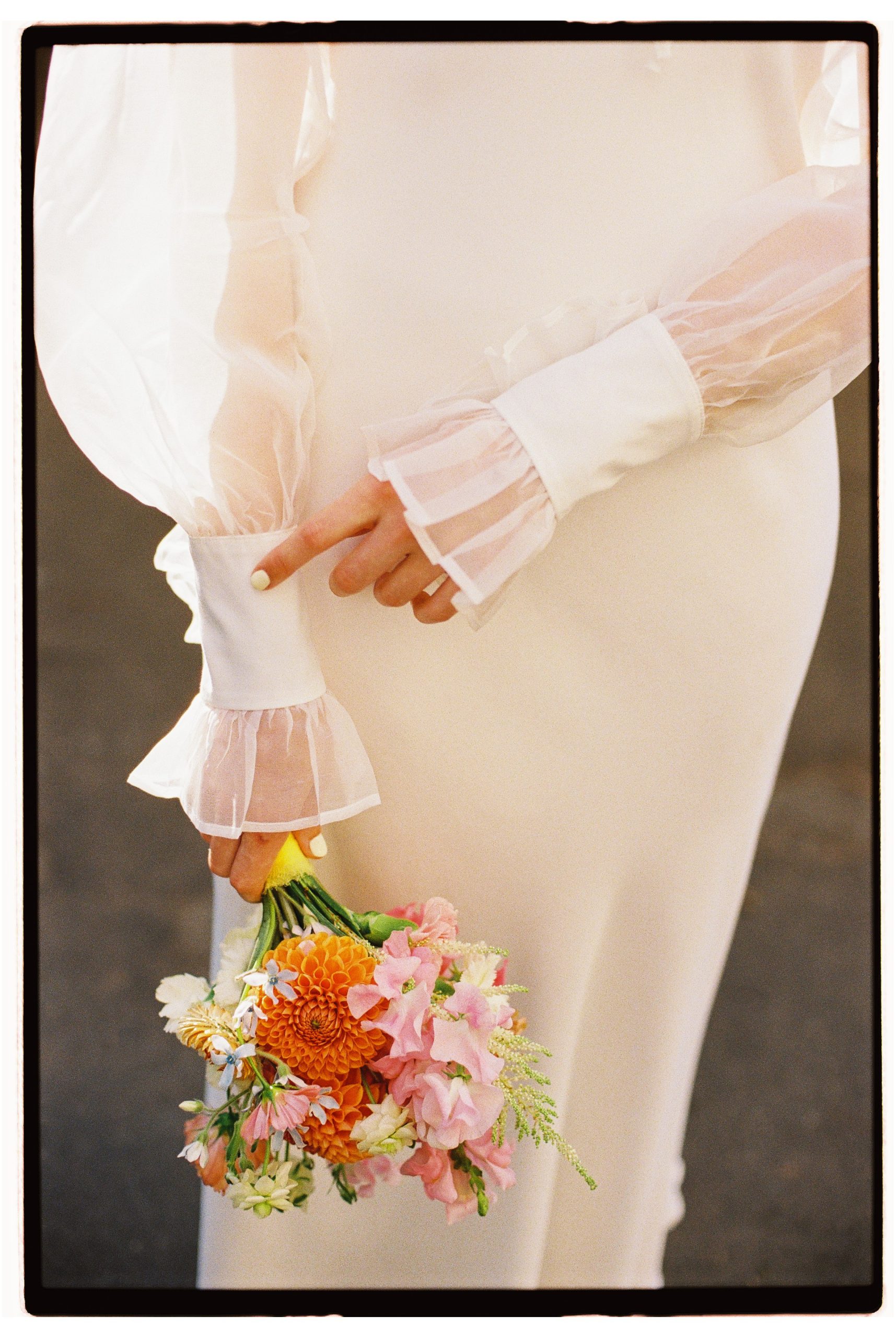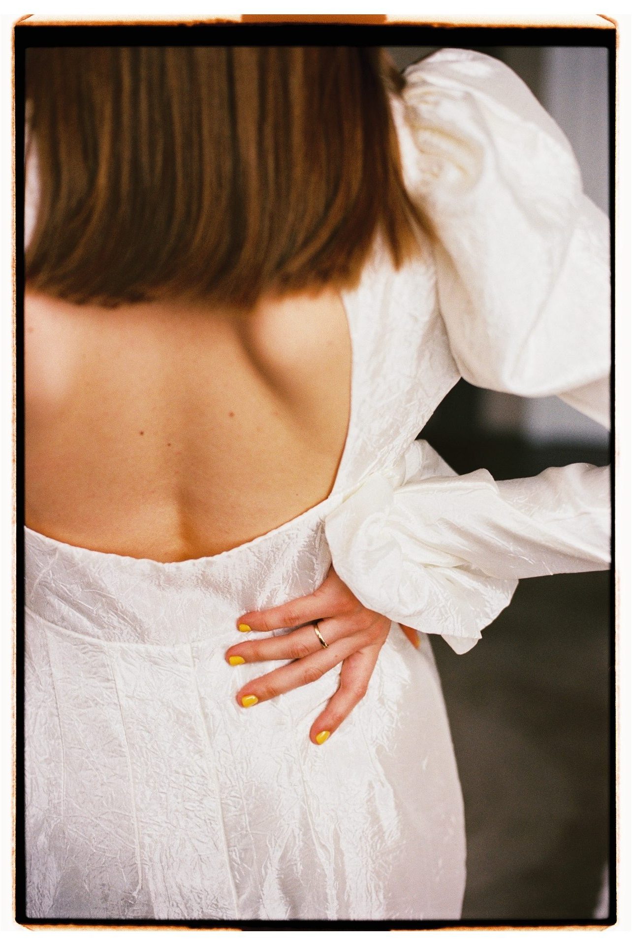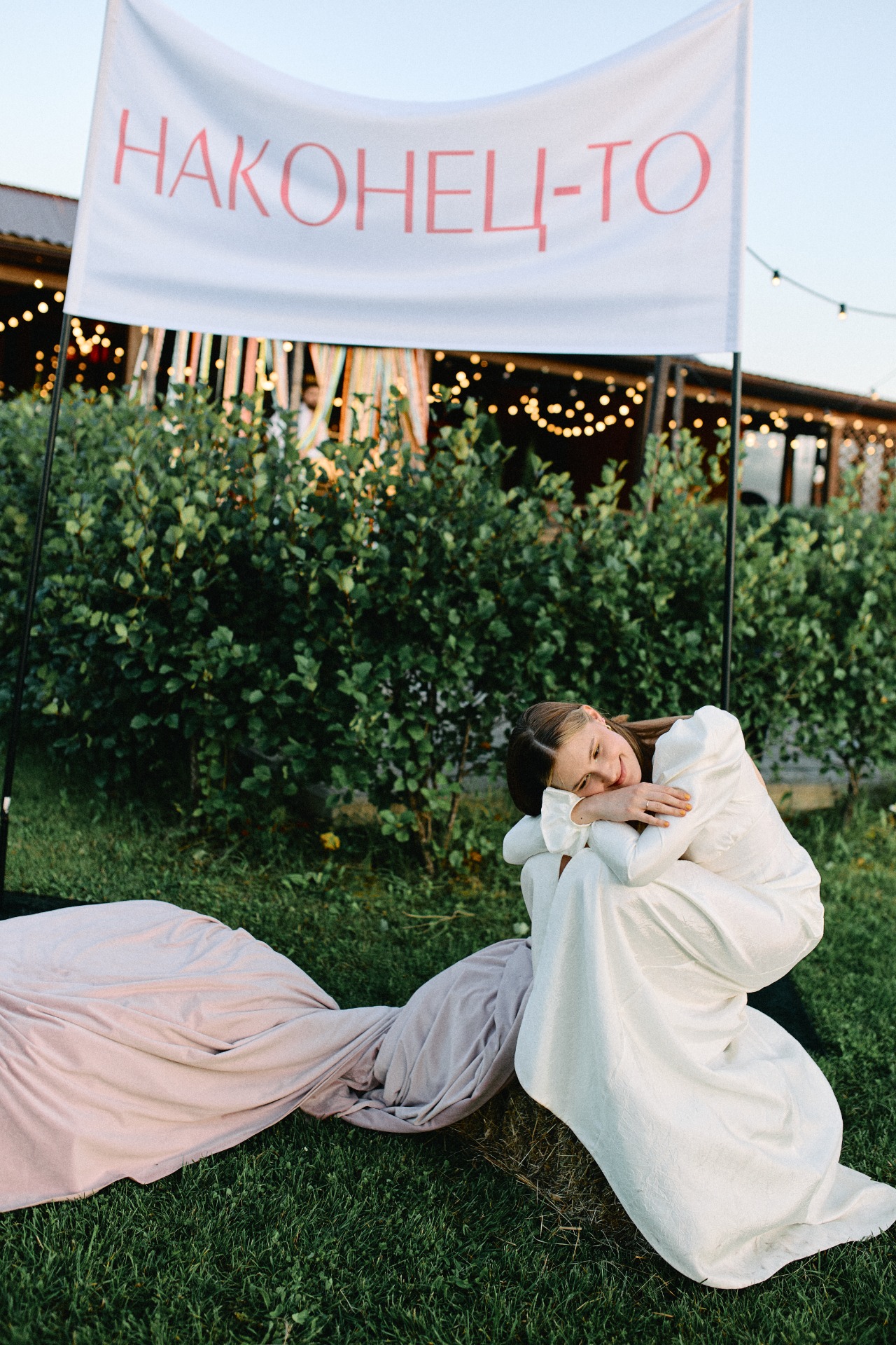 Я точно знала, что у меня будут два разных образа — для ЗАГСа и банкета, и оба я нашла в любимом Петербурге. Для ЗАГСа я выбрала платье-комбинацию и шёлковые рукава-болеро от бренда Le Pompon — этот образ идеально вписался в августовский петербургский день.