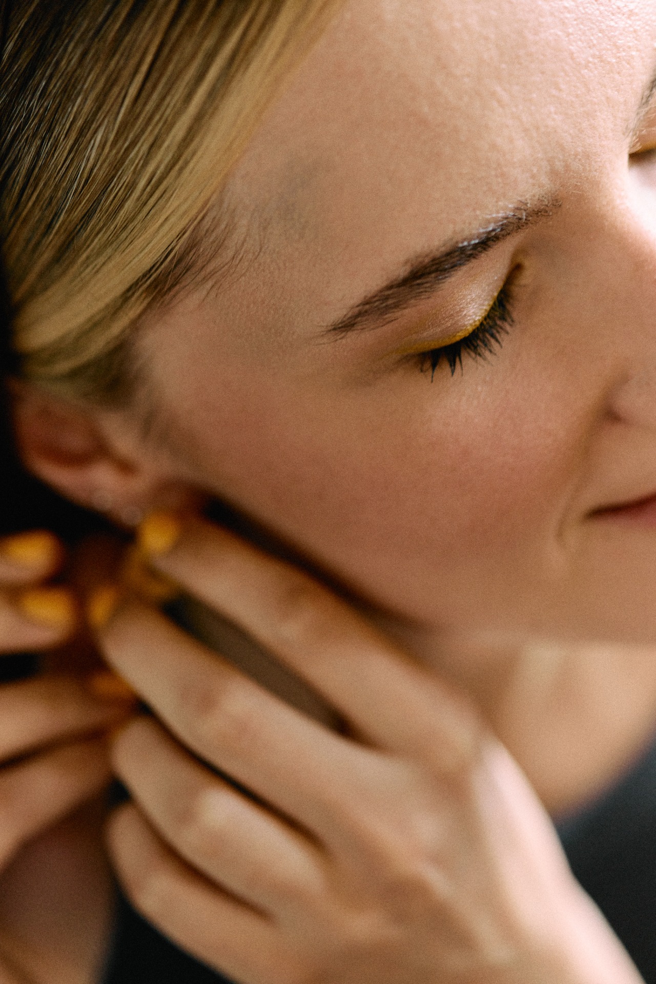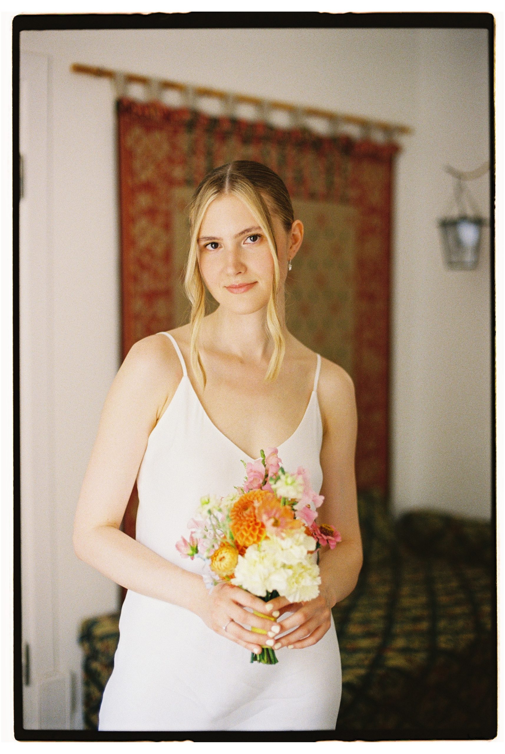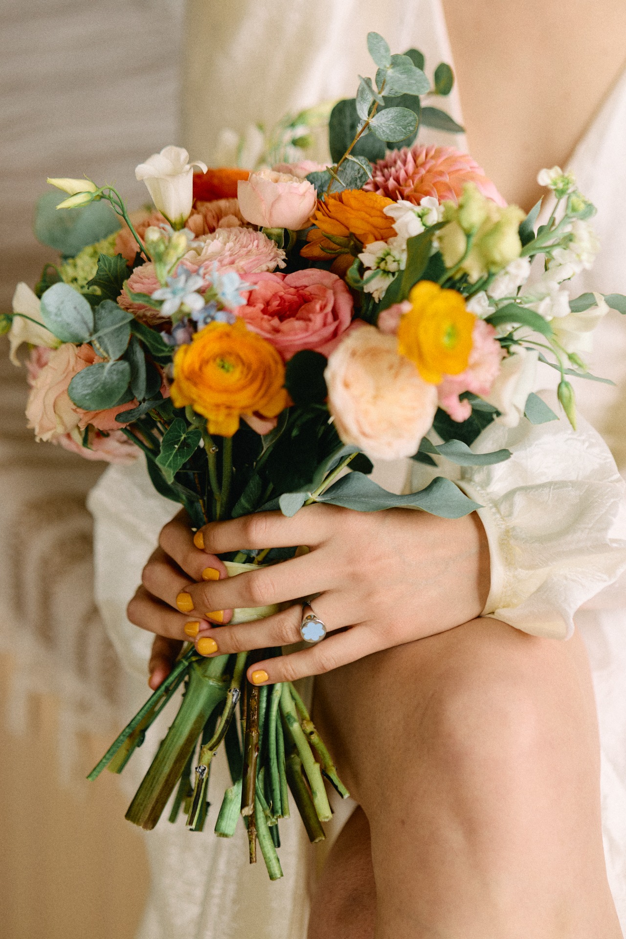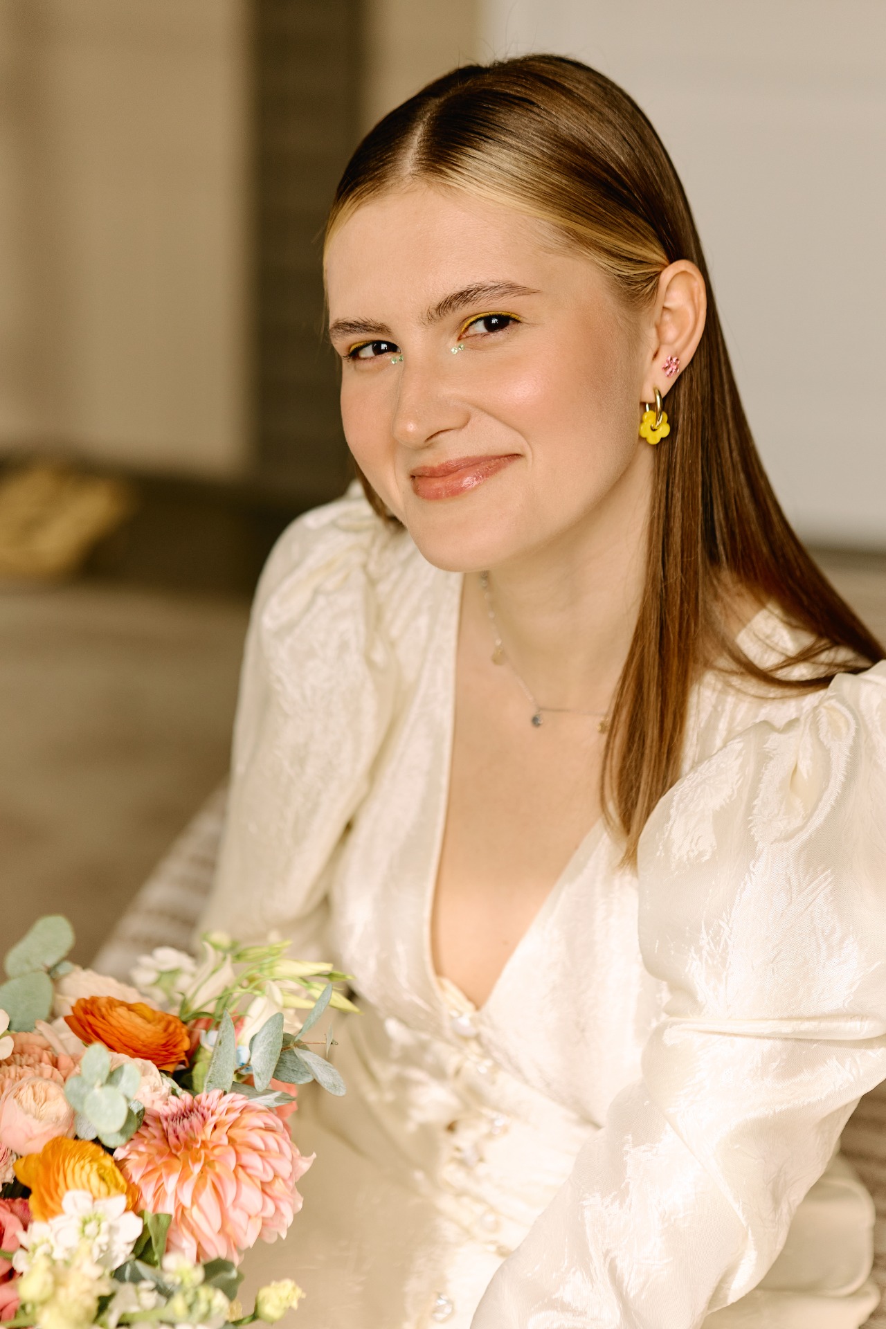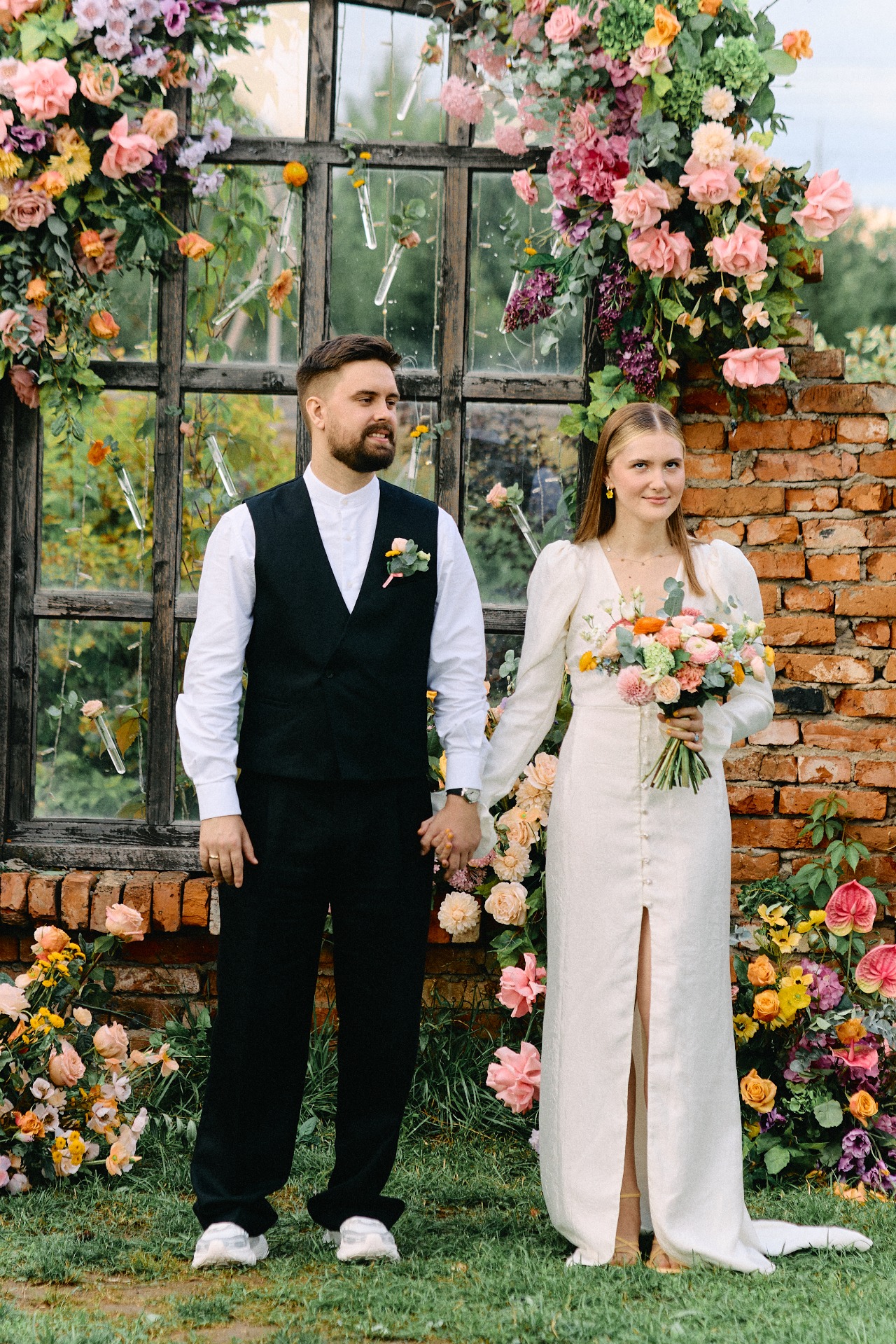 В качестве акцентов я хотела добавить яркие стрелки на глазах, яркие босоножки и яркий букет. Я очень долго искала оранжевые босоножки, но, как говорится, всё решил случай. В один день я примерила пару жёлтых туфель в «Эконике» и влюбилась.