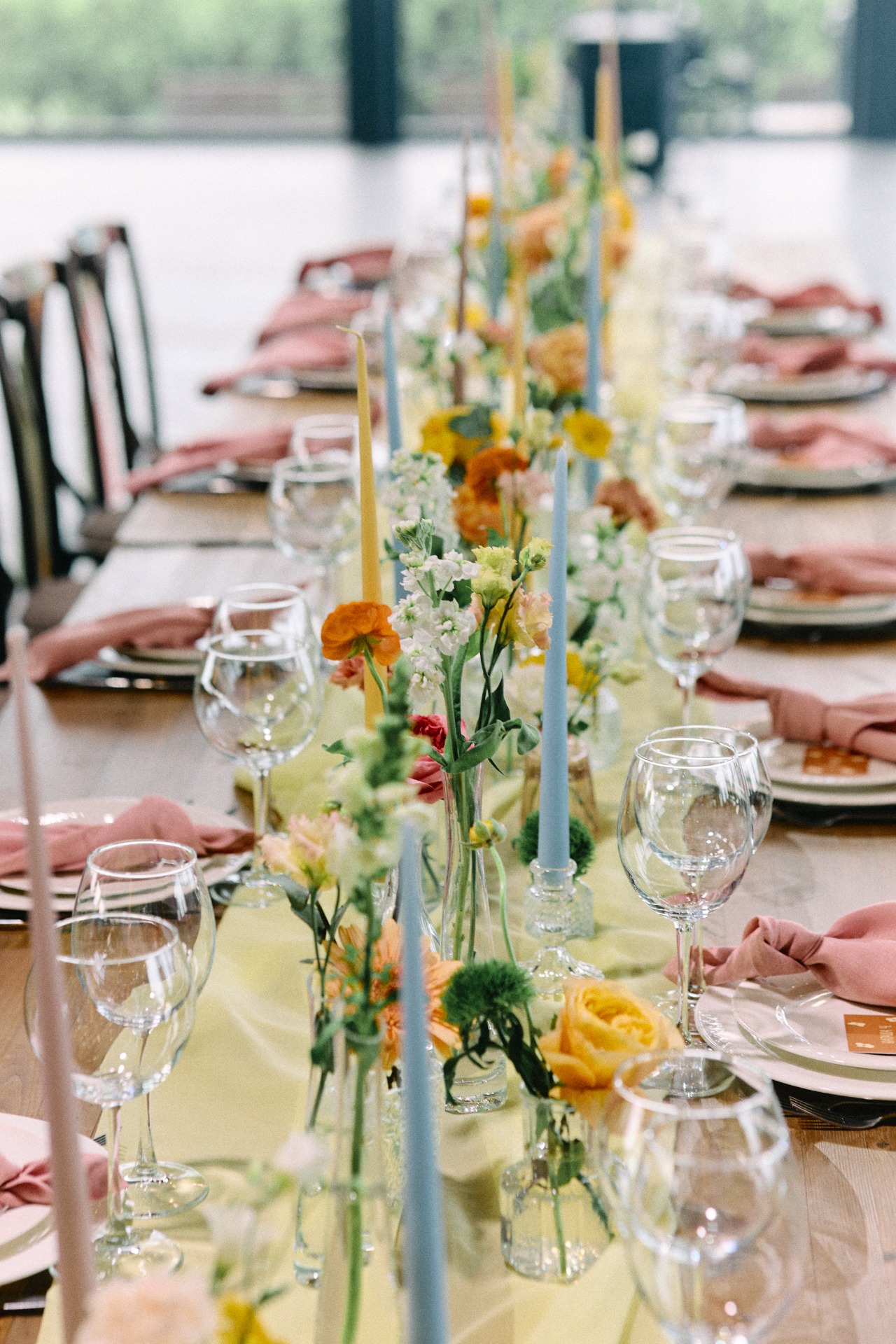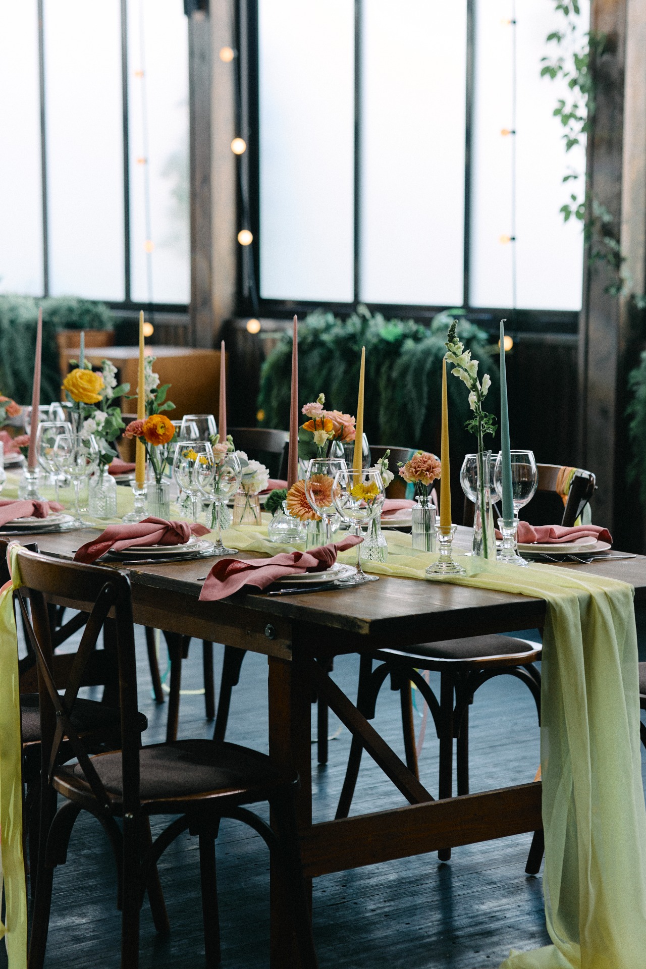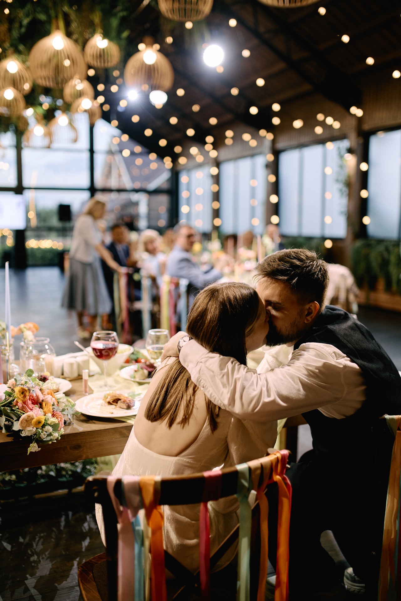 Детали декора мы собирали по частям, исходя из того, что точно хотелось бы видеть в наш день. Так как мы оба проводили все летние каникулы у бабушек в деревне, нам хотелось сохранить это камерное настроение с застольем из детства. Поэтому рассадку мы сделали «застольную» — с украшением свечами и вазочками с живыми цветами.