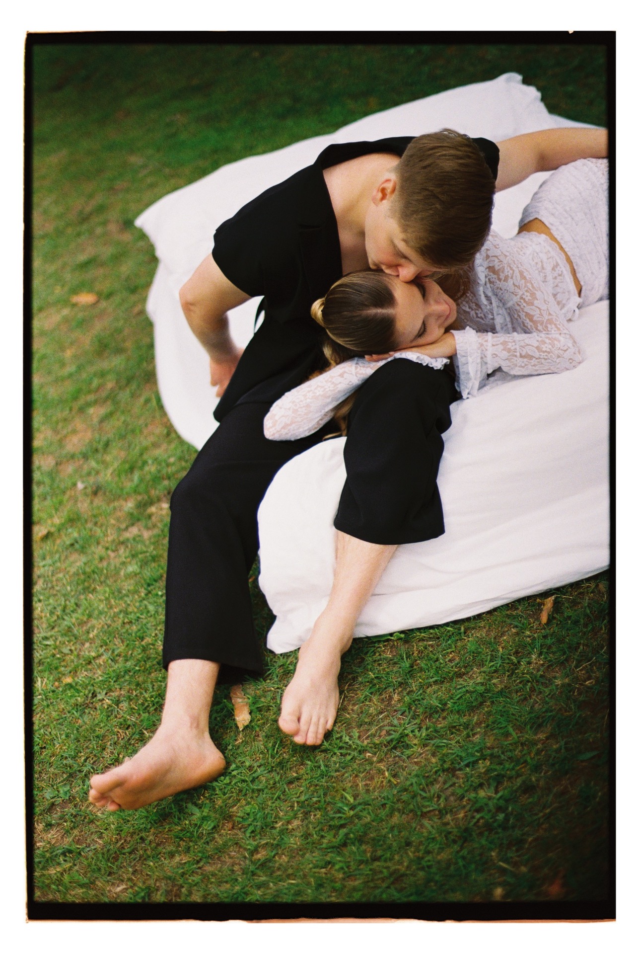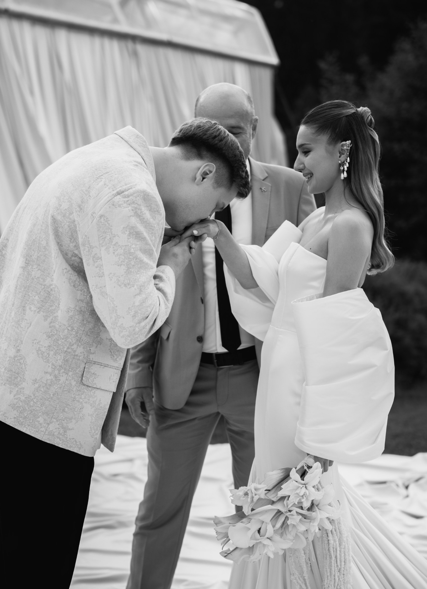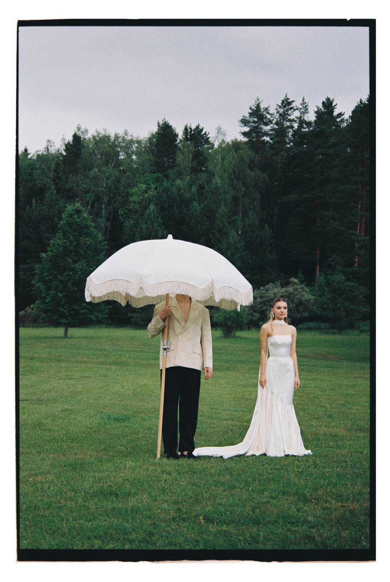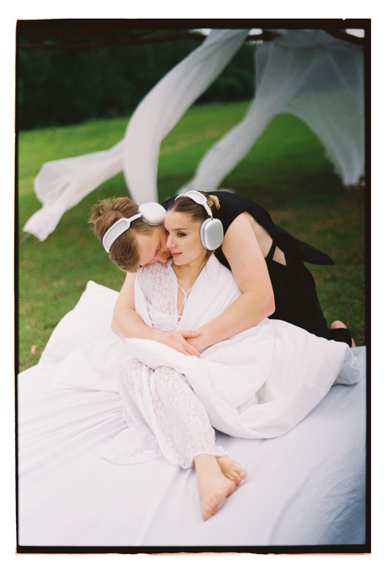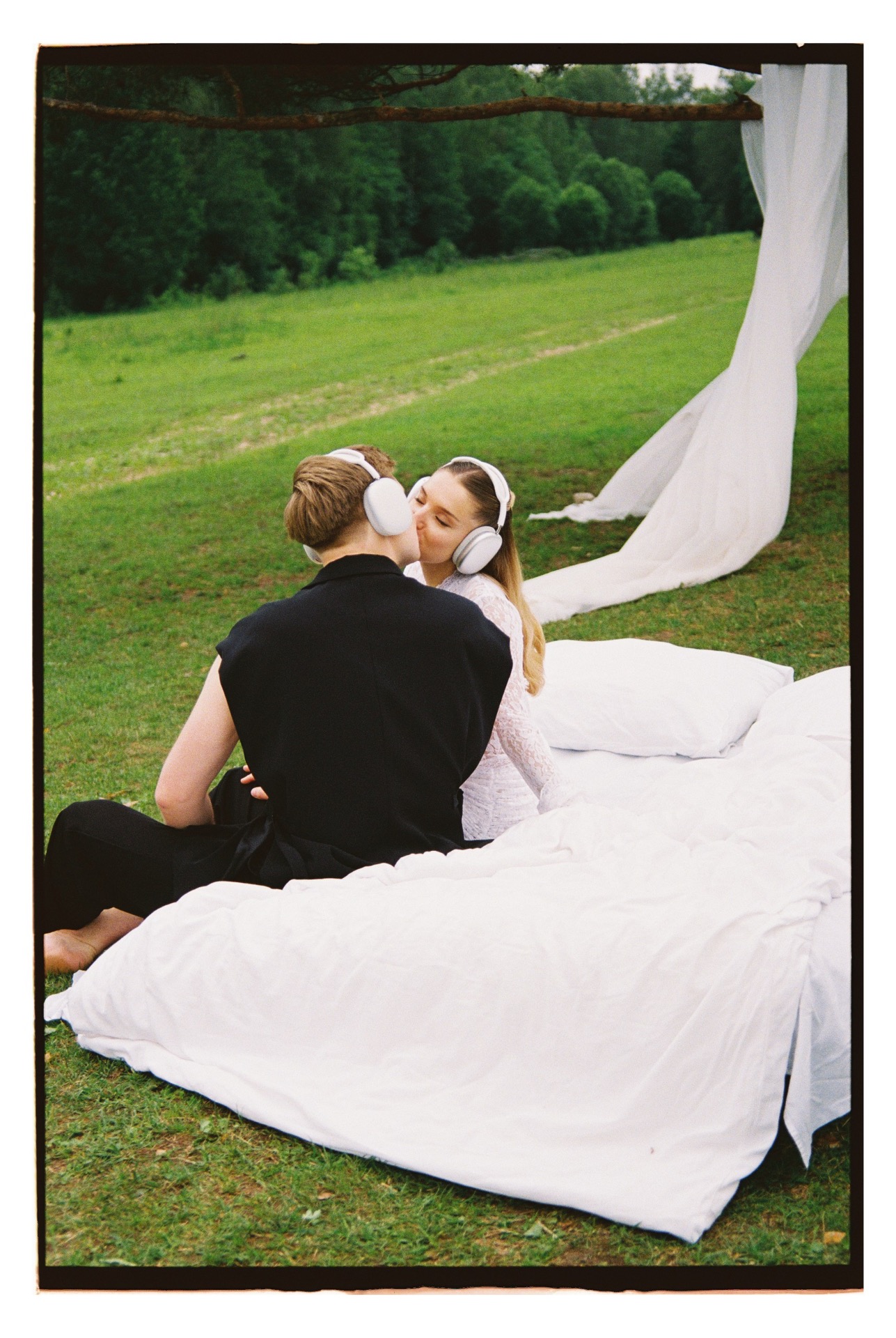 Утро жениха и невесты прошло на поляне под открытым небом. Они слушали музыку в белых AirPods Max и танцевали, каждый под свою любимую мелодию. У пары кардинально разные музыкальные вкусы, и это стало частью утренней фотосессии.
