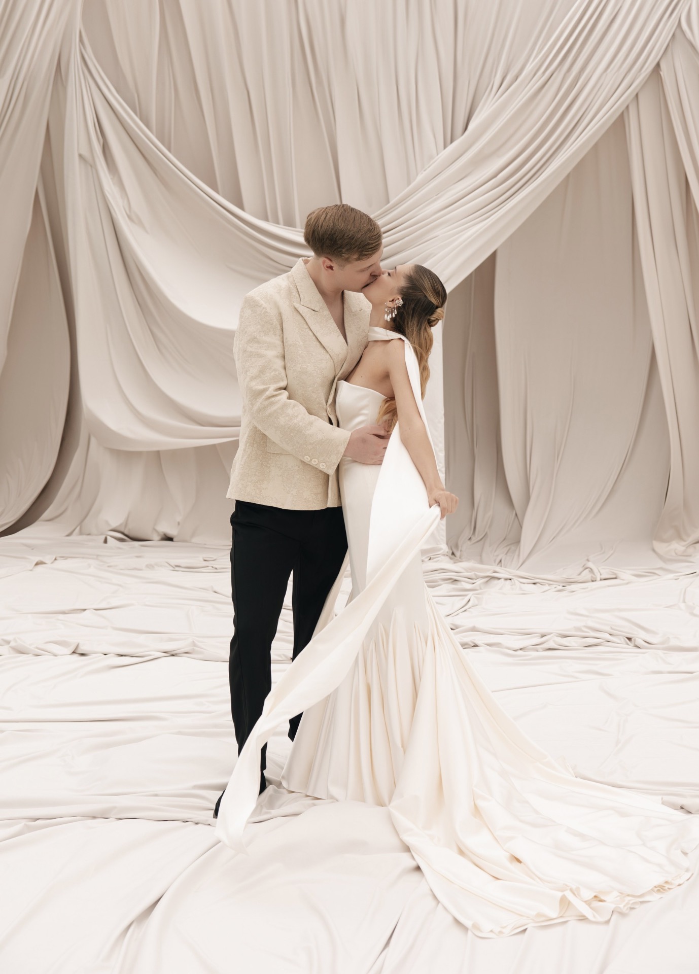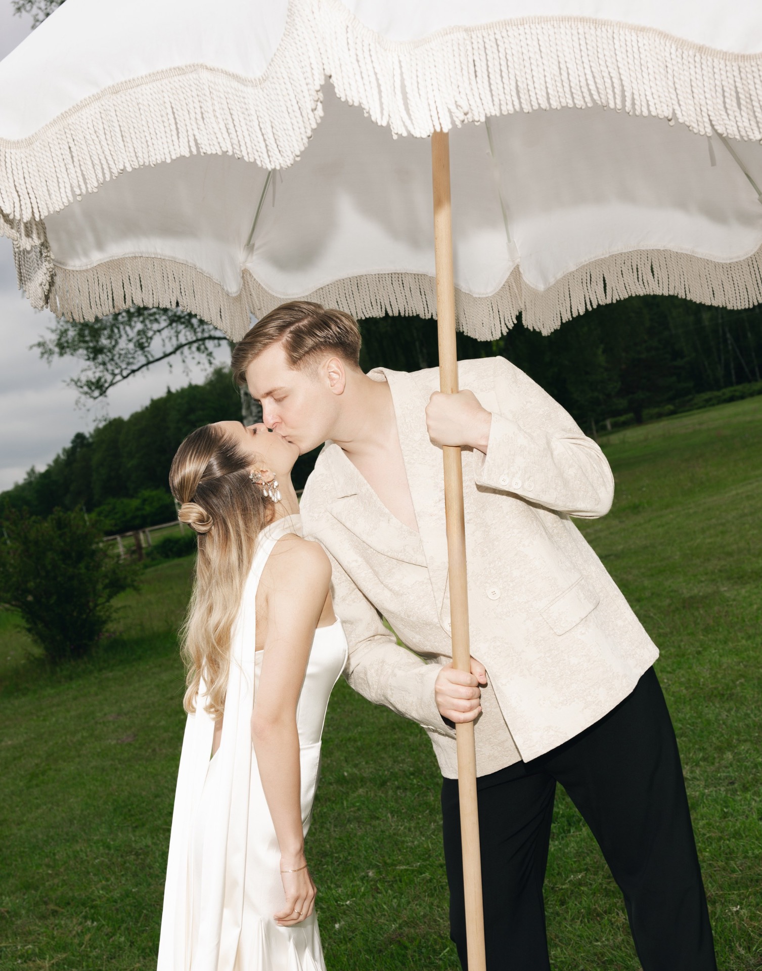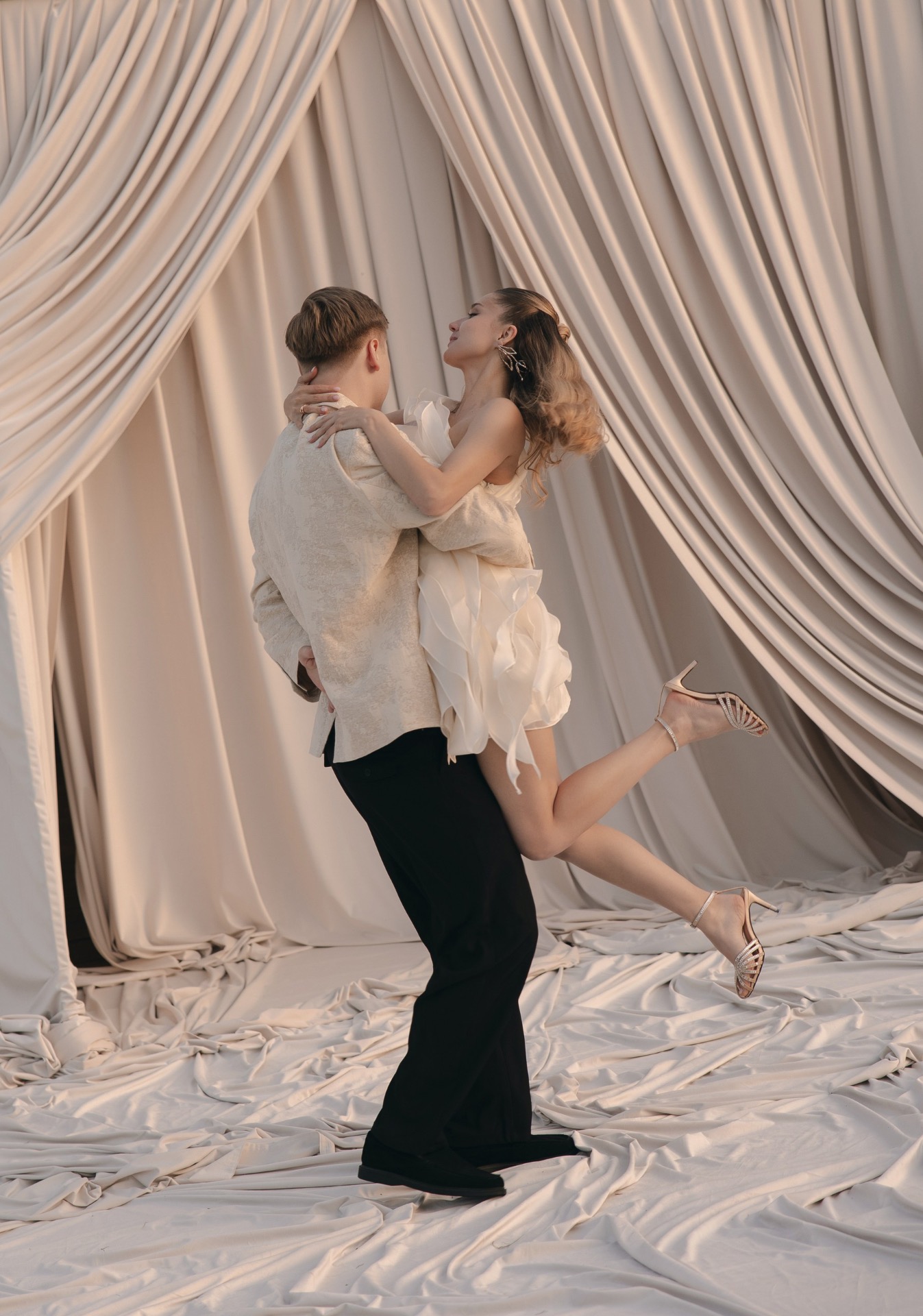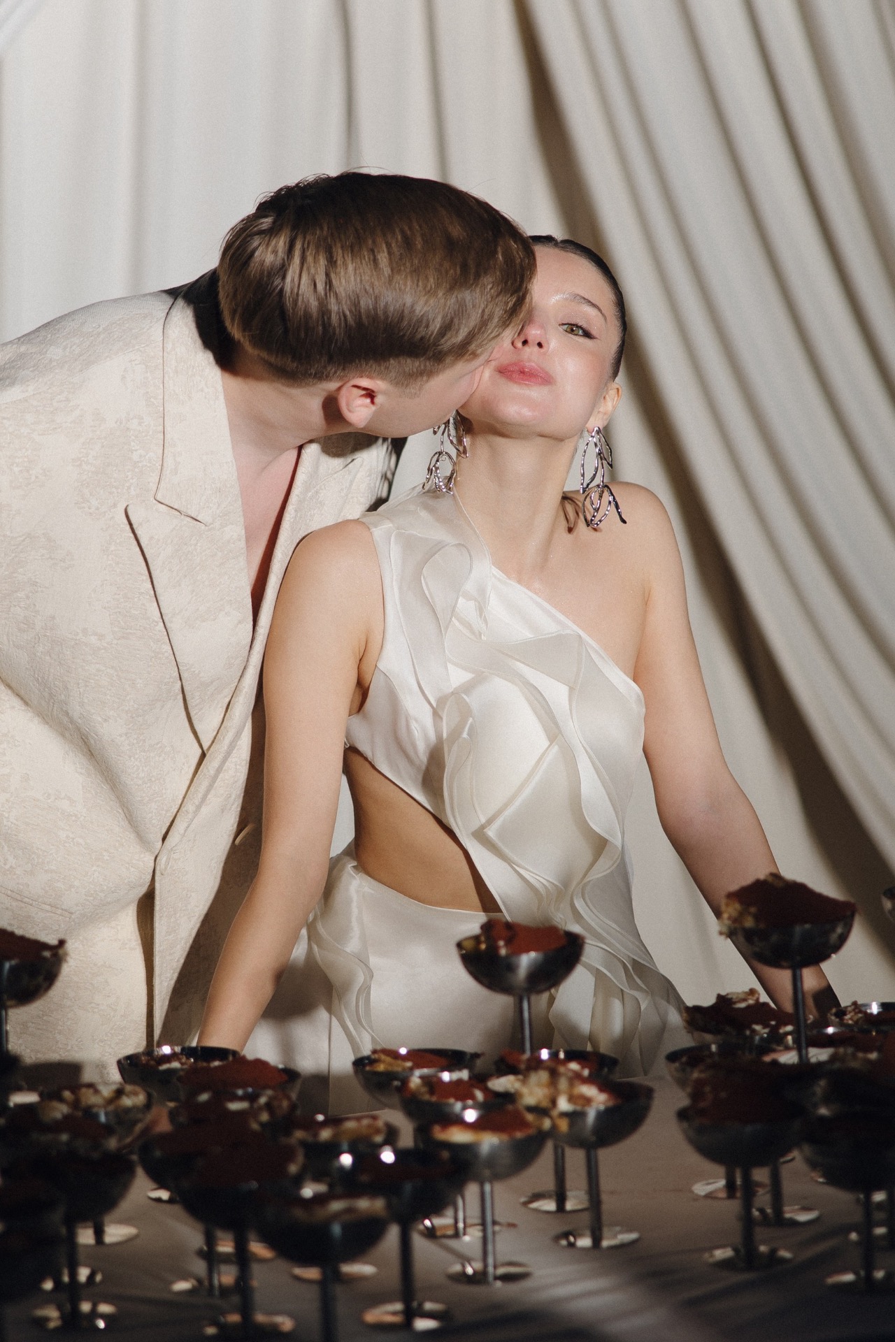 Утро жениха и невесты прошло на поляне под открытым небом. Они слушали музыку в белых AirPods Max и танцевали, каждый под свою любимую мелодию. У пары кардинально разные музыкальные вкусы, и это стало частью утренней фотосессии.