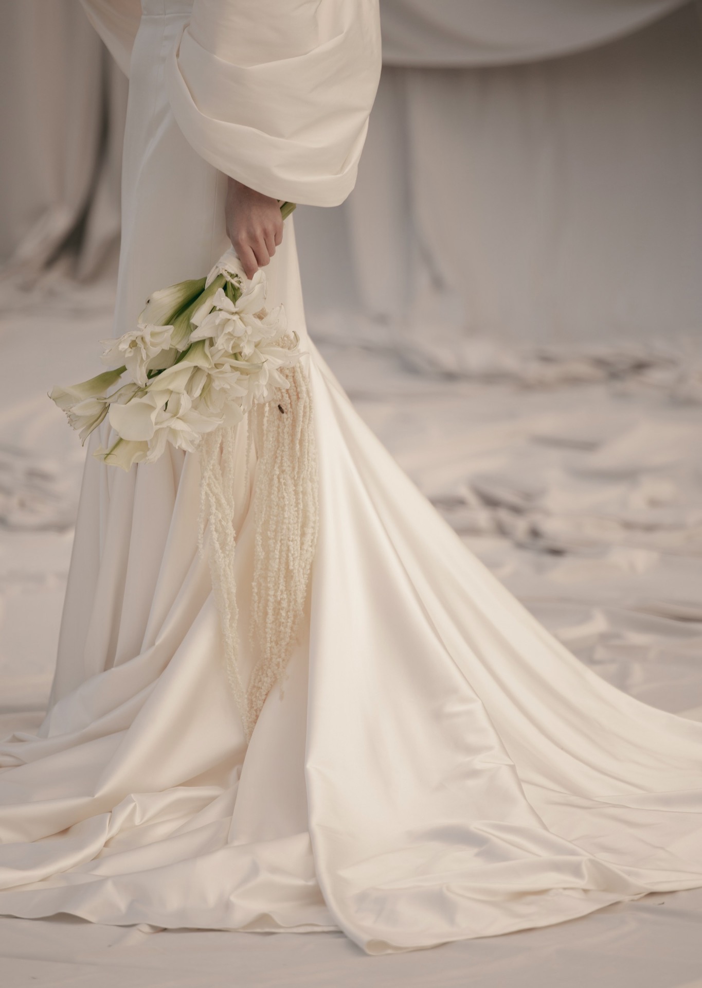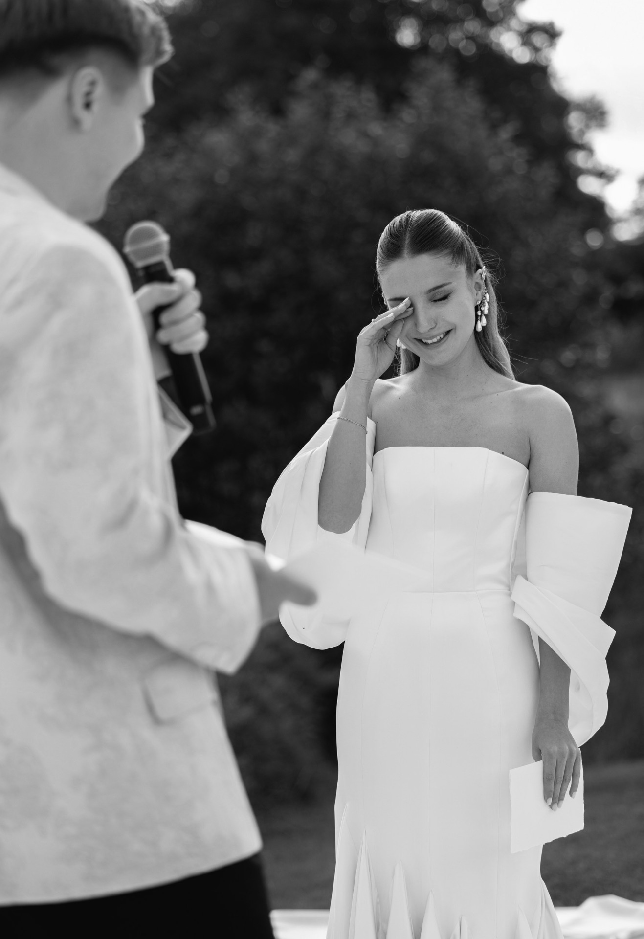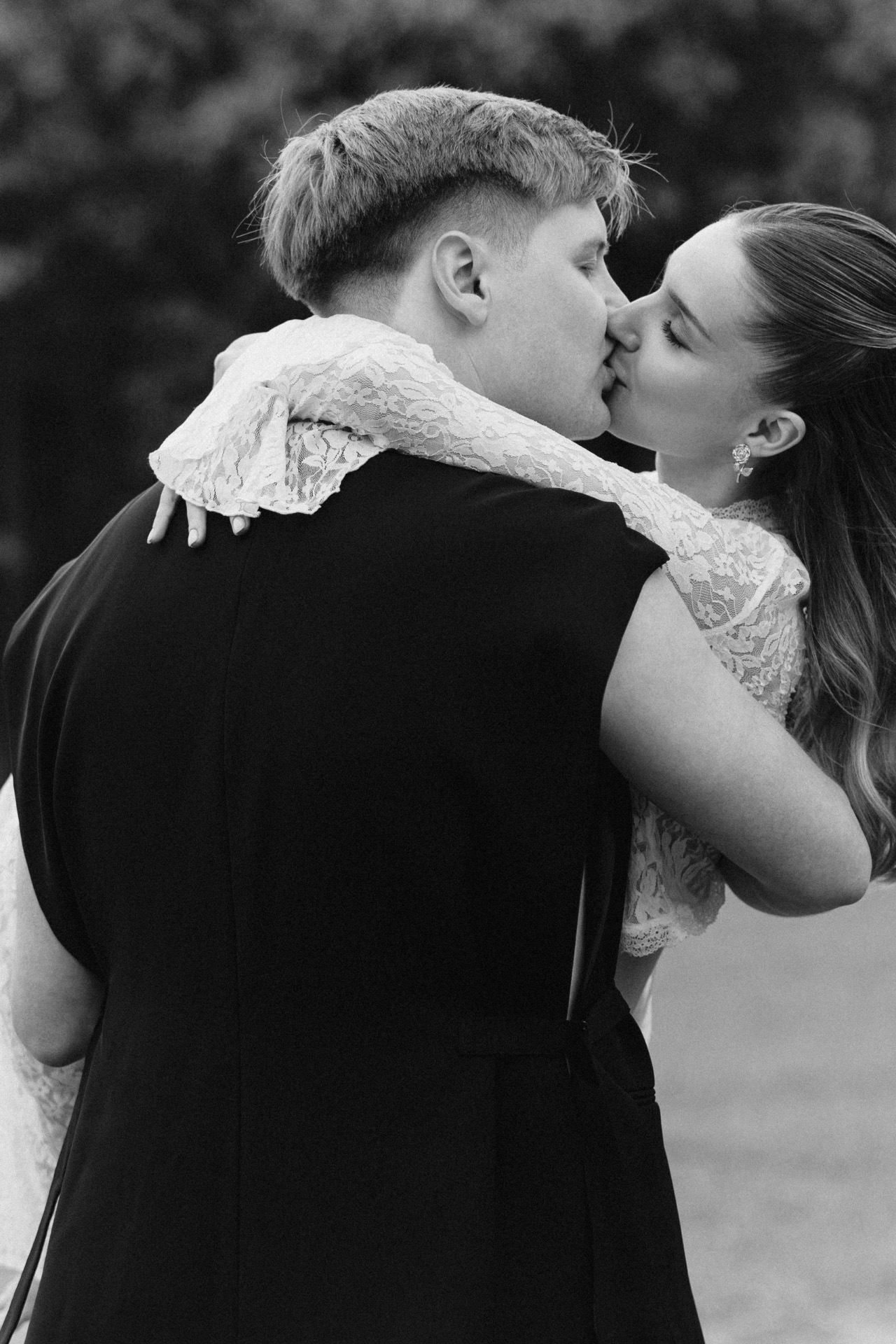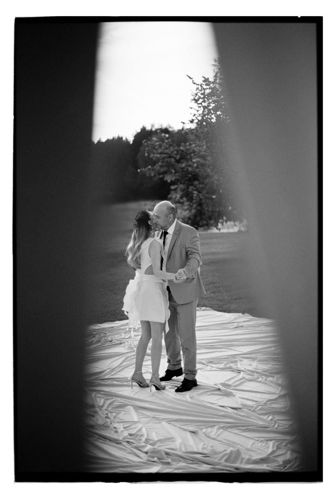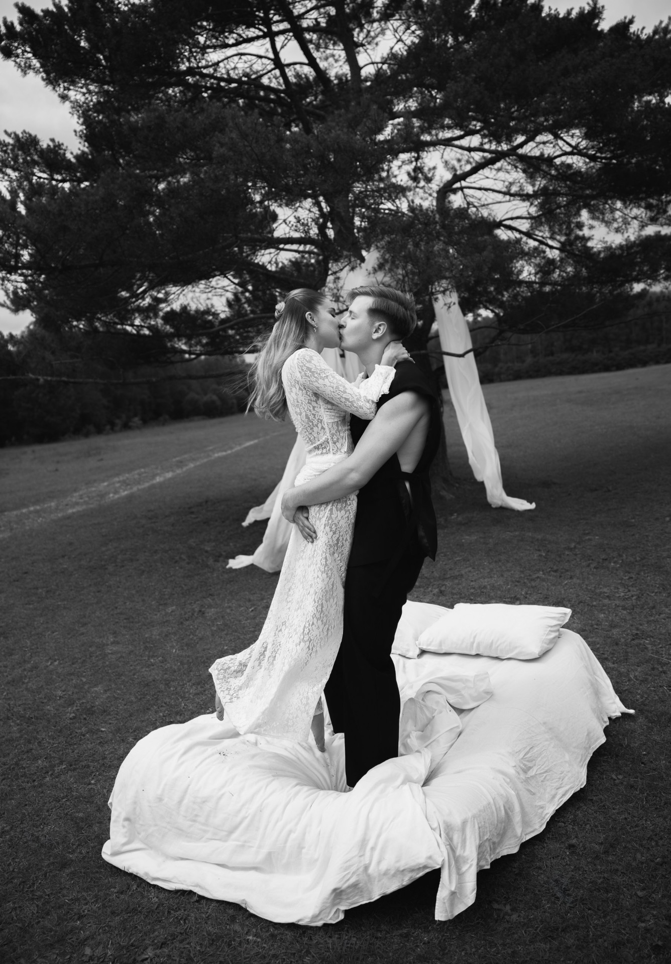 Утро жениха и невесты прошло на поляне под открытым небом. Они слушали музыку в белых AirPods Max и танцевали, каждый под свою любимую мелодию. У пары кардинально разные музыкальные вкусы, и это стало частью утренней фотосессии.
