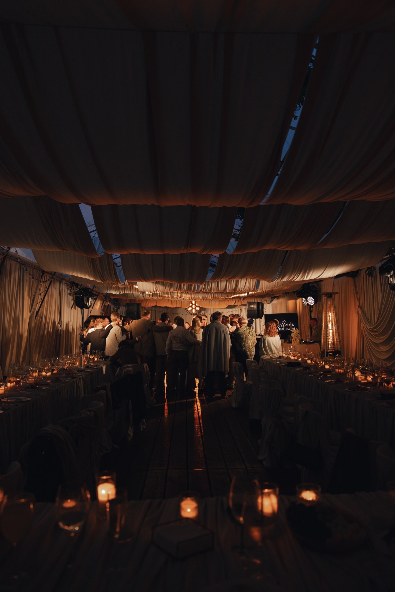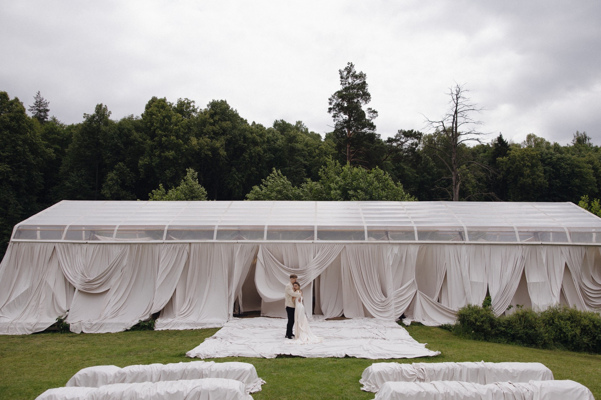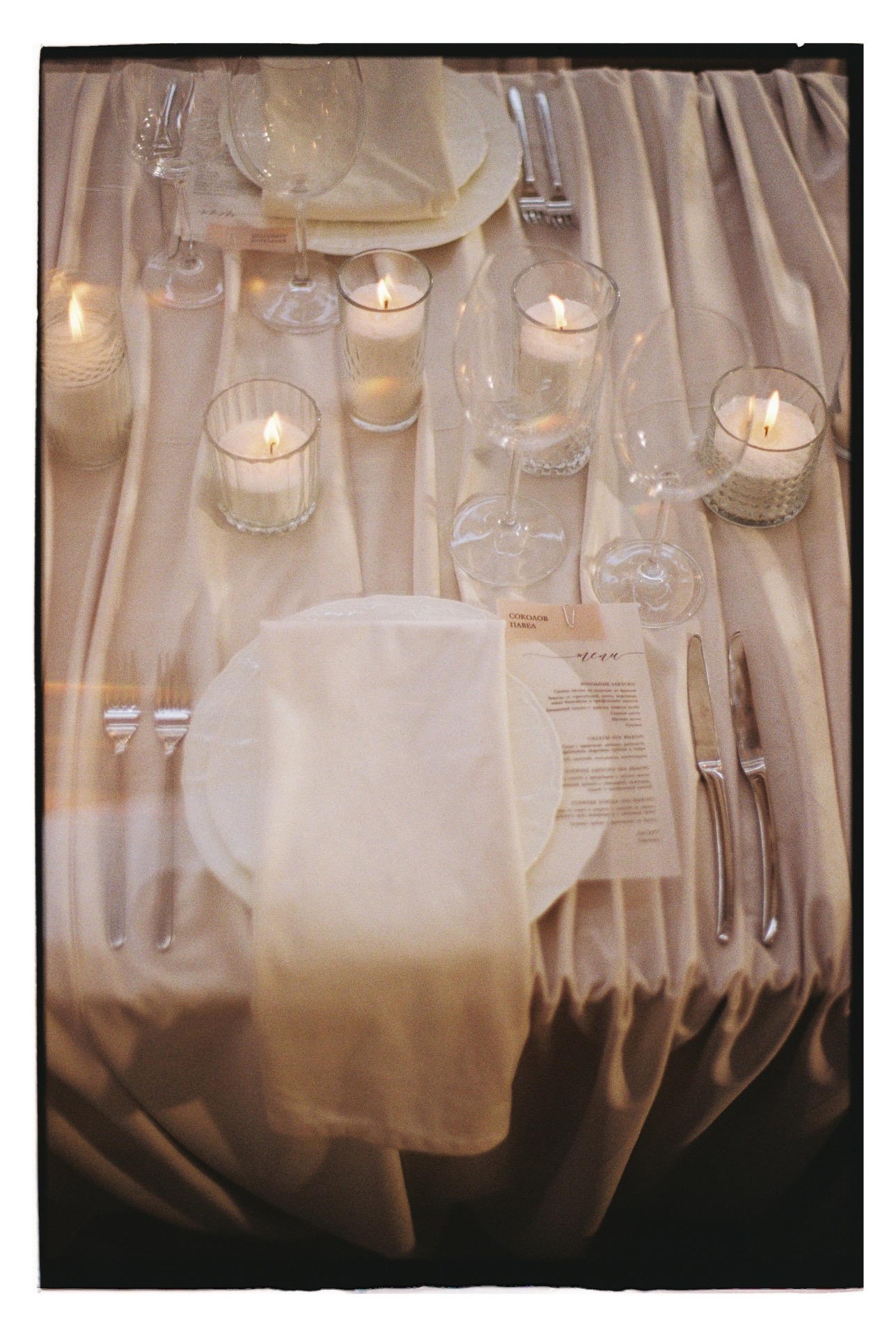 Церемония прошла на фоне задрапированной веранды: сливочный бархат и шифон — фишка оформления, которой раньше на площадке не было. Так как свадьба проходила на ферме, гостей рассаживали на тюках сена, обтянутых бархатом. Это создавало атмосферу элегантности. В декоре пара отказалась от цветов, за исключением букета невесты. Всё строилось на тканях и свете свечей.