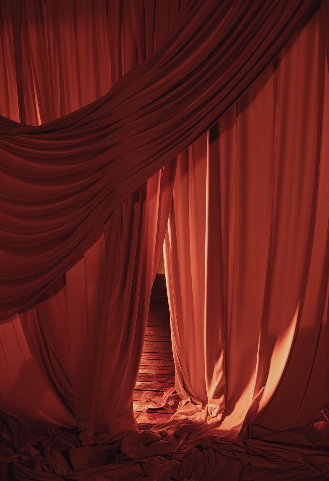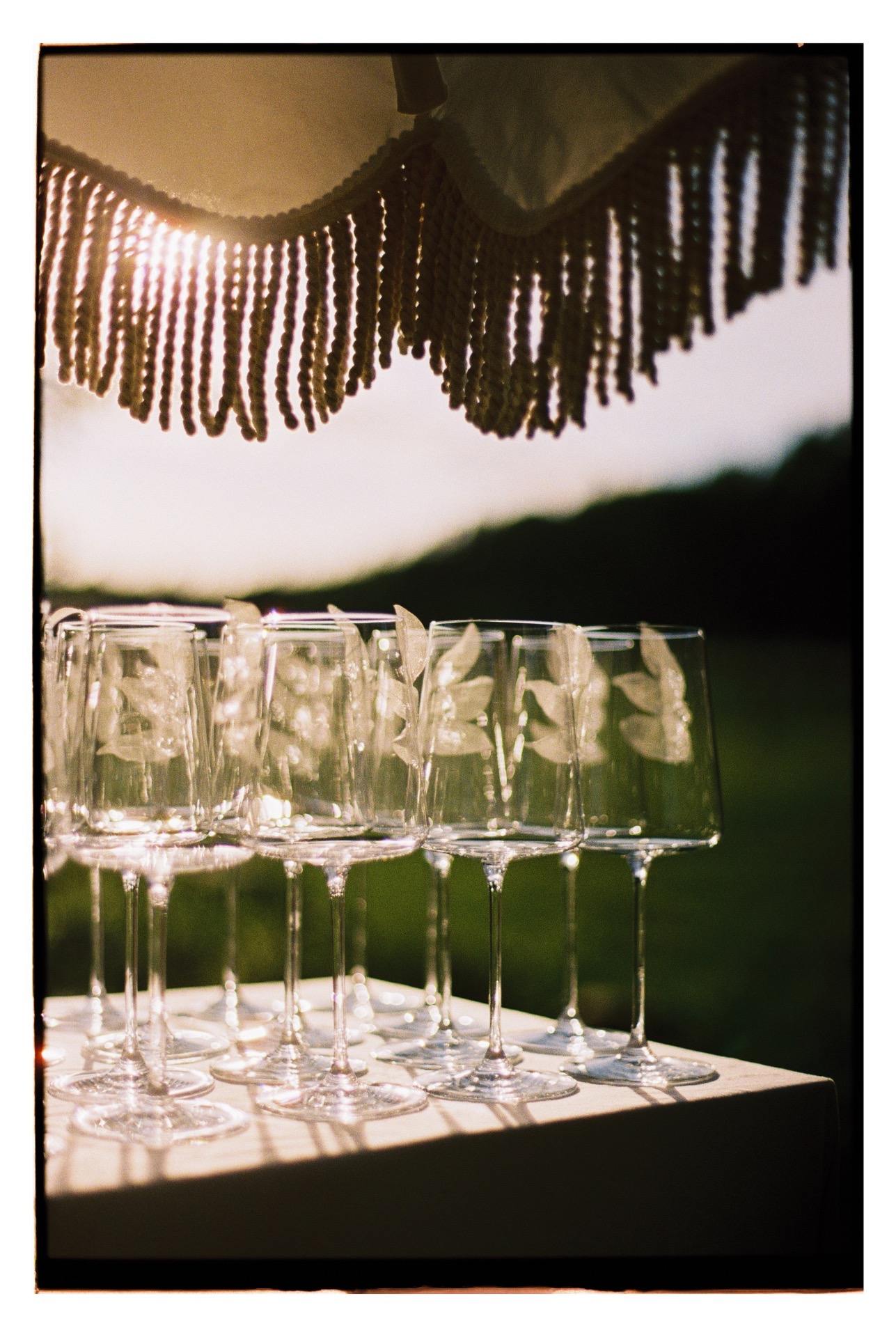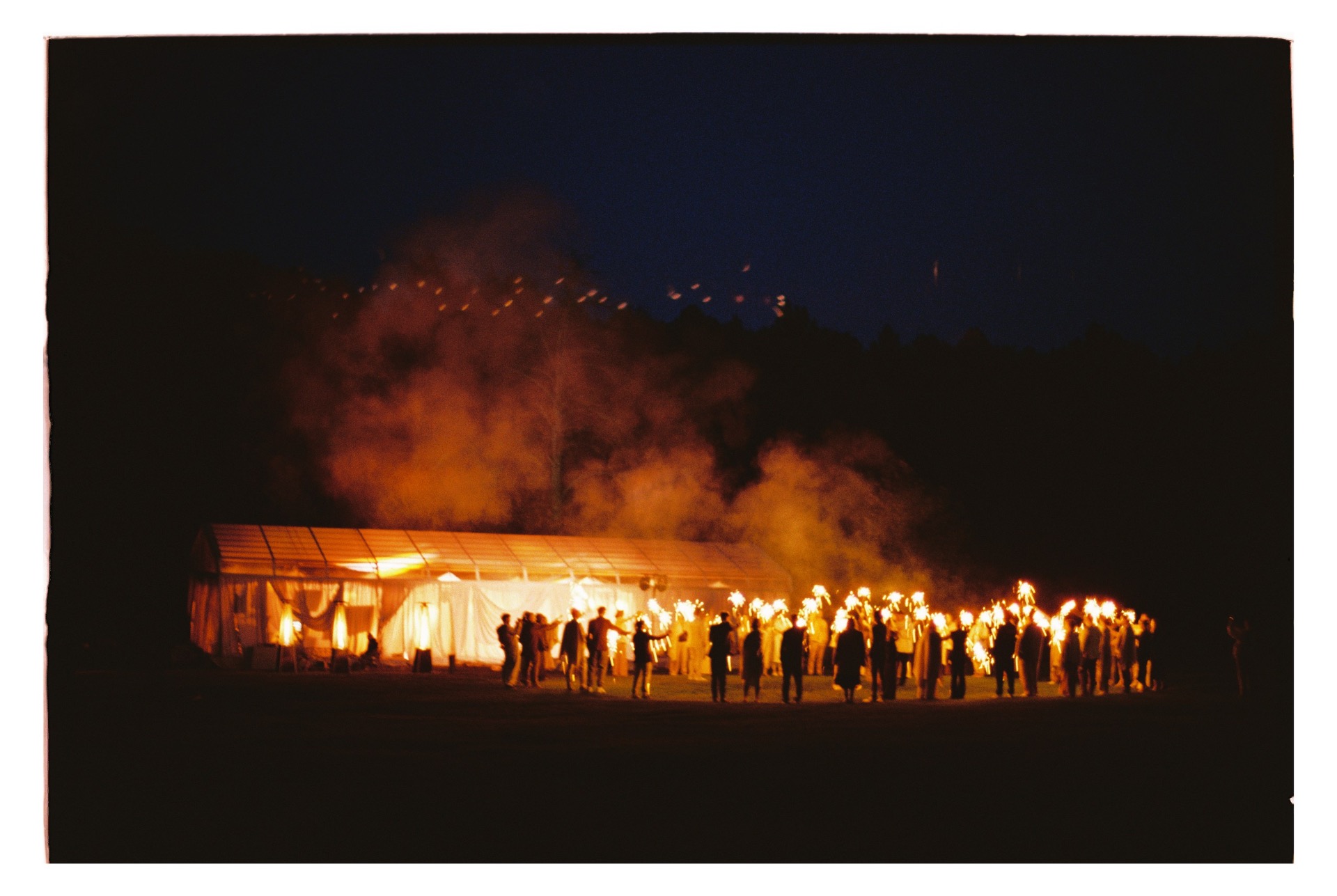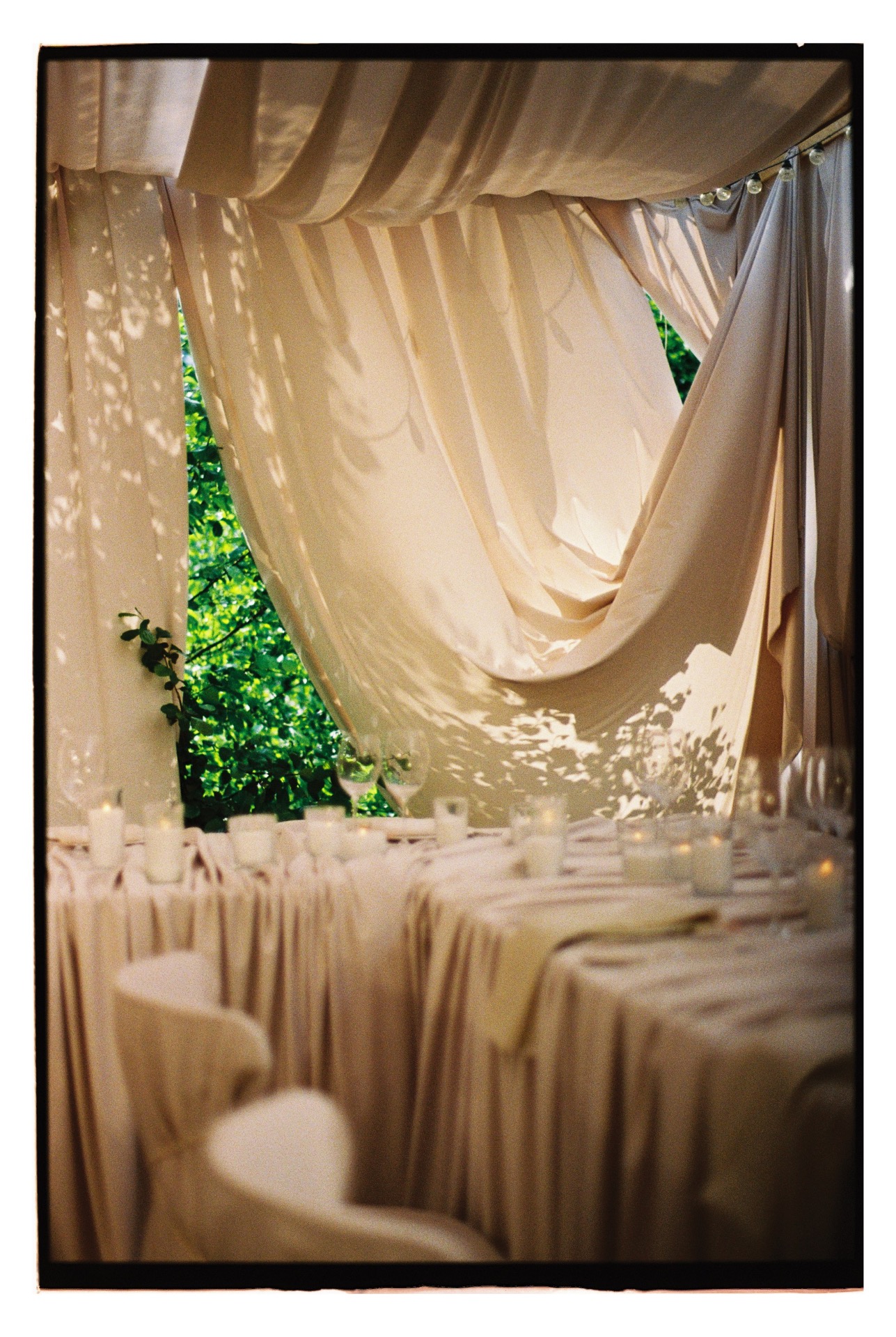 Церемония прошла на фоне задрапированной веранды: сливочный бархат и шифон — фишка оформления, которой раньше на площадке не было. Так как свадьба проходила на ферме, гостей рассаживали на тюках сена, обтянутых бархатом. Это создавало атмосферу элегантности. В декоре пара отказалась от цветов, за исключением букета невесты. Всё строилось на тканях и свете свечей.
