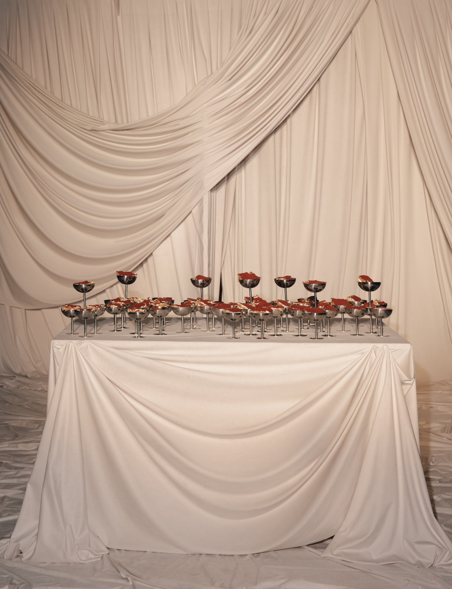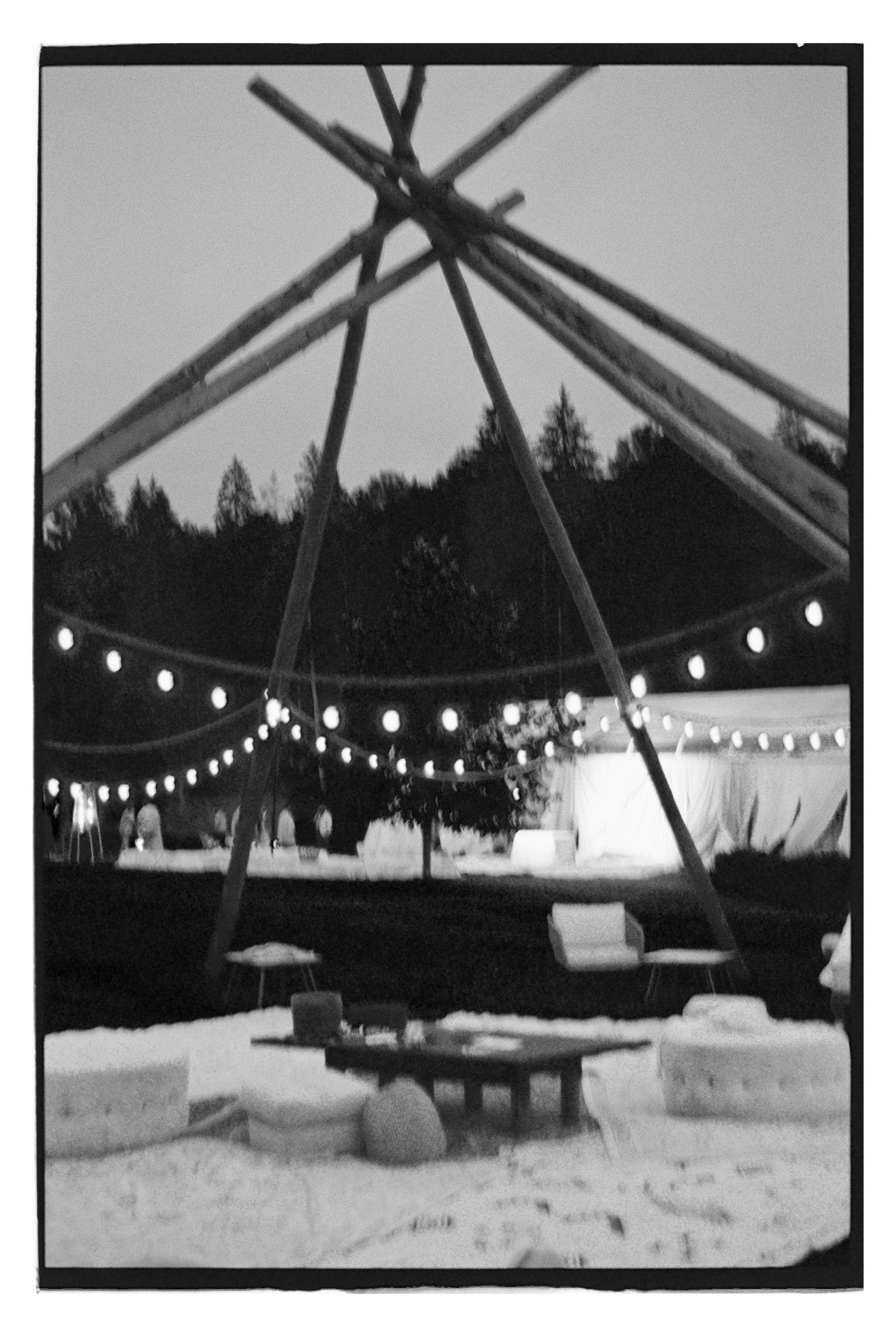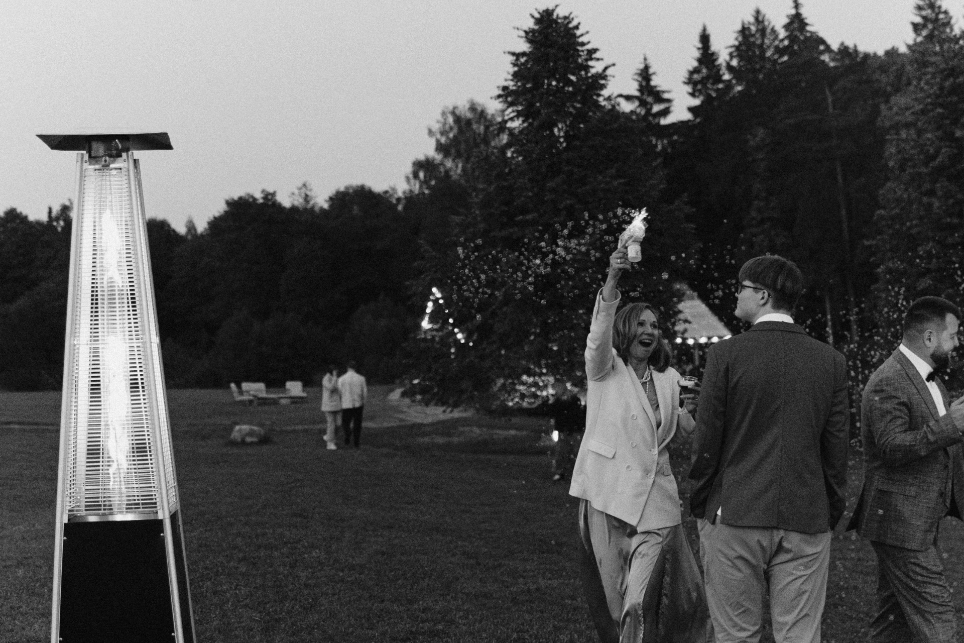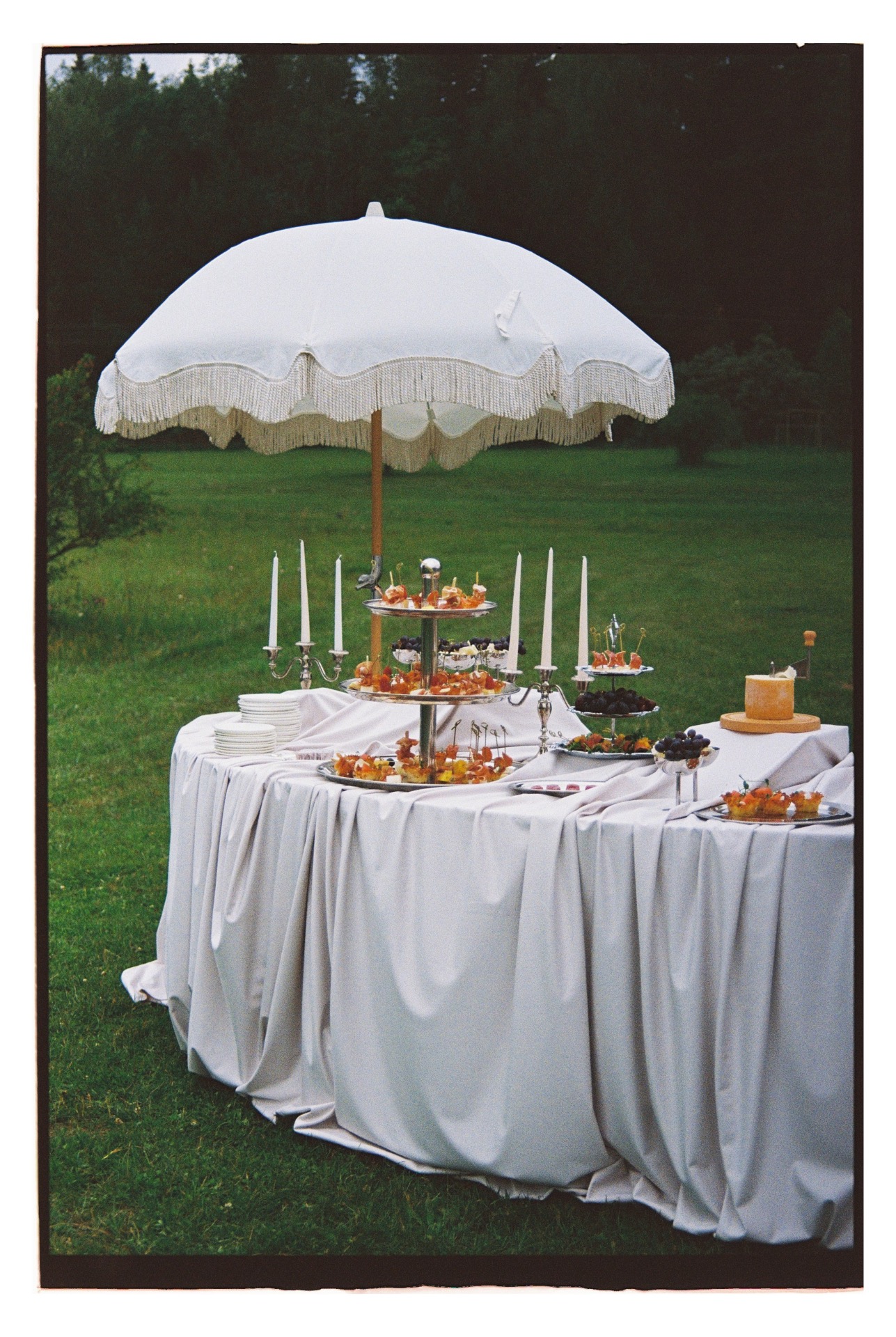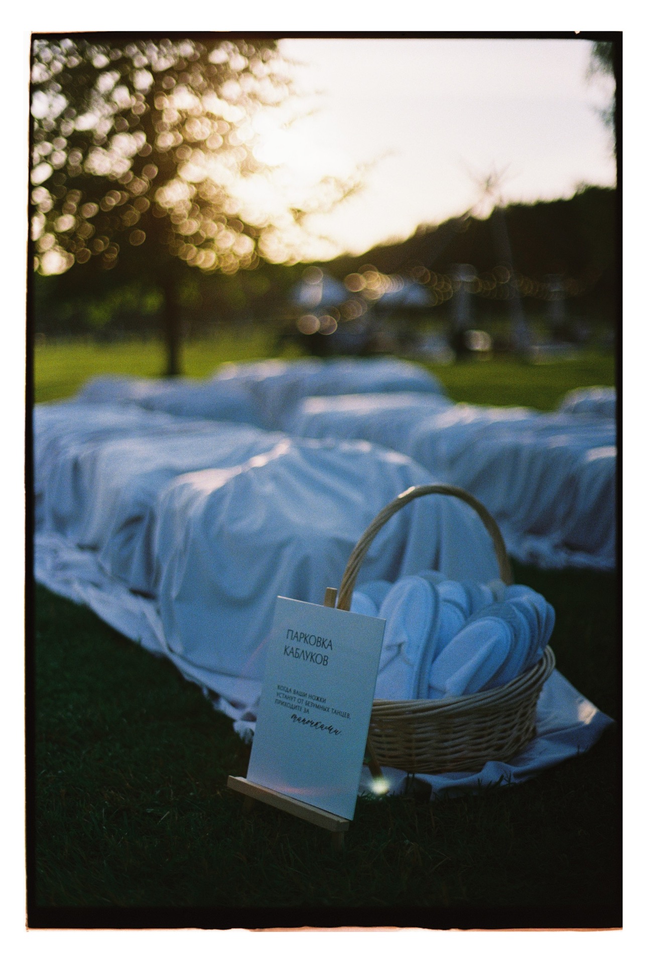 Сбор гостей прошёл на просторной поляне — это стало изюминкой площадки. Особым акцентом стал фуршетный стол в форме дуги, накрытый бархатной скатертью, с закусками и напитками, гармонично вписанными в винтажный сет-дизайн. Для комфорта гостей создали несколько лаунж-зон, где можно было отдохнуть в ожидании церемонии.